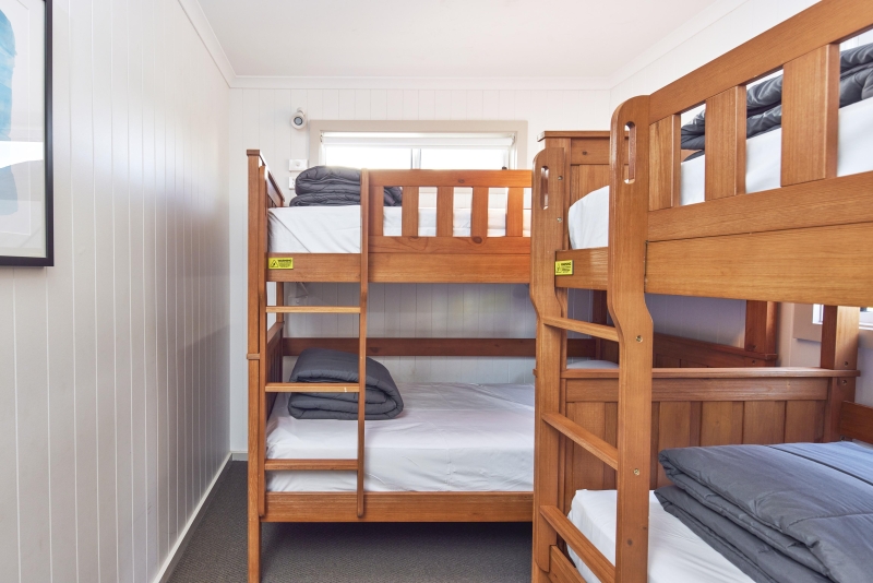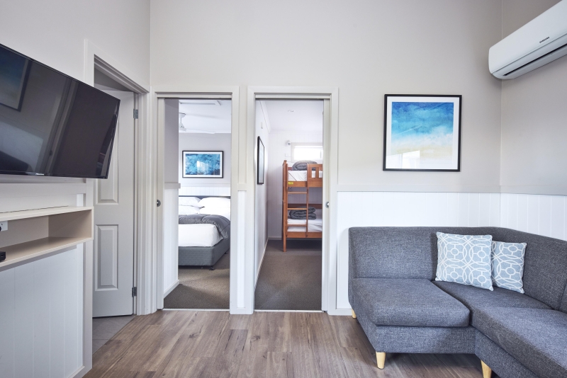 Spacious cabin sleeping up to 6. Two bedrooms. One queen and two single bunks. Features air-conditioning; kitchen including microwave and fridge; full bathroom; dining setting and lounge with TV and DVD.
