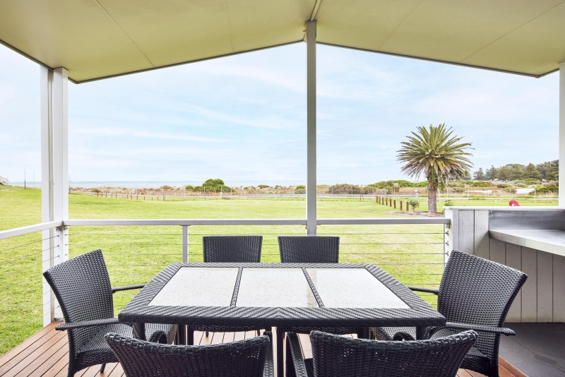 Located overlooking the bay. Three bedrooms. One queen, two singles and one single bunk. Features air-conditioning; kitchen including dishwasher, fridge, convection microwave and stovetop; full bathroom; private veranda with barbecue; dining setting and lounge with TV, DVD.