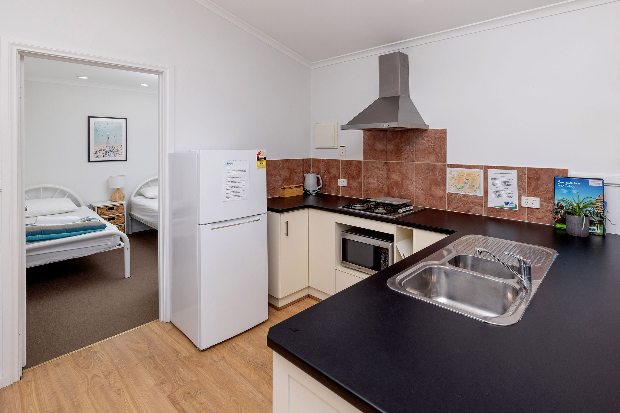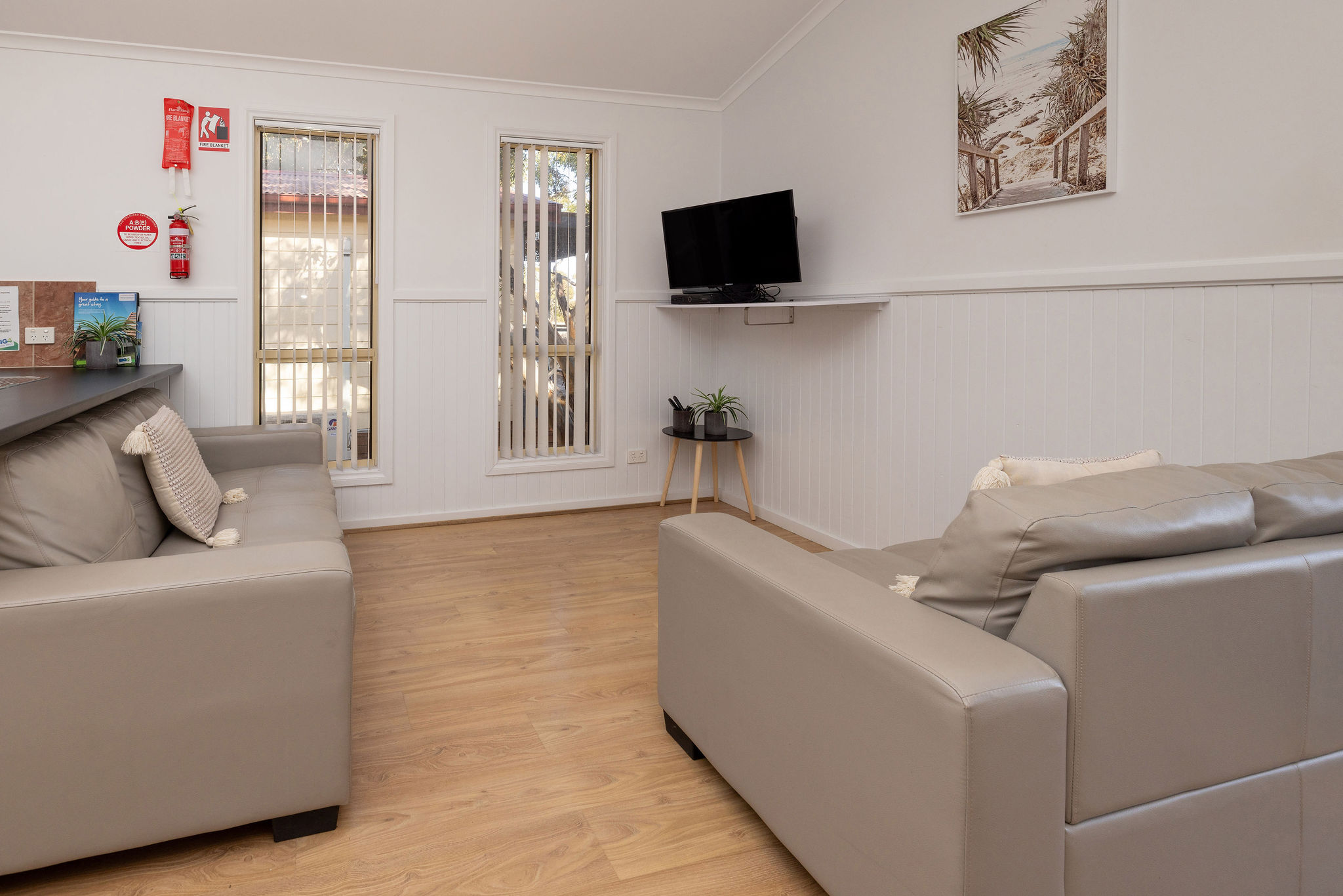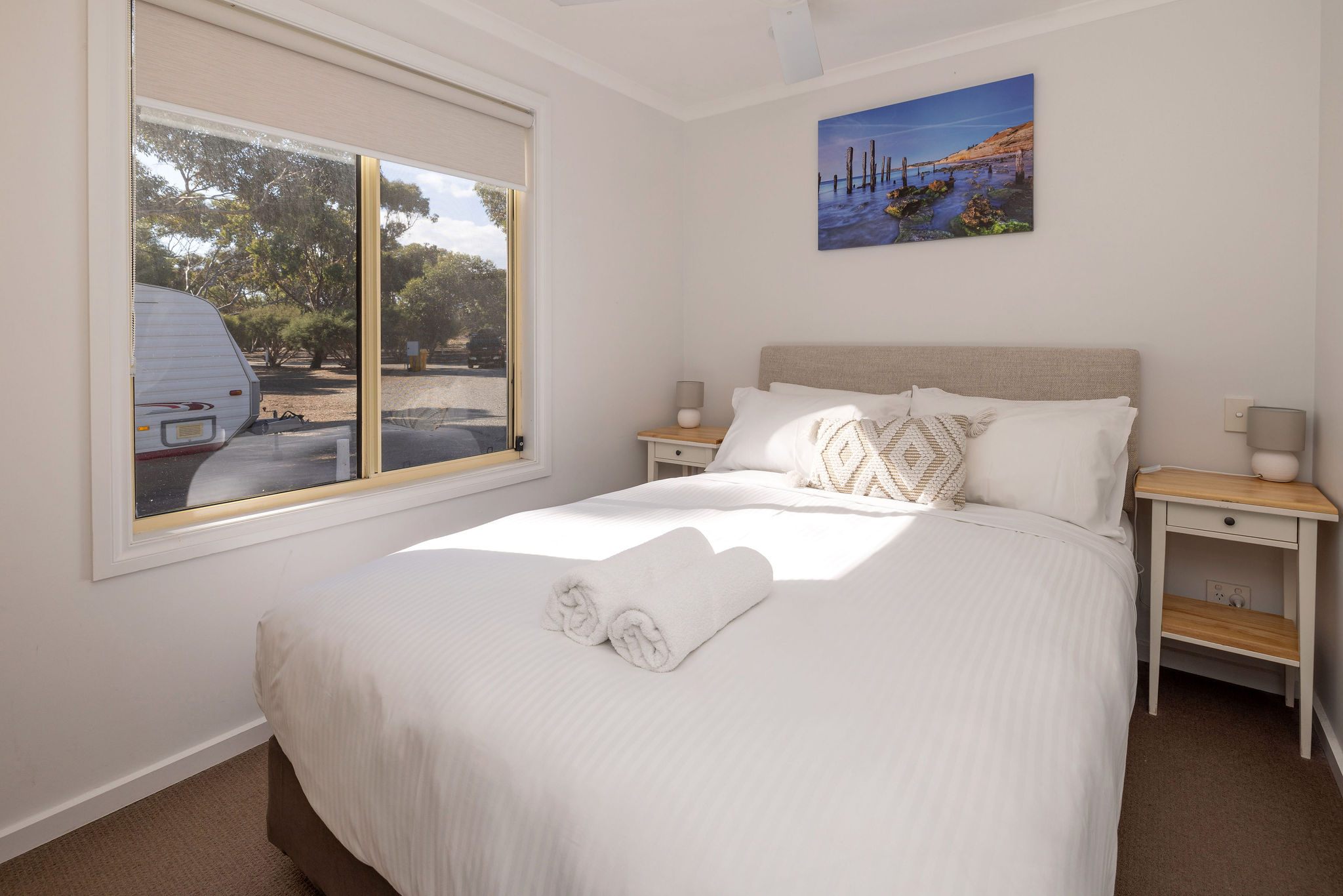 Two bedroom deluxe cabins offer a queen bed in the main bedroom and accommodate two guests in the second bedroom in either a double bed or two singles. All linen is provided. They have a bathroom, fully equipped kitchen, dining table, lounge with sofa, television, DVD player, and air-conditioning.