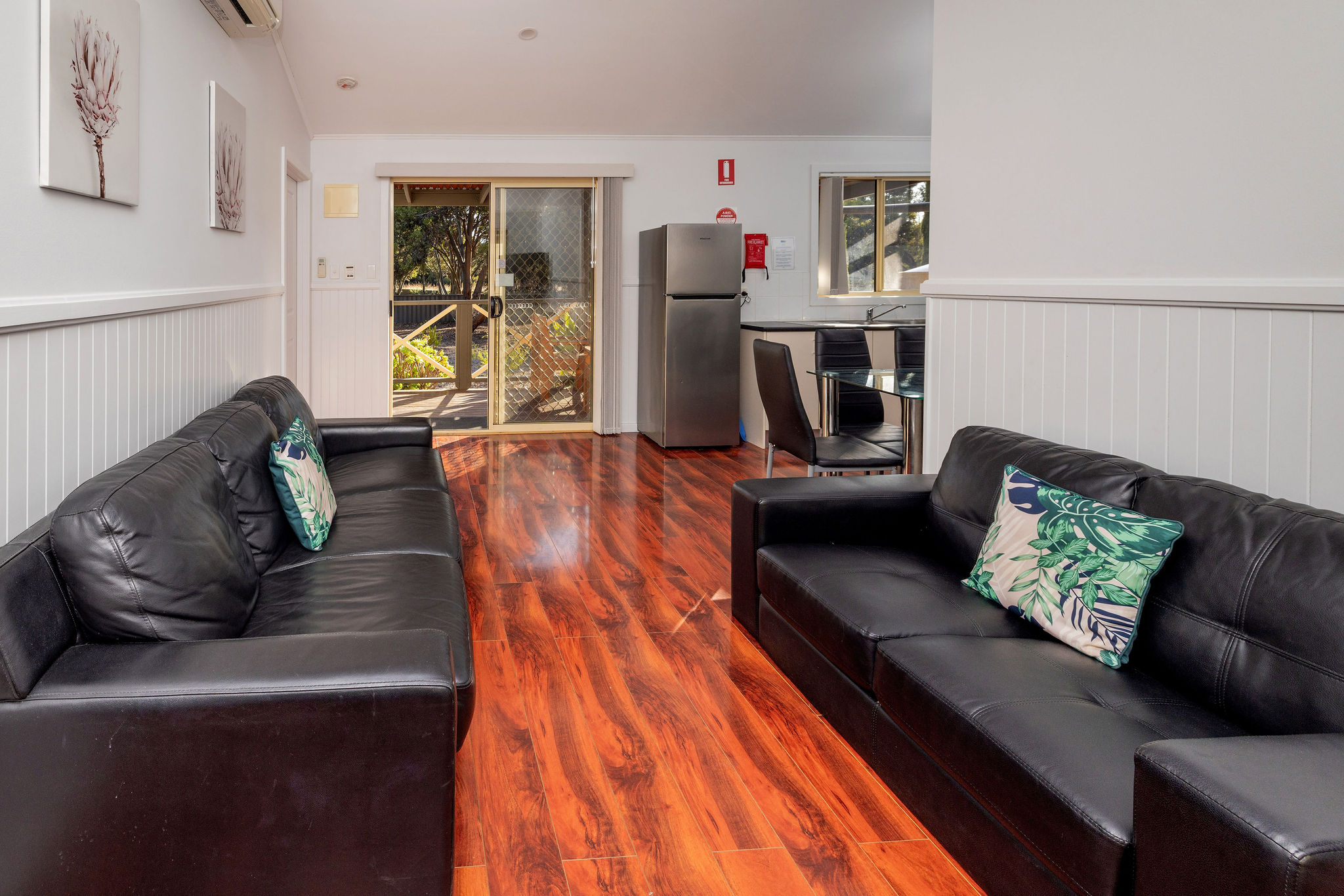 The main bedroom has a queen bed, and the second bedroom has two sets of single bunks with all linen provided. They offer a self-contained kitchen, main living area with sofa, television, DVD player, and are fully air-conditioned with ceiling fans to main bedroom and living area. The cabin has a furnished deck.