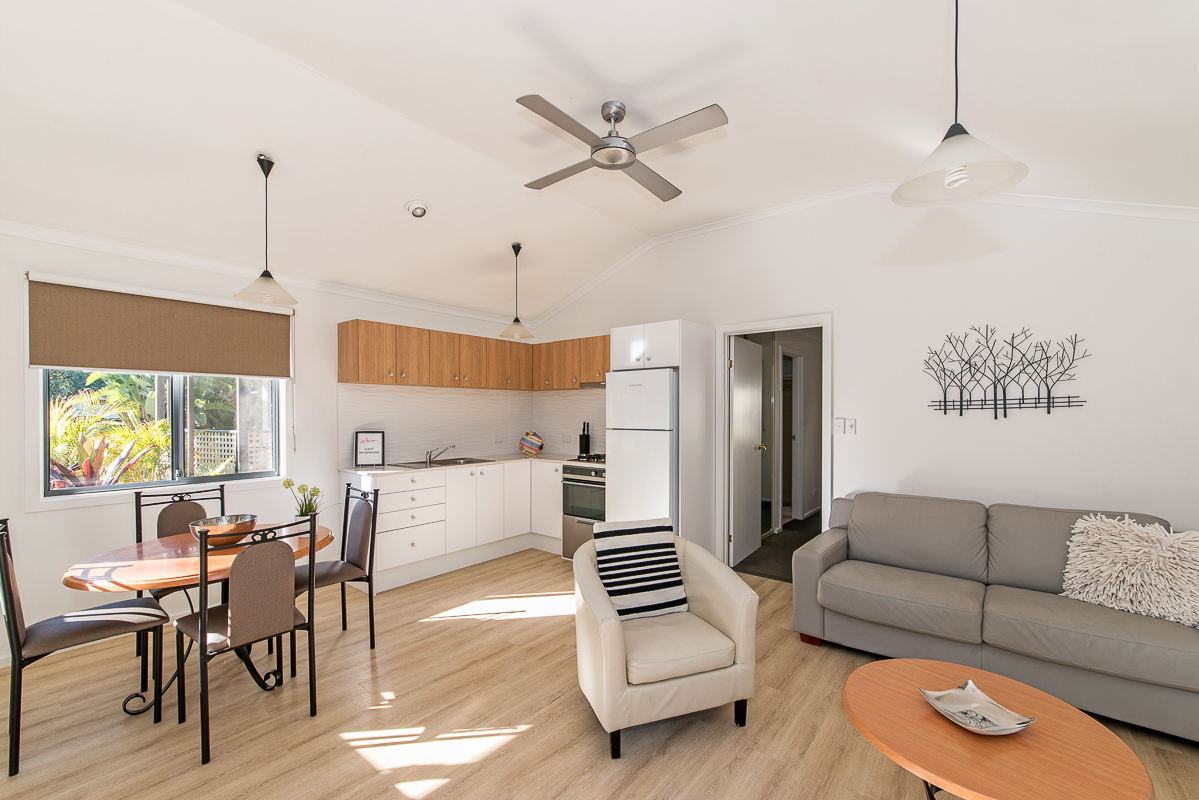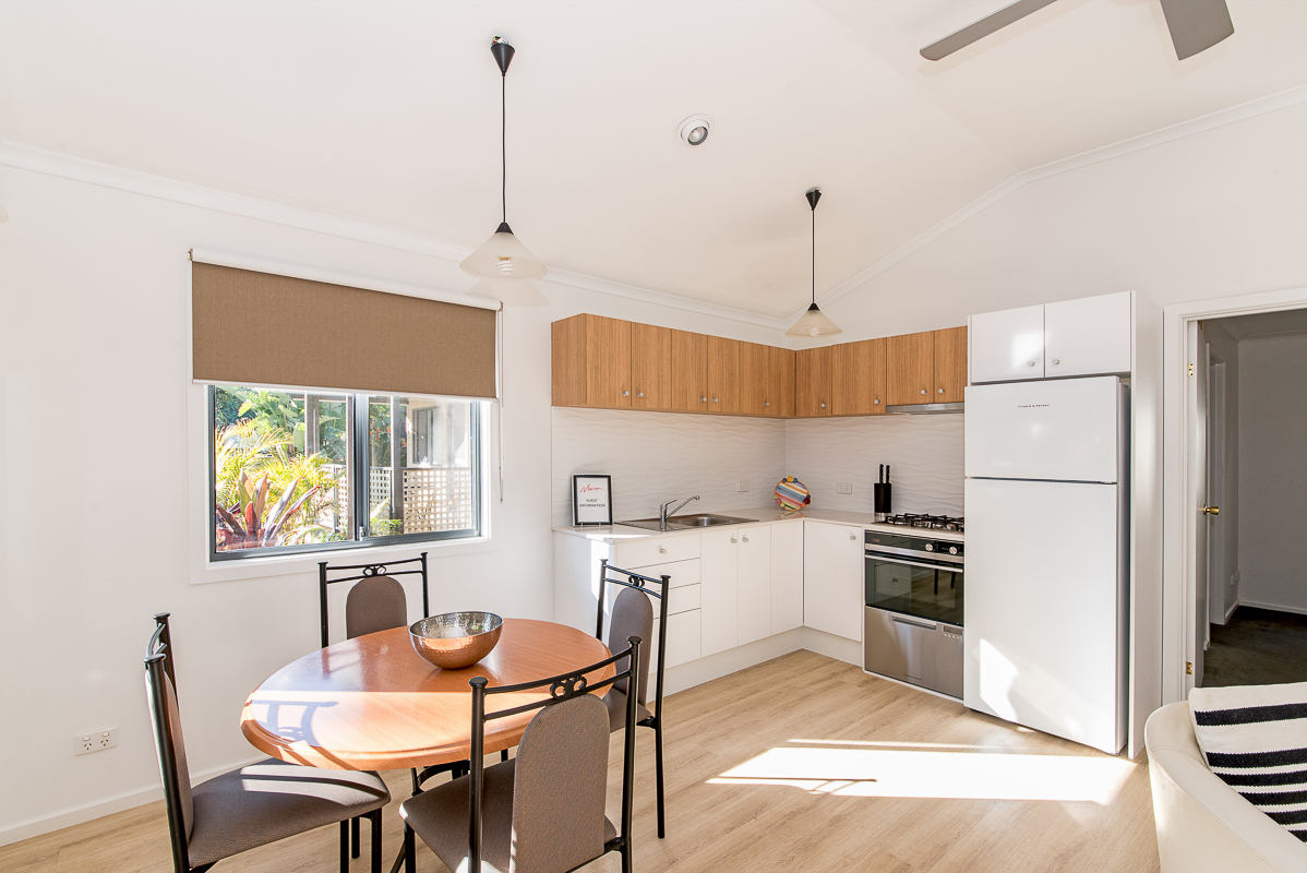 These King Ensuites sleep 2 people include: 1 bedroom - 1 king bed, private decking area, ensuite bathroom, carport, reverse cycle air conditioner, full kitchen with dishwasher, flat screen TV, DVD player, CD player. All bedding and towels supplied.