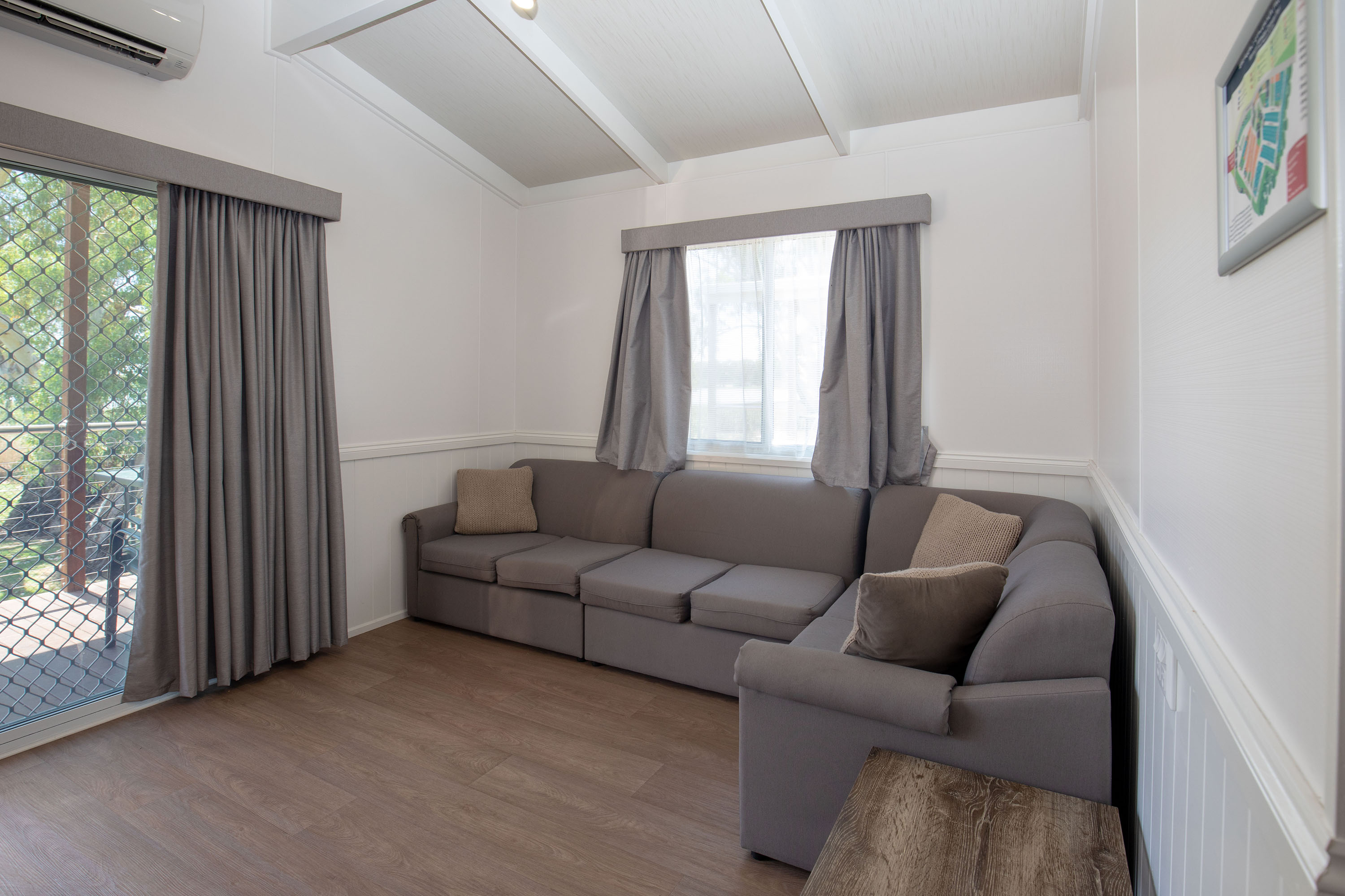 This open-plan villa features a queen bed in the main bedroom and two sets of bunk beds in the second bedroom. The villa is equipped with a self-contained kitchen, including a fridge, microwave, stovetop, and all the necessary crockery and cutlery. There’s also a separate dining area and a TV in the living space. The bathroom includes a shower, toilet, and vanity. The villa is also air conditioned to ensure a comfortable stay.