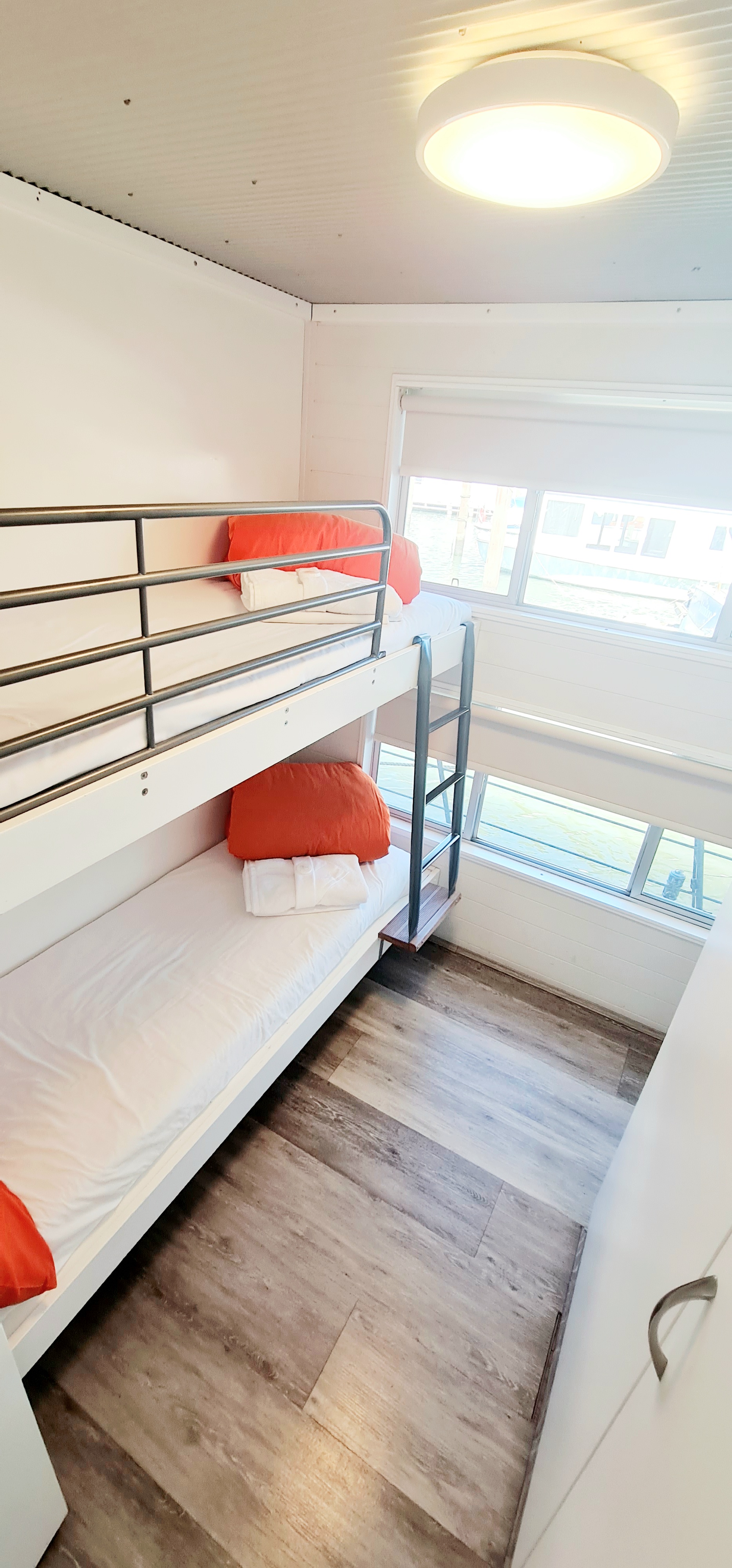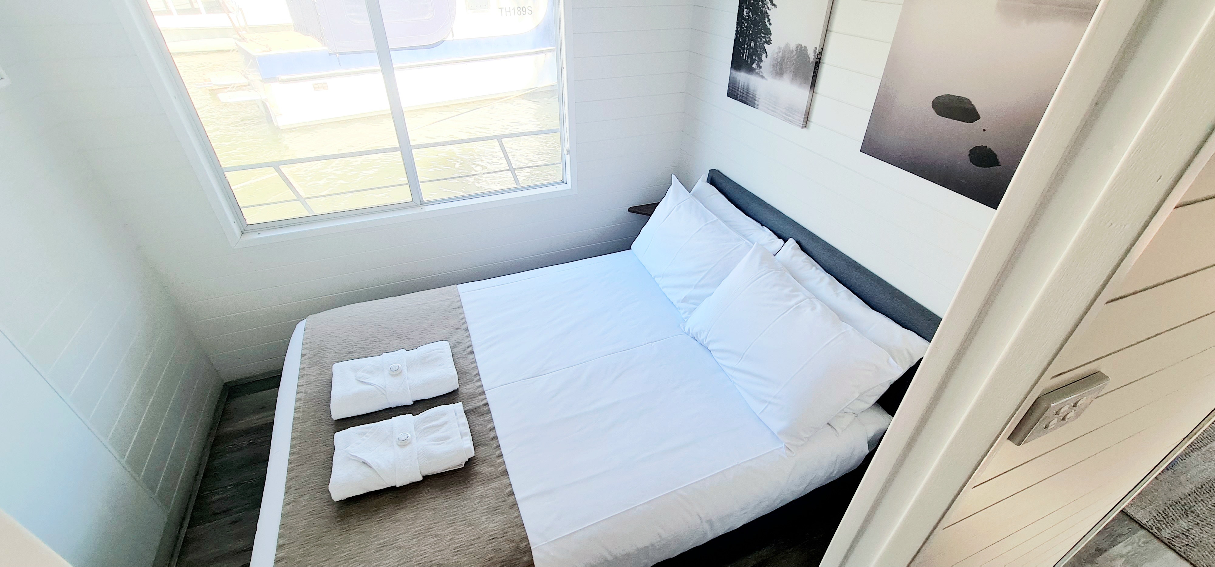 Drift into relaxation aboard Piccolo, our charming 2-bedroom floating cabin with a superb waterfront location. This cosy retreat features a double bed in the main bedroom and a bunk bed in the second, comfortably sleeping up to 4 guests. Enjoy the convenience of a private bathroom, fully equipped kitchen, and open-plan lounge and dining area, perfect for relaxed meals or family downtime. Stay comfortable year-round with air-conditioning and heating, and enjoy free Wi-Fi to keep you connected.