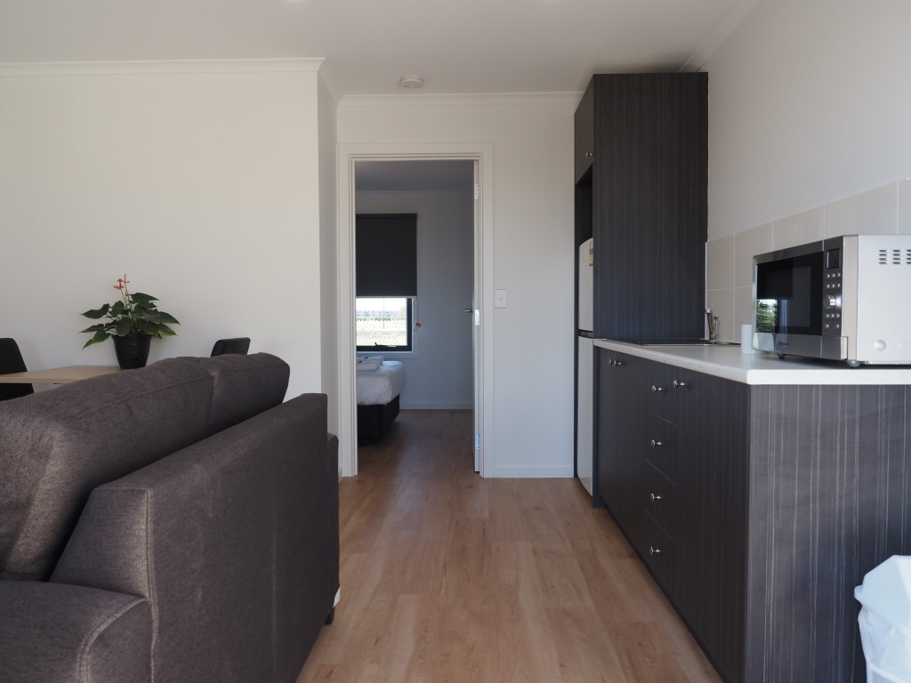 This 1 Bedroom Deluxe Cabin features 1 bedroom with a double bed, open-plan lounge/dining/kitchenette area, bathroom, air-conditioning, and private driveway parking beside the cabin for one vehicle. All linen supplied. Perfectly designed and appointed for a one night stay.