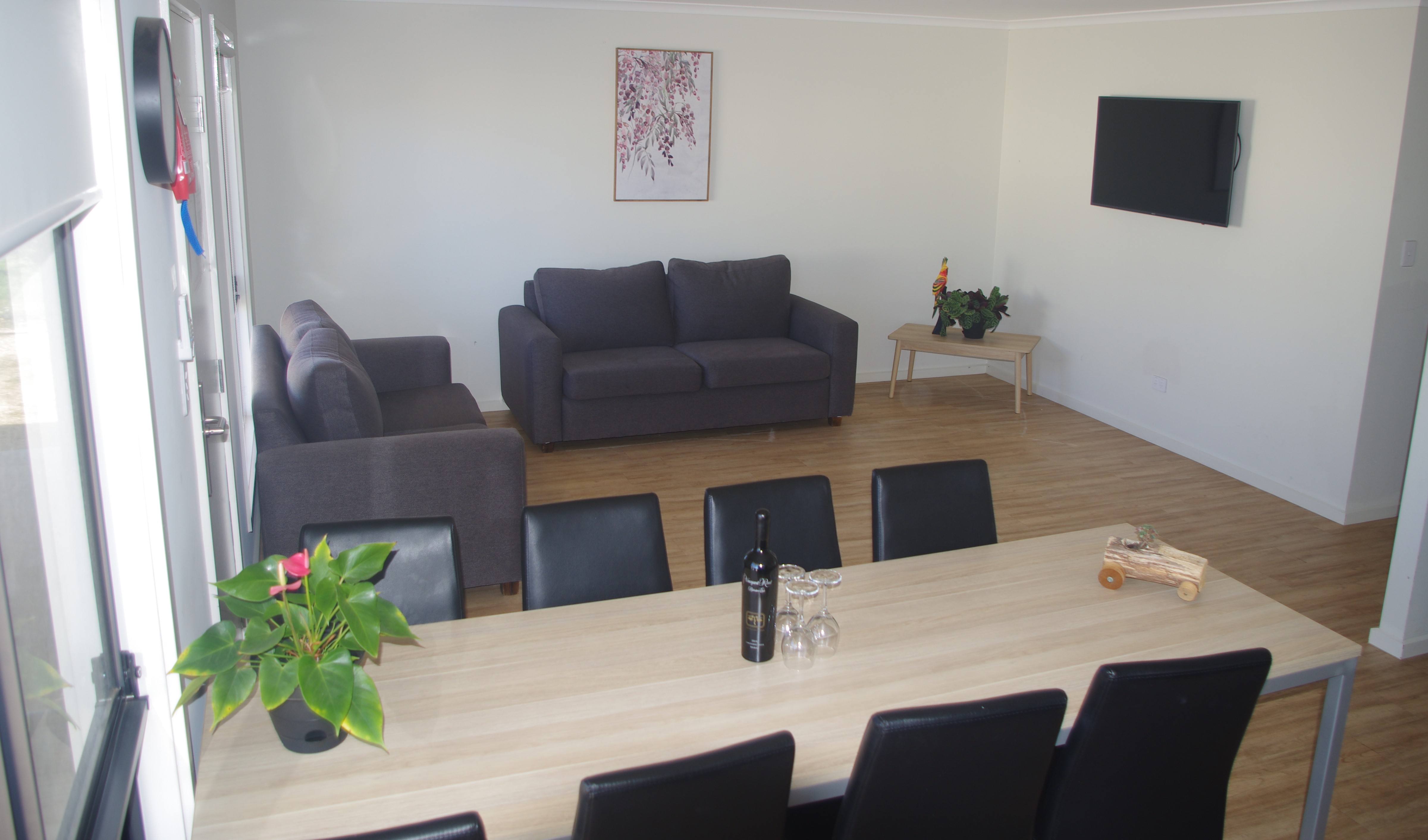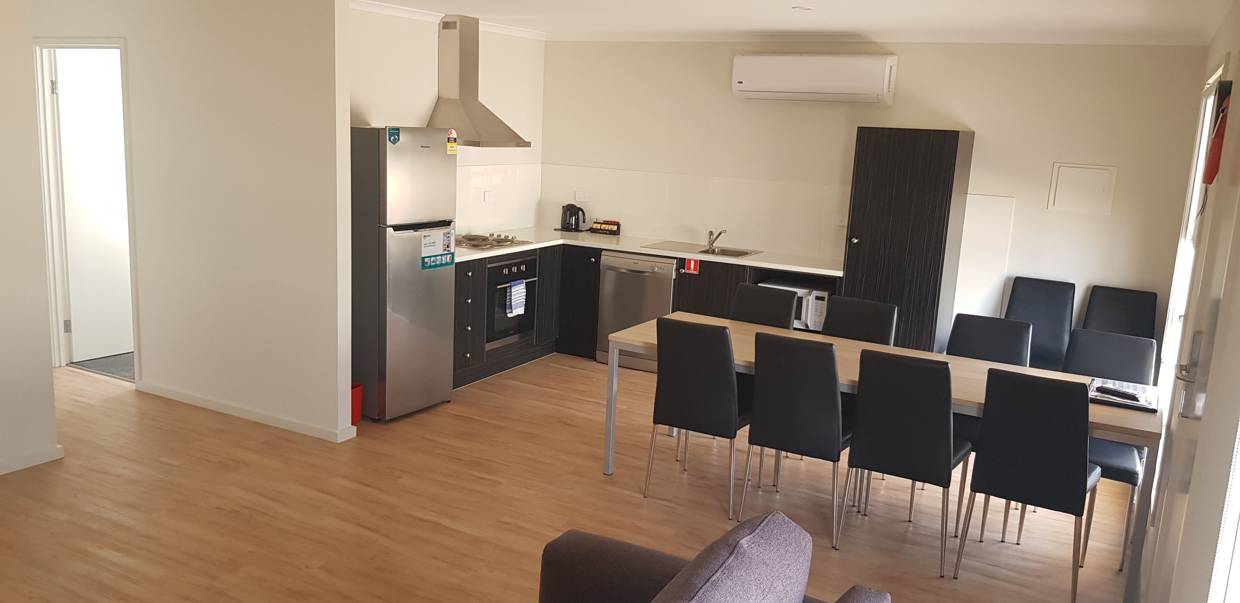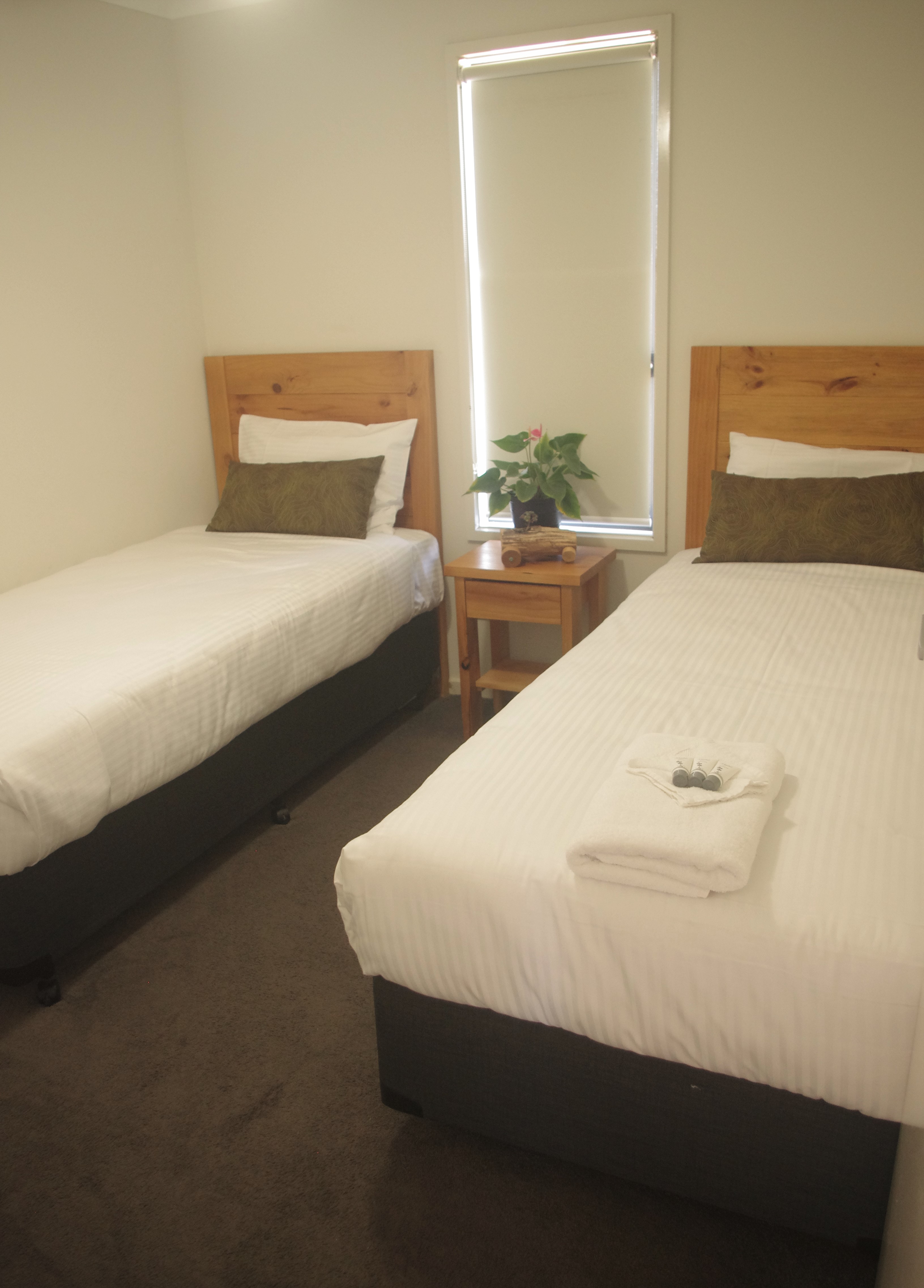 The Deluxe 5 Bedroom Villa features 2 x master bedrooms with king bed, bedrooms 3, 4, 5 all with single beds. Fully equipped kitchen, open-plan lounge/dining, bathroom, air-conditioning, and private driveway parking beside the cabin for one vehicle. All linen supplied. Recommended for sleeping up to 10 guests.