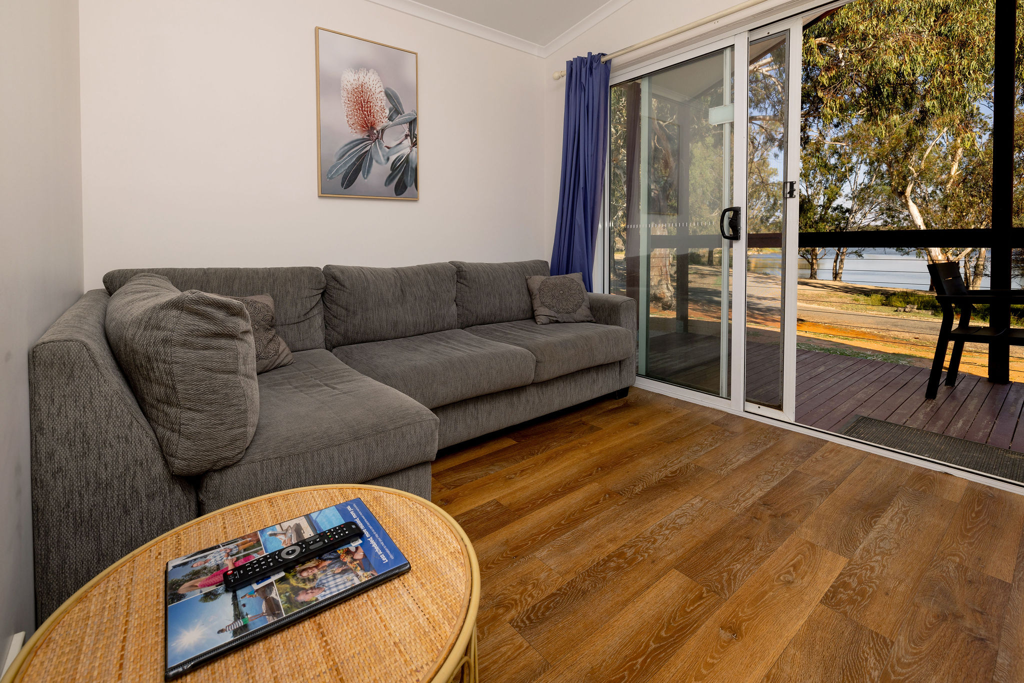 Riverfront Executive 2 Bedroom Cabin, each feature a main bedroom with queen bed and TV, 2nd bedroom with 2x single bunks (4 beds in bunk style). All linen provided for each booked guest.