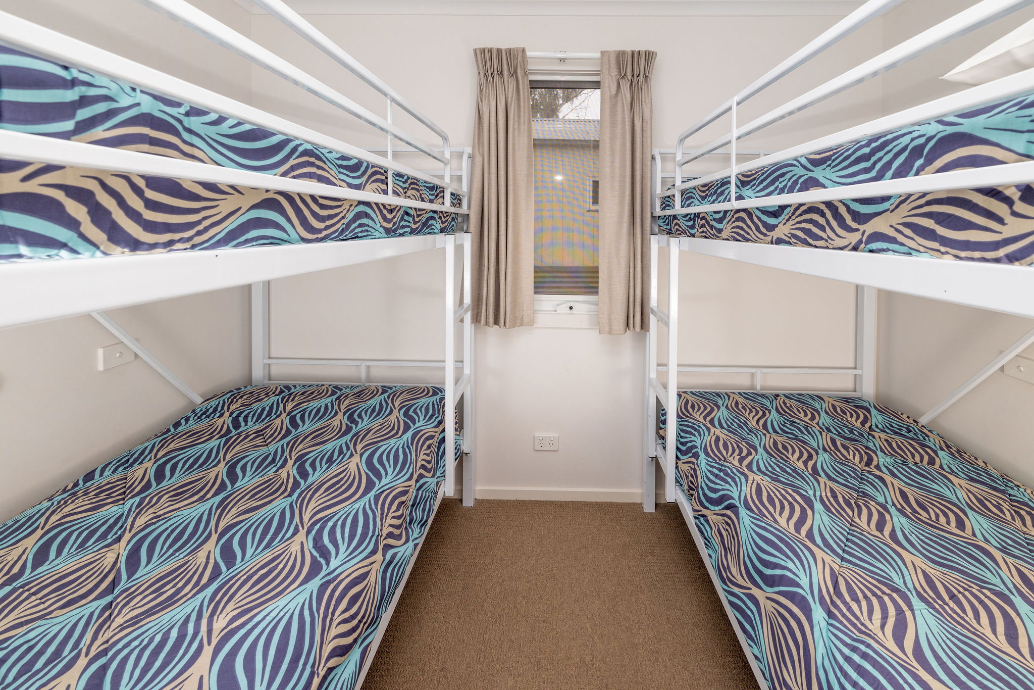 1. **If your cabin has bunk beds** Bunk Beds: Please be advised that under Workplace Health and Safety obligations we must comply with the Australian Standard AS/NZS 4220:2003 which states “children under the age of nine years are not permitted to use the top bunk, children must not play on the top bunk". Please take this into consideration when making your booking. (Ensuite Sites do not have bunk beds, Ensuite sites are powered ensuite sites for caravans)