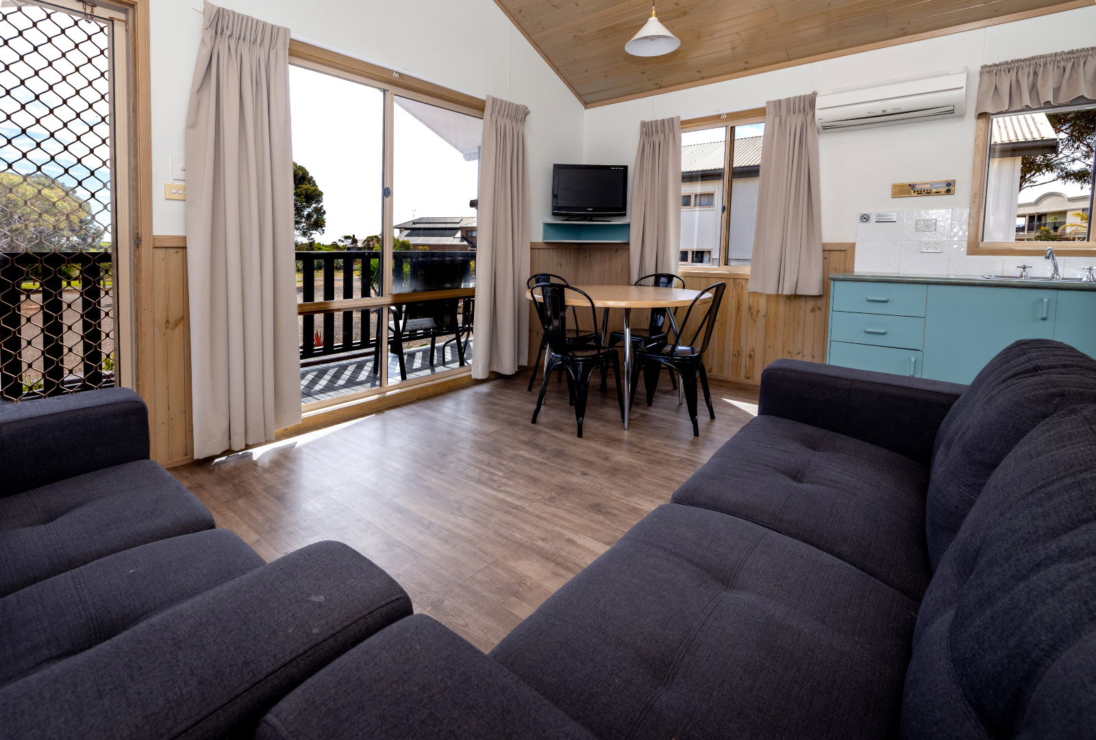 Well-suited to a family with small children, these cabins sleep up to 6 people and include a queen bed in the main bedroom and two sets of single bunks in the second bedroom. Offering a spacious lounge and dining area, there’s plenty of room for everyone to relax around the TV after a big day by the beach.
