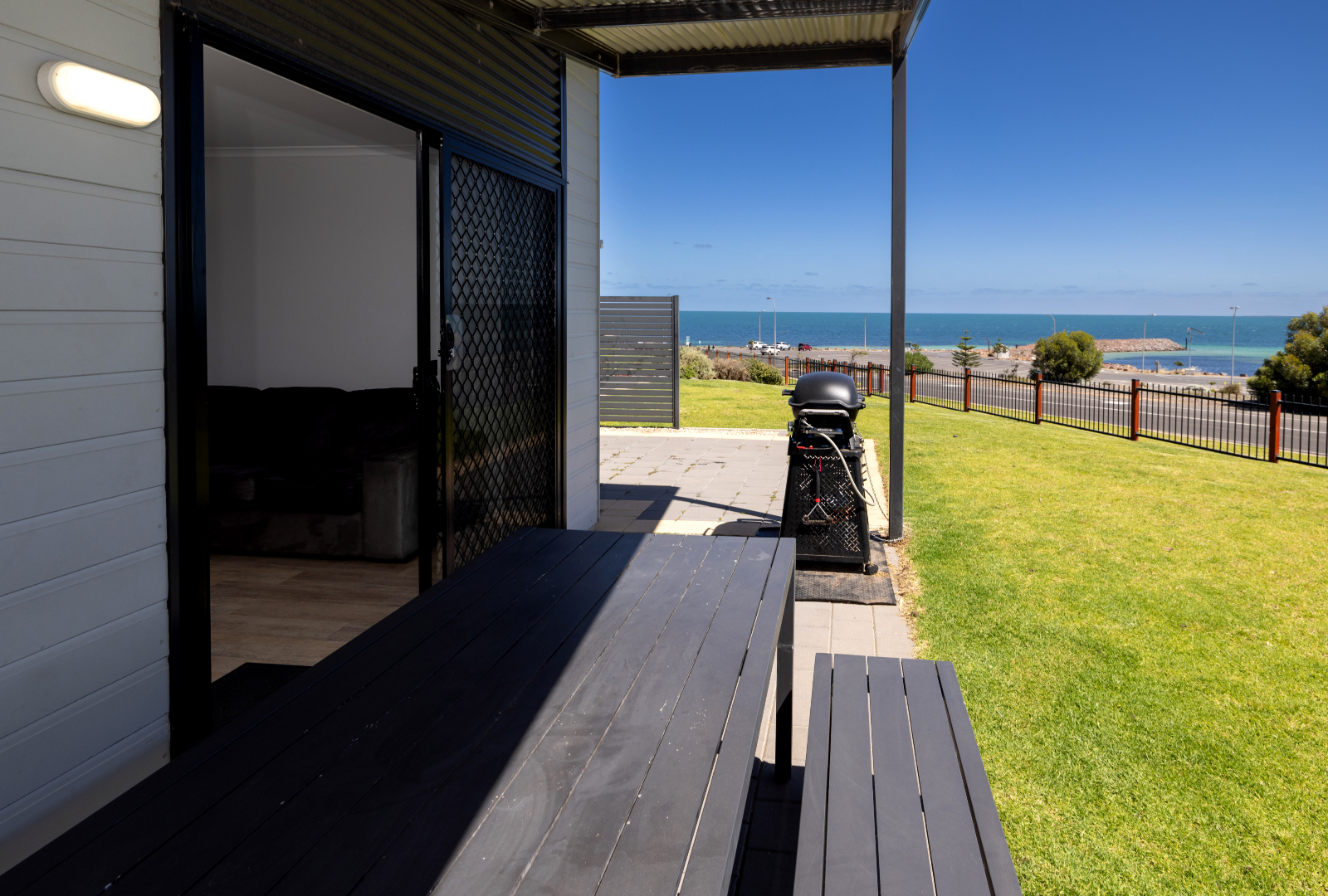 Overlooking the coastline of Moonta Bay, these spacious self-contained villas are the perfect place to set up for a beach-view holiday. Our three-bedroom Beach View Villas sleep up to seven people and are equipped with a queen bed in the main bedroom, a king bed that can split into two singles in the second bedroom, and a single bed plus a set of bunk beds in the third bedroom. Enjoy the comfort of your villa and come together in the open-plan living area to watch a movie. The villa is equipped with HD TV, High-Speed Internet, and streaming services, ensuring entertainment and connectivity during your stay. When you get hungry, make the most of the fully equipped kitchen for those delicious family meals, or head outside to cook on the Weber BBQ while taking in the coastal views. If you’re looking for a bit of quiet time to dive into a book, sneak off to the study area so you can read in peace. The Beach View Villas also have large bathrooms and separate toilets, so there won’t be any fighting about who’s going first. Please notify us if you are bringing a dog, as additional charges apply.