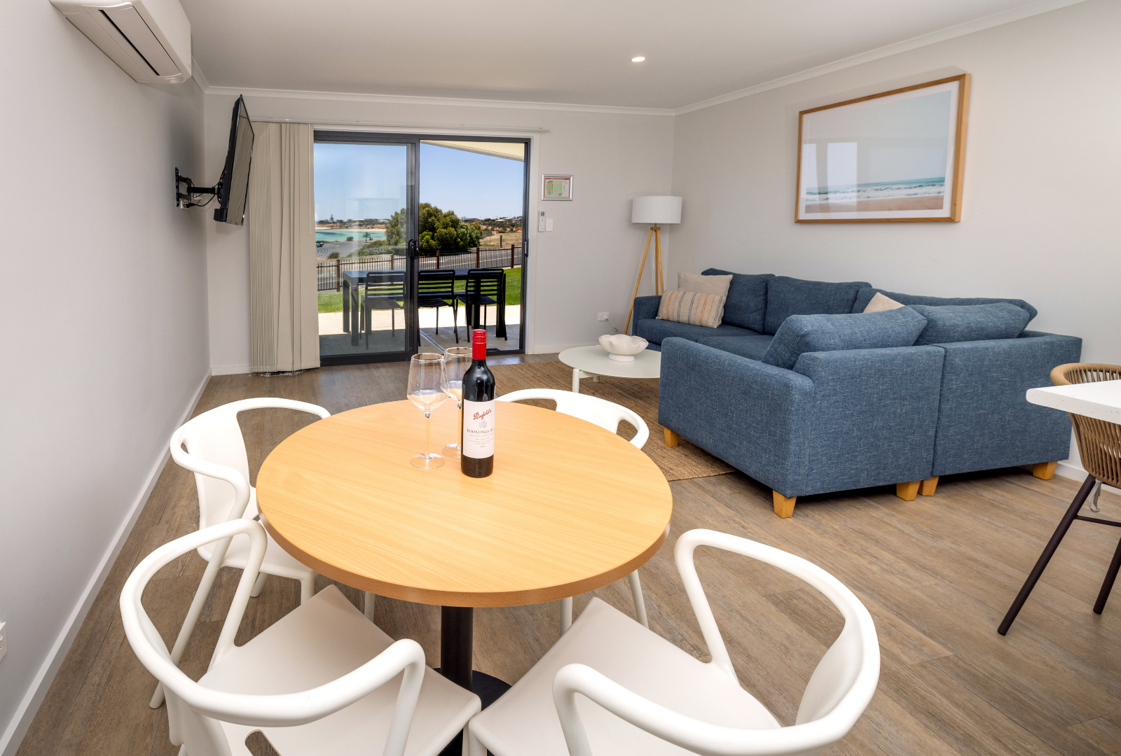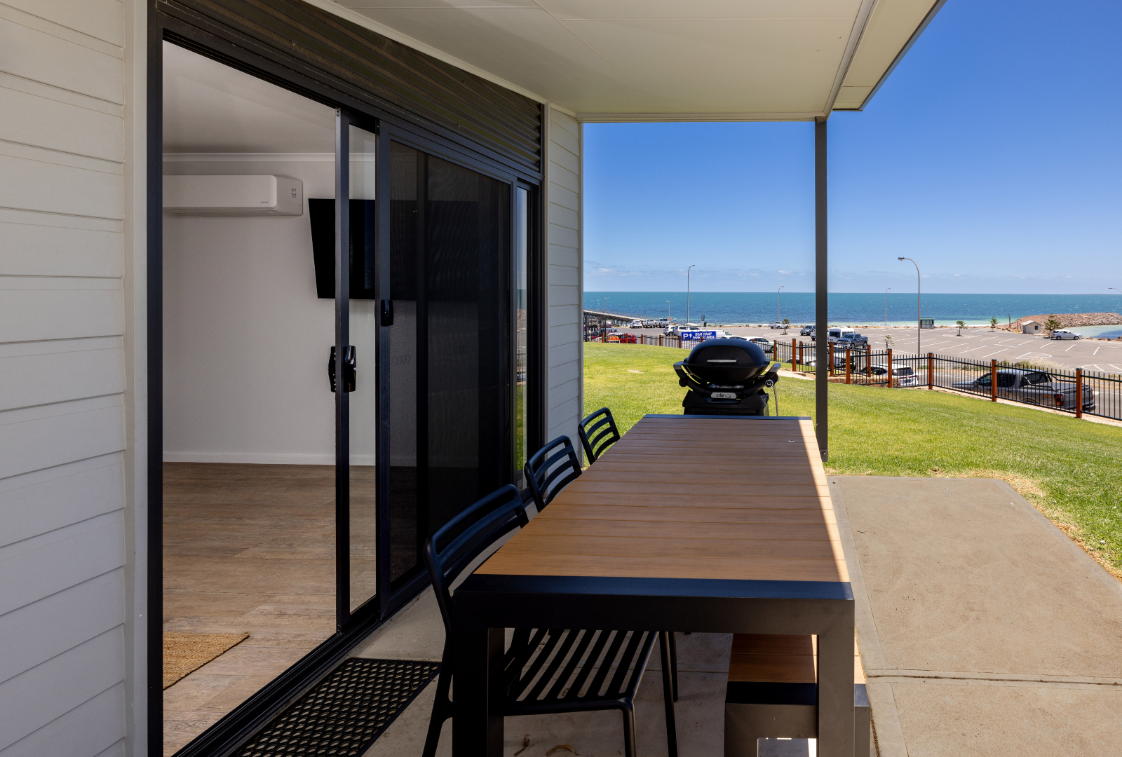 Overlooking the coastline of Moonta Bay, these spacious self-contained villas are the perfect place to set up for a beach-view holiday. Our two-bedroom Beach View Villas sleep up to six people and are equipped with a queen bed in the main bedroom and two sets of bunk beds in the second bedroom. Enjoy the comfort of your villa and come together in the open-plan living area to watch a movie. The villa is equipped with HD TV, High-Speed Internet, and streaming services, ensuring entertainment and connectivity during your stay. When you get hungry, make the most of the fully equipped kitchen for delicious family meals, or head outside to cook on the Weber BBQ while soaking up the coastal views. If you’re looking for a bit of quiet time to dive into a book, sneak off to the study area so you can read in peace. The Beach View Villas also have large bathrooms and separate toilets, so there won’t be any fighting about who’s going first. Please notify us if you are bringing a dog, as additional charges apply.
