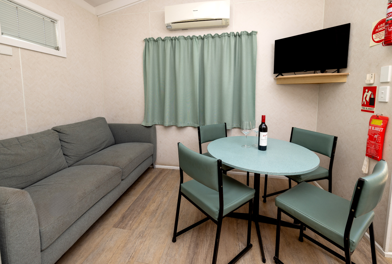 The cabin has an open plan living area with air-conditioning, LCD TV, DVD Player and lounge chair. The fully equipped kitchen is supplied with a cooktop and oven, microwave, electric frypan, 140L refrigerator, crockery, cutlery and utensils all supplied.