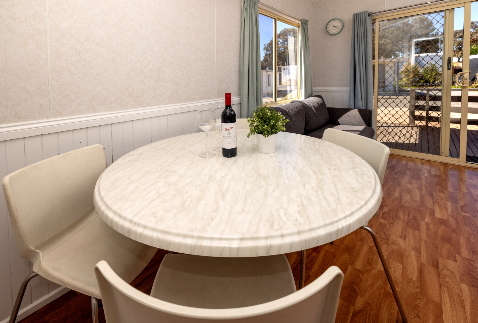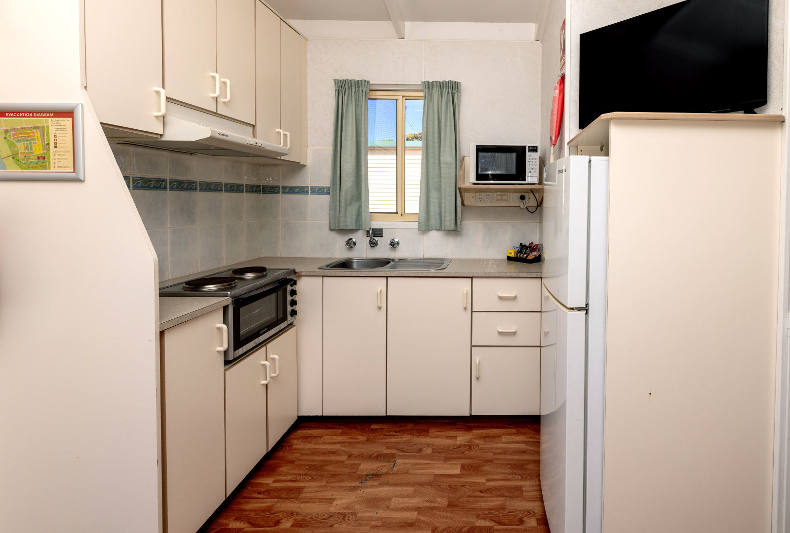 The living area is an open plan style with a lounge chair, reverse-cycle air conditioning, ceiling fans, TV, DVD player. The kitchen is fully equipped with a cooktop/oven, microwave, electric frypan, 210L fridge, crockery, cutlery and utensils all supplied.