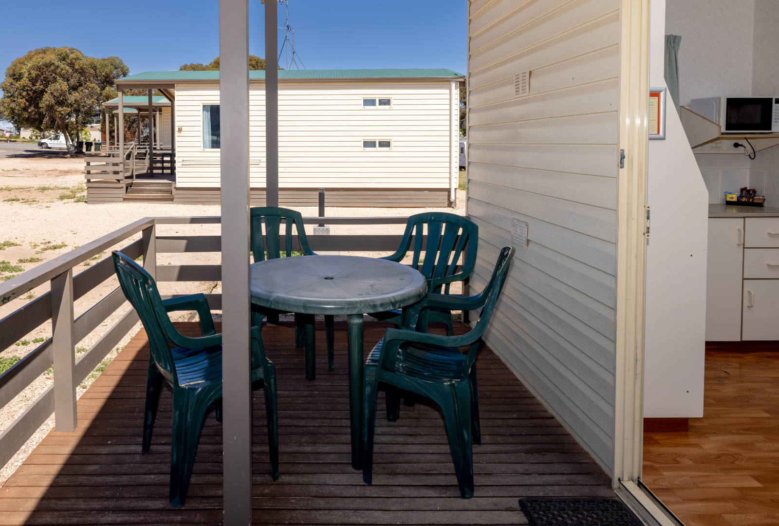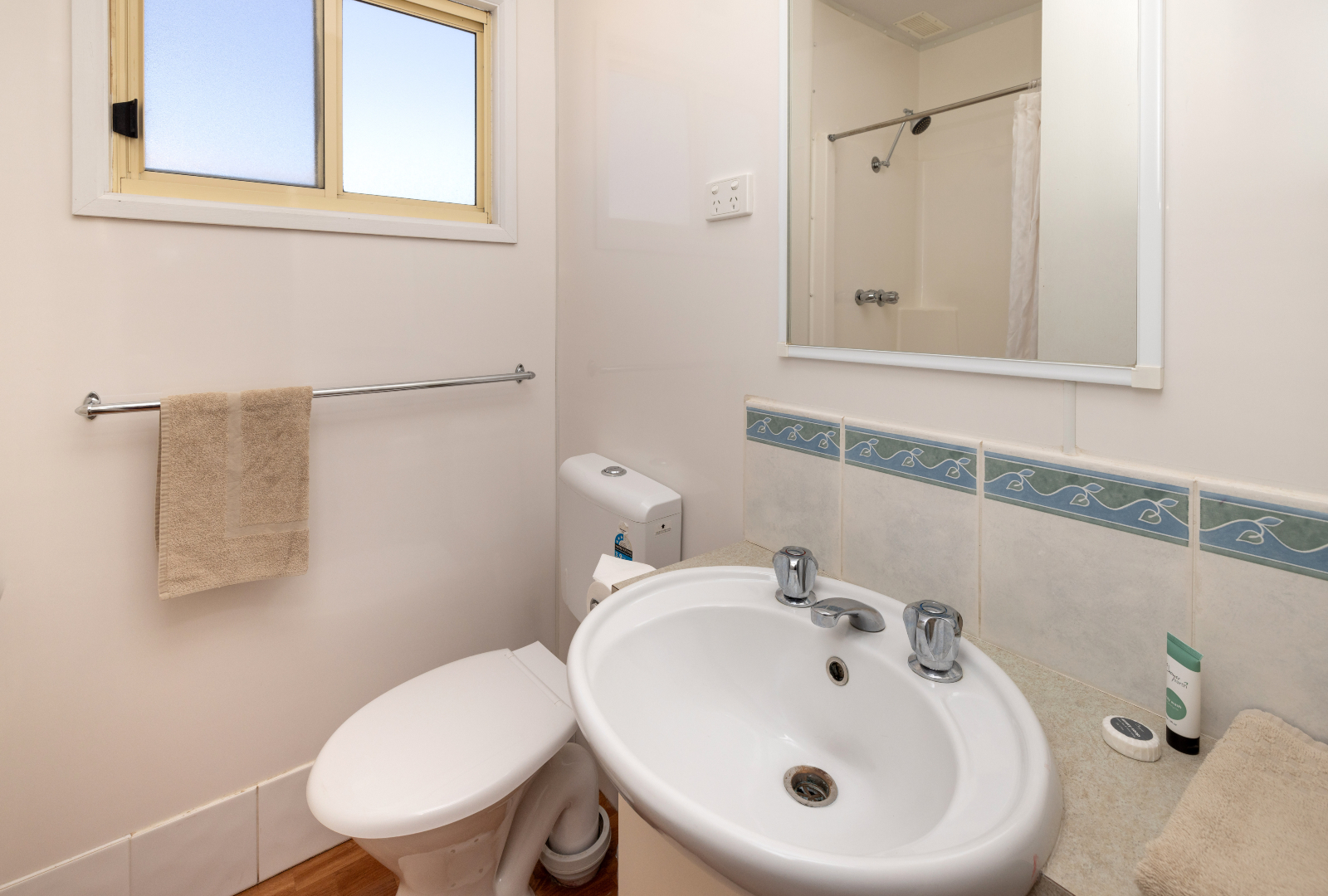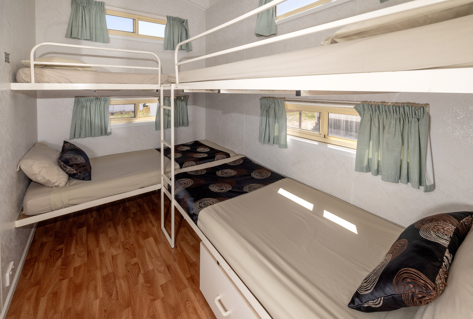 This two-bedroom cabin sleeps up to six people with a queen bed in the main bedroom and two sets of bunk beds in second room (L-Shape). Linen is supplied for all beds.