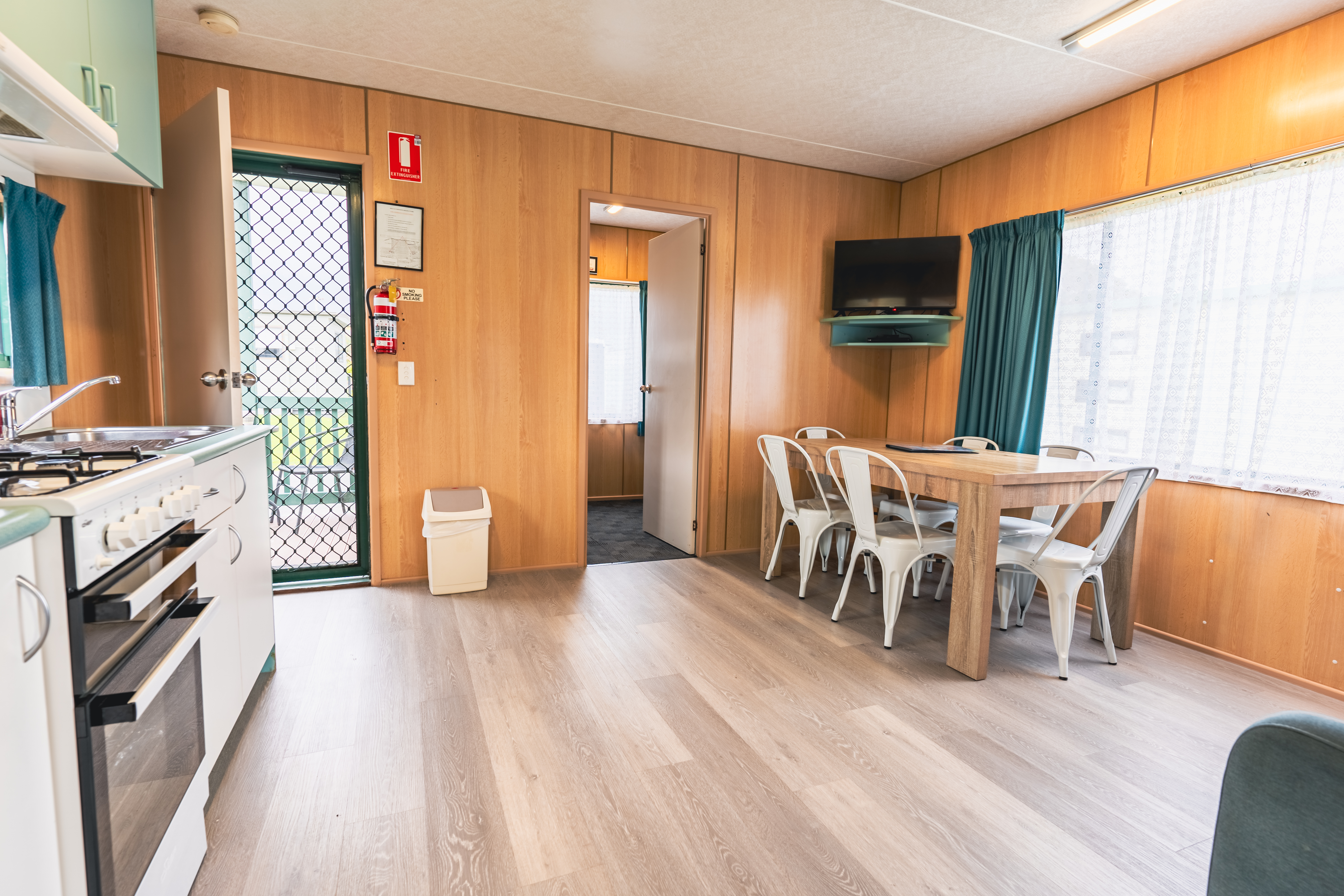 Bring the whole family for a fun-filled holiday while staying in one of our modern Family Cabins. Our Family Cabins (sleeps 6) have two bedrooms, one with a double bed and the second with two sets of bunks. They have a modern fully equipped kitchen which has everything you need for your stay including a full-size fridge, microwave, stove top and oven. The lounge and dining area include a dining table, lounge, TV and reverse-cycle air-con/heat making them perfect for families to enjoy a night together, with an outdoor balcony to sit and relax, plus parking right outside. These cabins have everything you need to enjoy a fuss free family holiday.