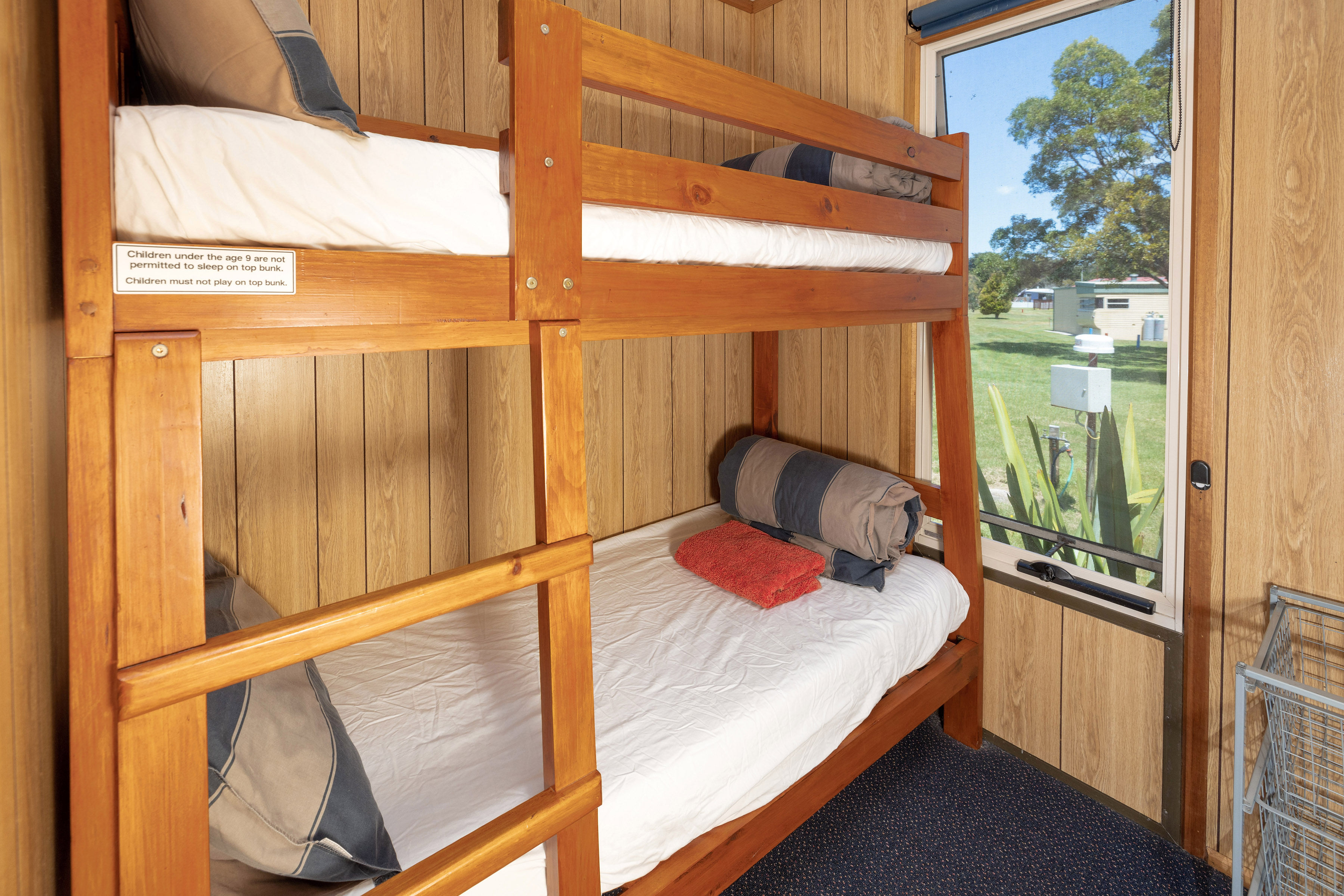 Australian Standards maintain that children need to be 9 years old or older to sleep on the top bunk in cabin accommodation, and even though it's fun, they are not allowed to play on the top bunk. Please make your booking with this in mind.