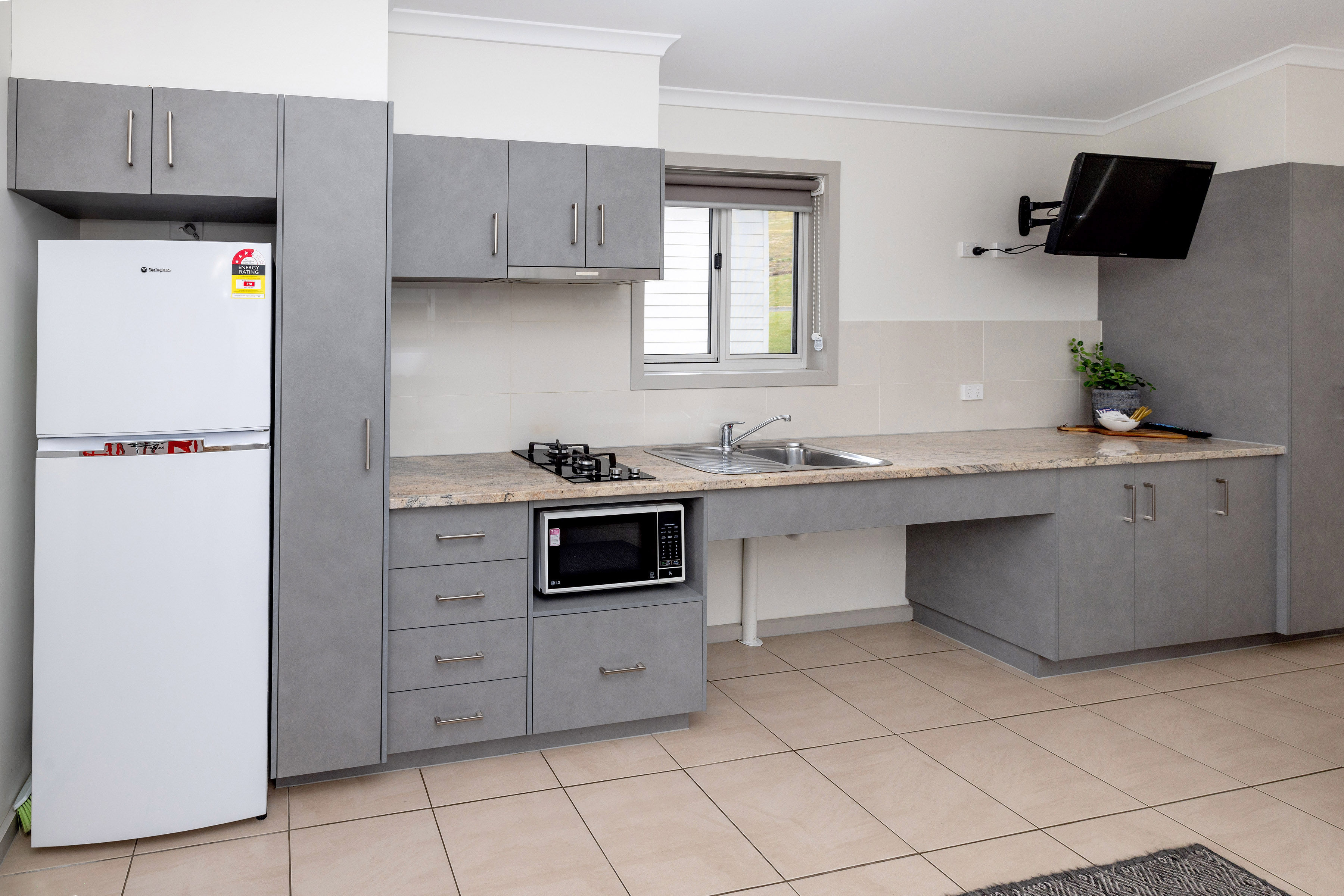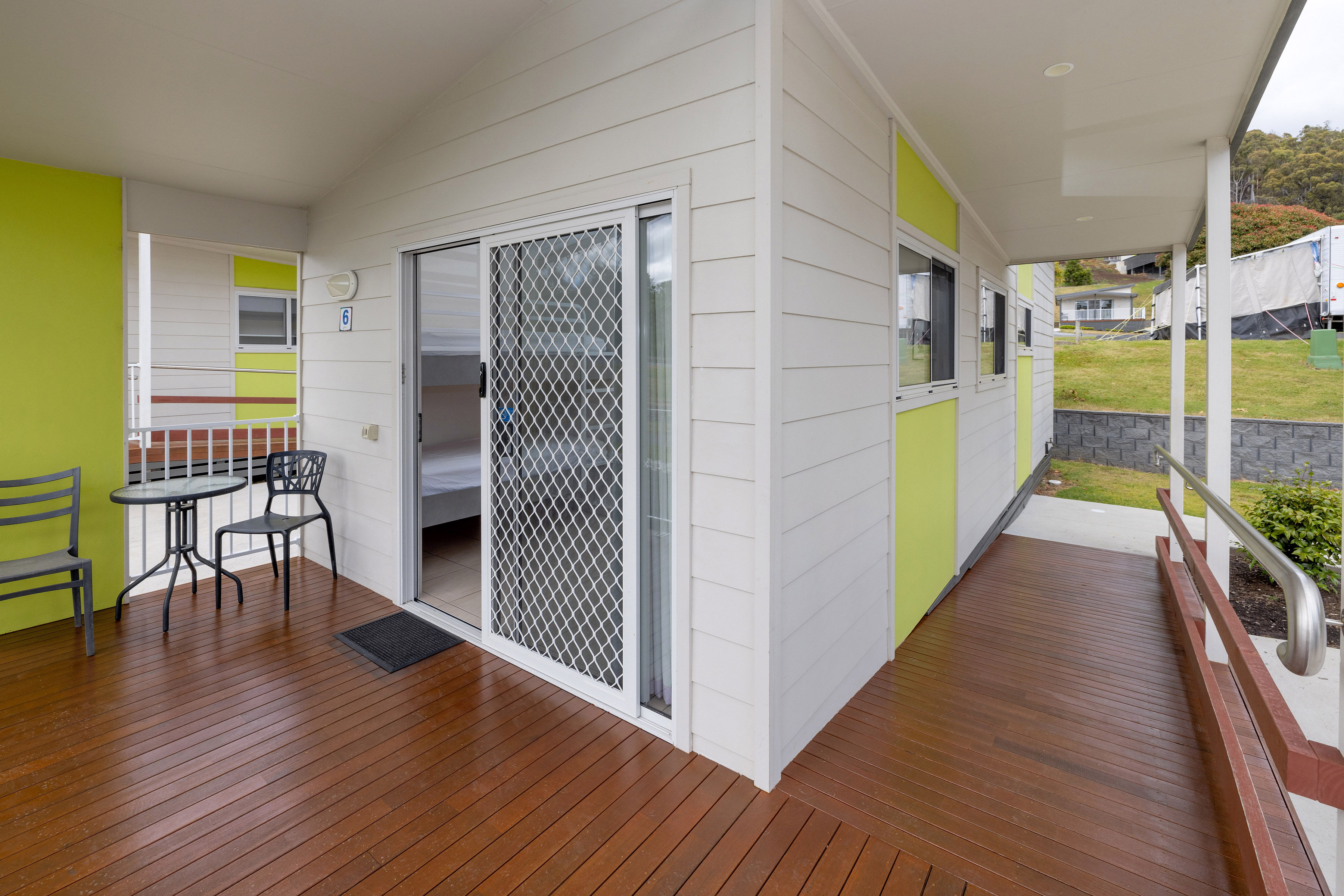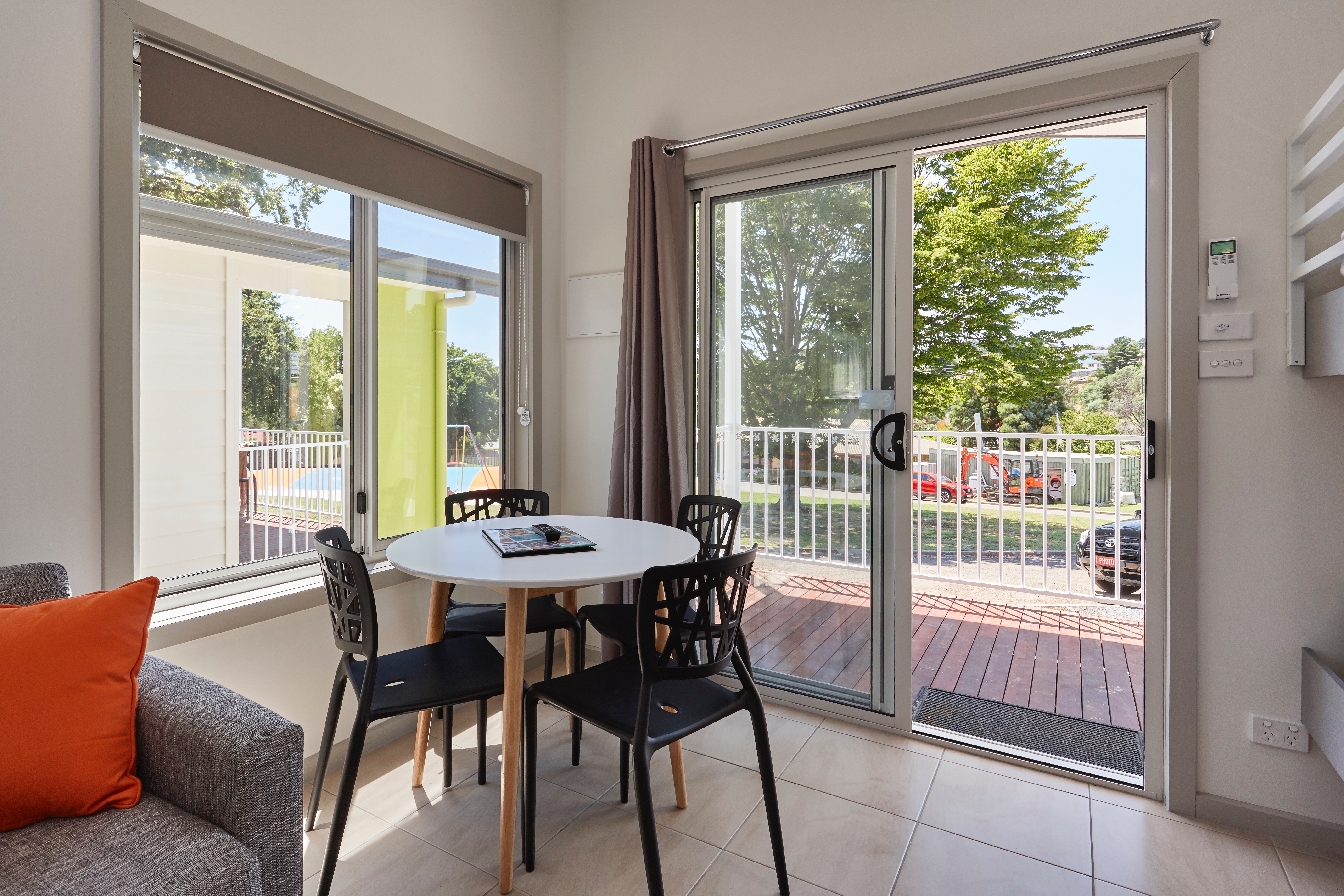 Each villa is bright and welcoming, with expansive views over the jumping pillow and playground. A private veranda invites you to unwind with a coffee, tea, or a glass of local Tasmanian wine while watching the little ones play nearby. Inside, you'll find a flat-screen television, reverse-cycle air conditioning, and all the modern conveniences needed for a relaxing stay.