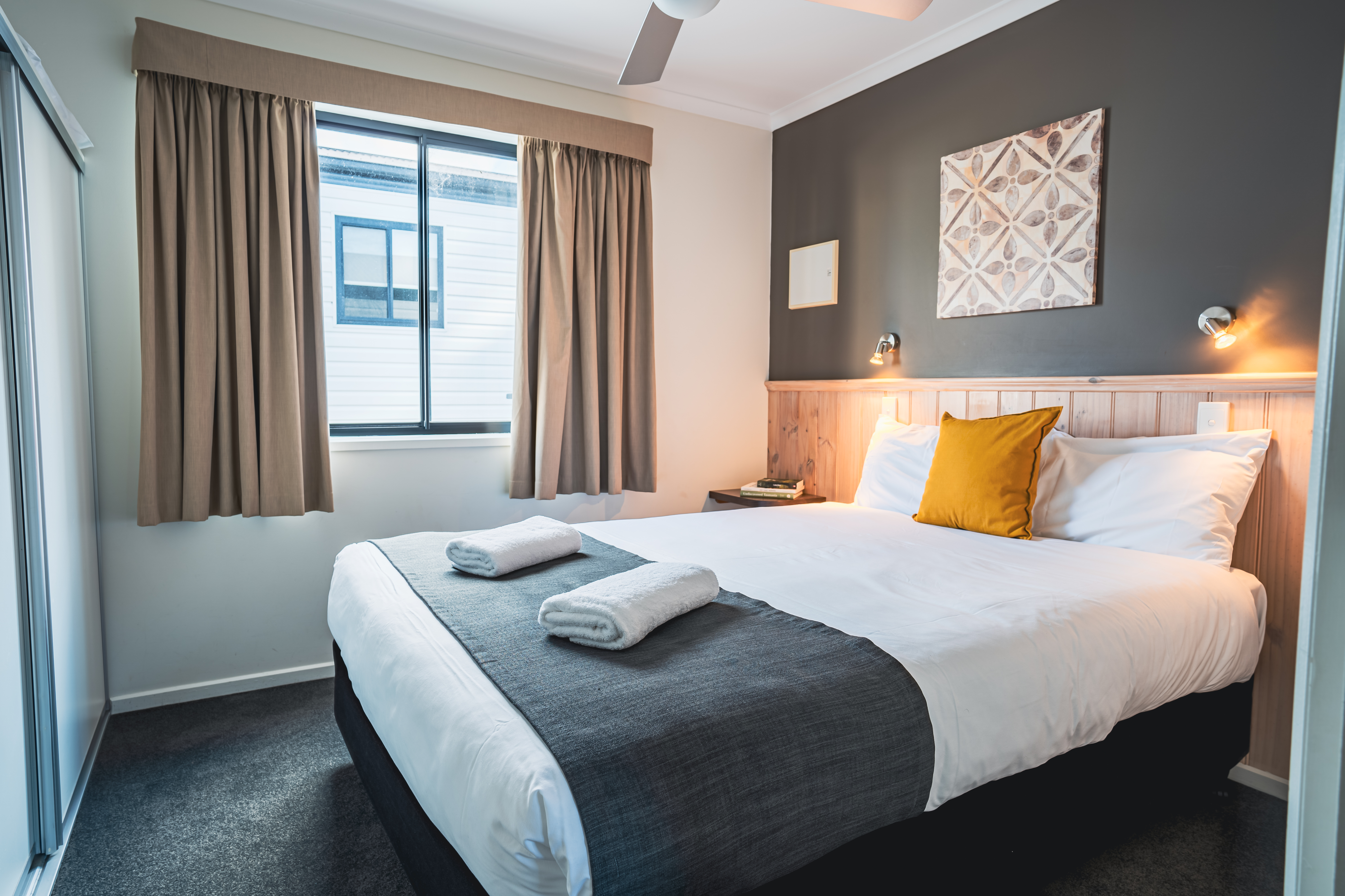 These contemporary units feature a fully equipped kitchen, modern bathroom, two queen bedrooms, one with a TV, lounge with a sofa bed (extra bedding supplied as required), dining area, reverse-cycle air-conditioning with parking right beside the unit.