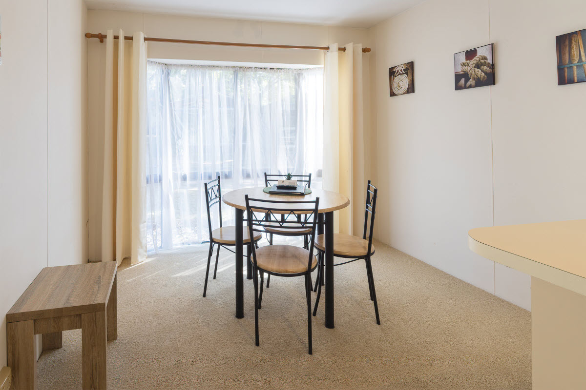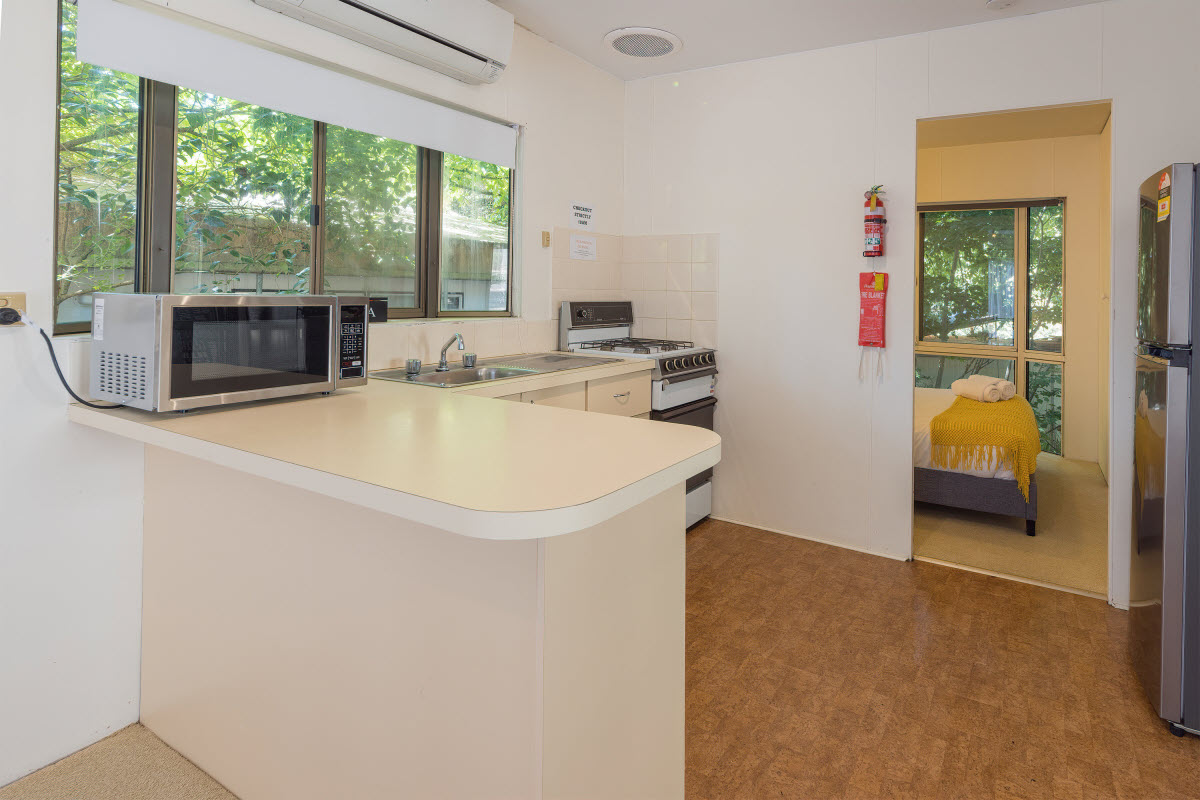 - Fully self-contained kitchen with full size fridge, gas or electric stove, microwave, electric kettle, toaster, cutlery, crockery, pots and pans.