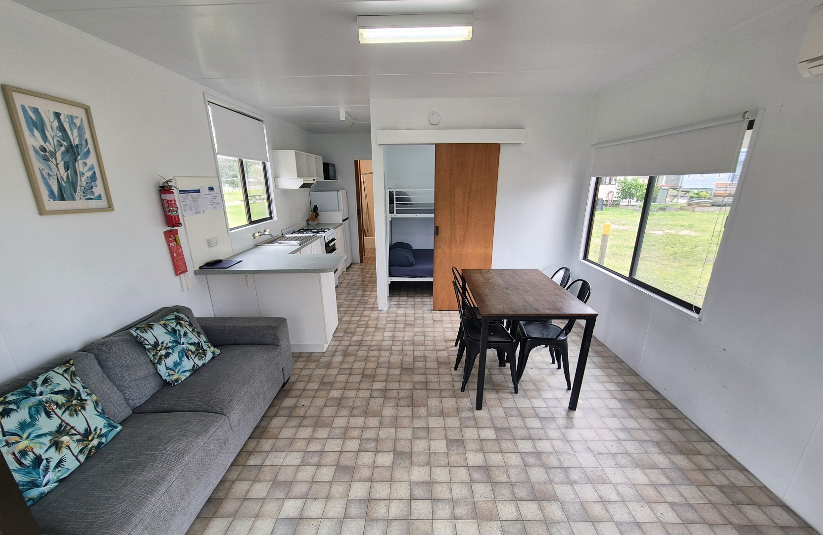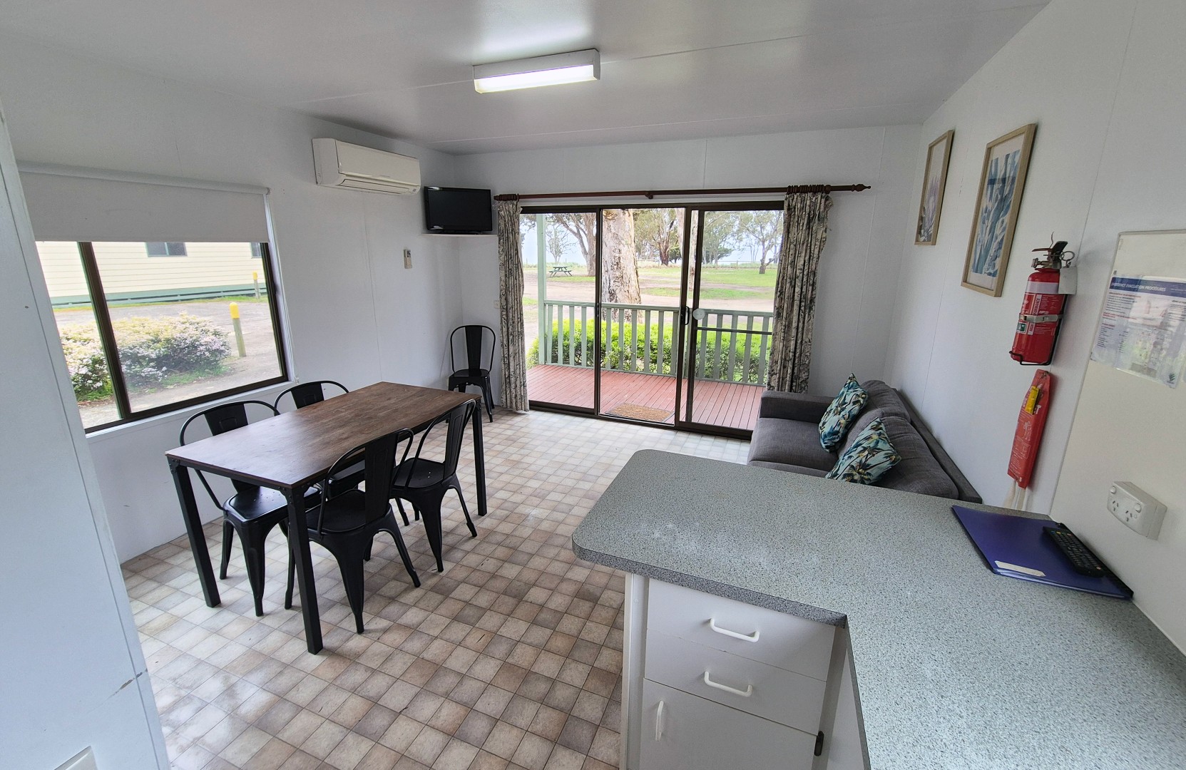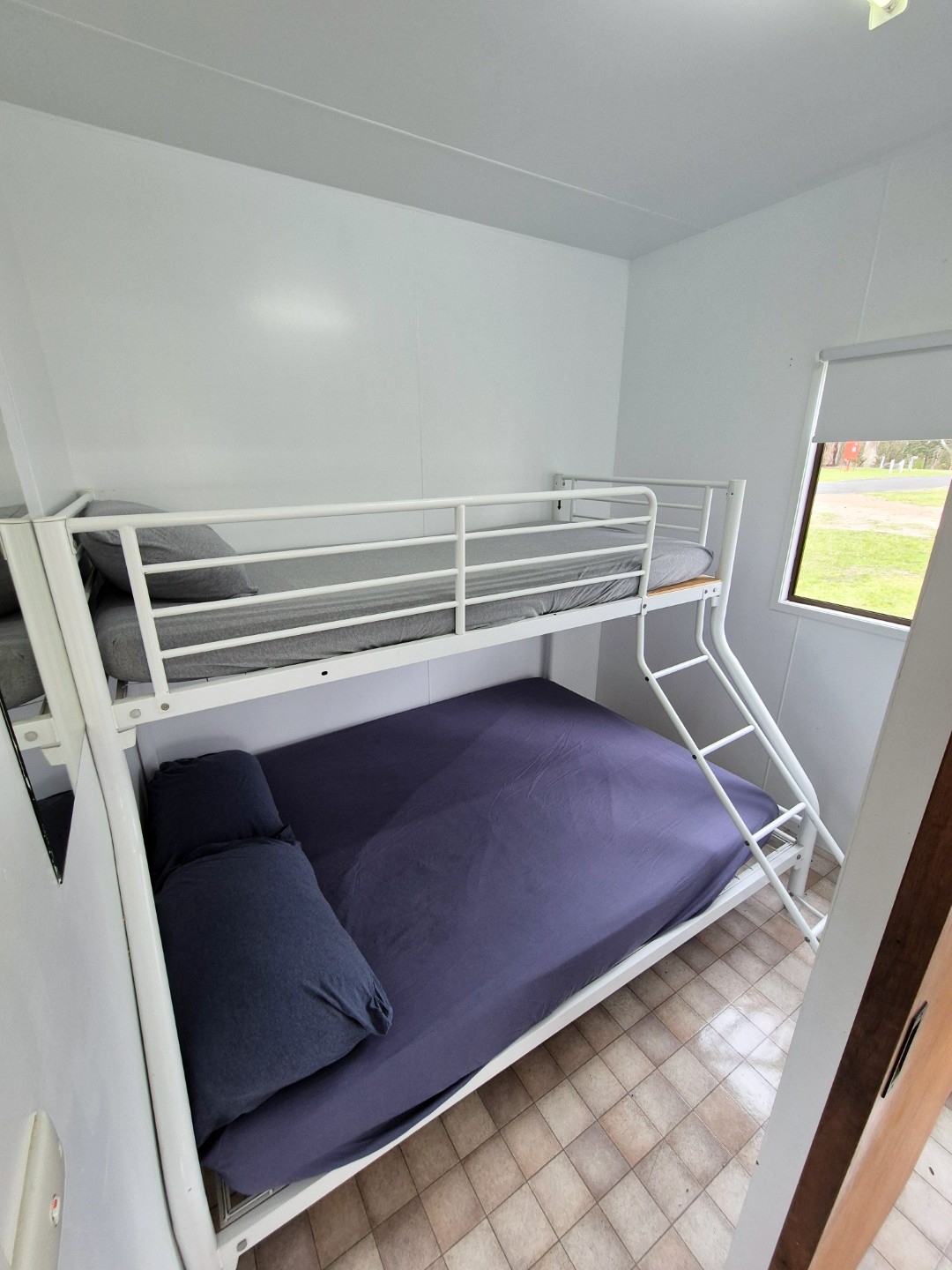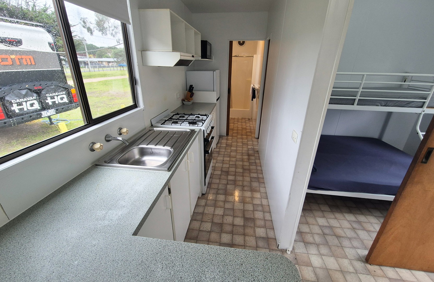 Our Lorikeet Cabins features a main bedroom with a queen bed and a second bedroom with a double bed and single bunk above. Linen and towels are provided. The open-plan lounge/dining area includes a bathroom, split system heating/cooling, TV, decking, and parking for one vehicle. The fully equipped kitchen has a stove, oven, microwave, fridge/freezer, and utensils. The cabins provide either a balcony with views of Lake King or a view of the natural Eagle Point Flora and Fauna Reserve.