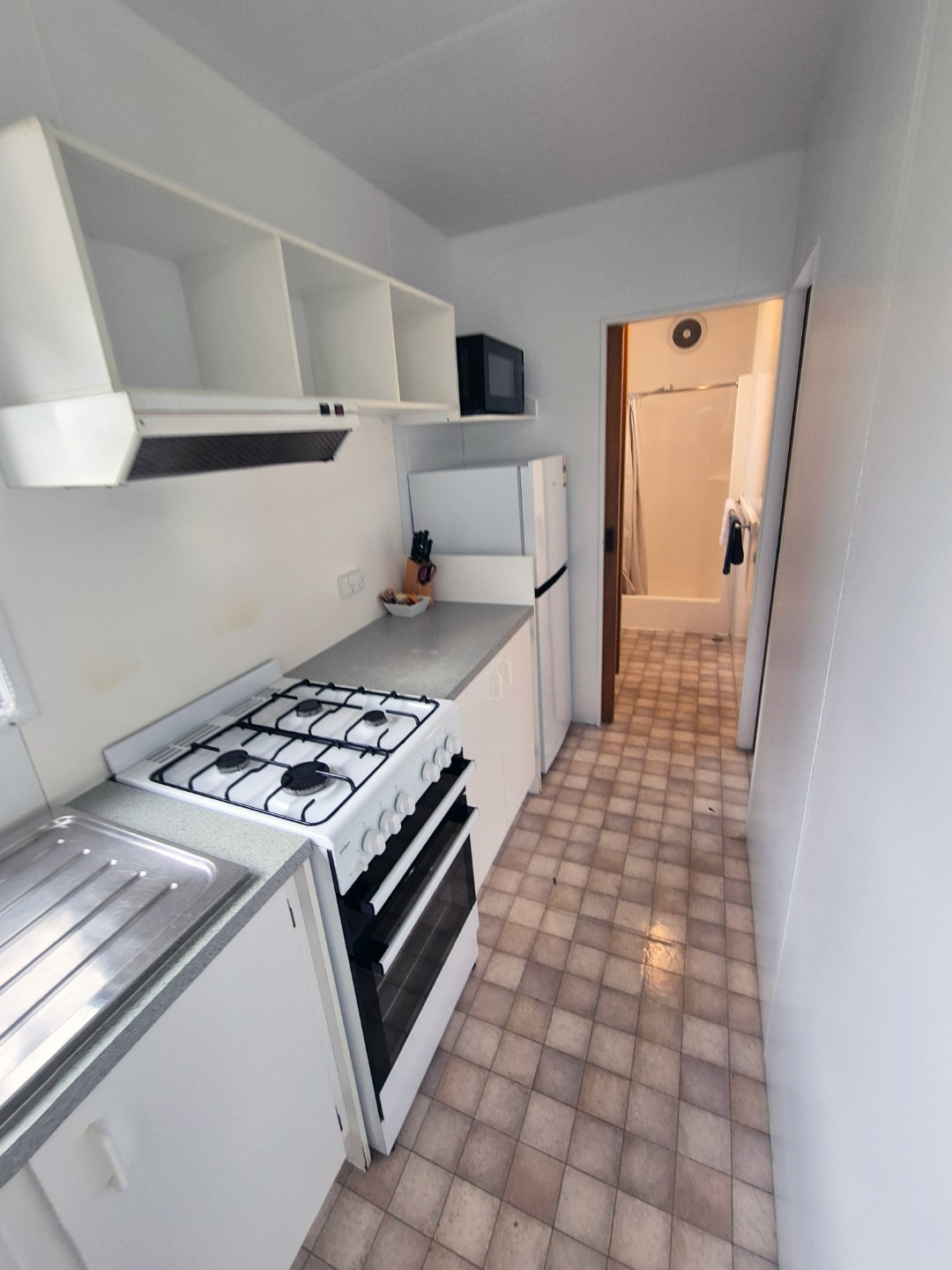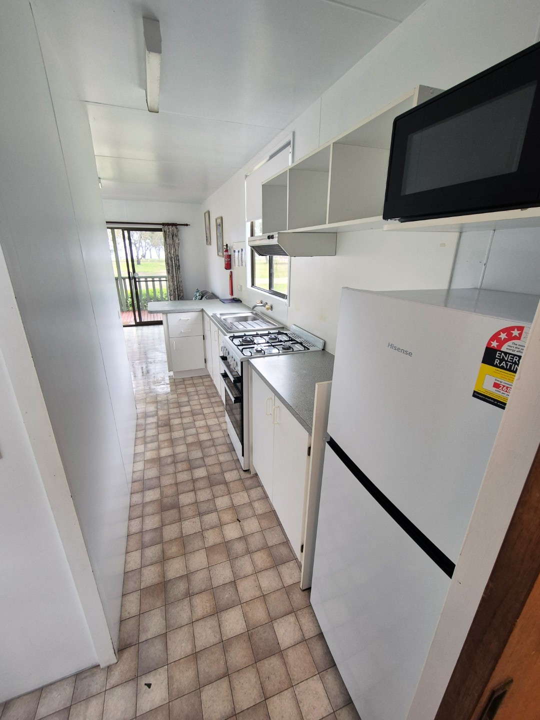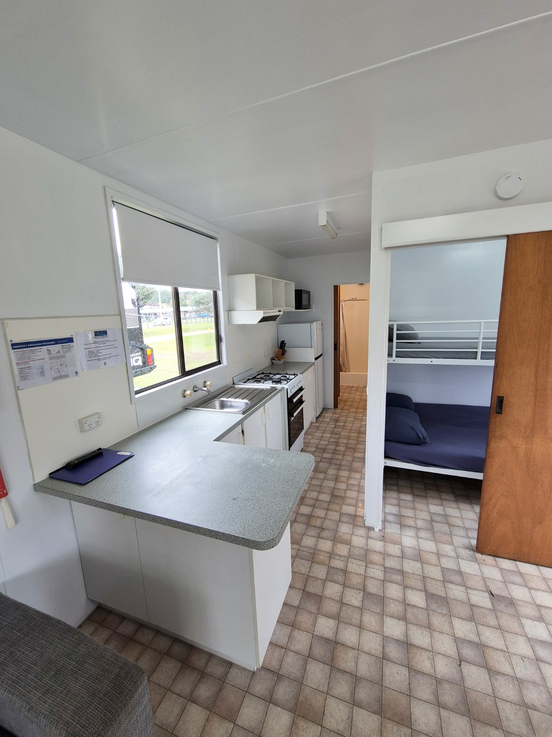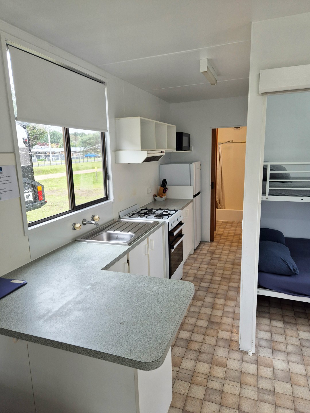 Our Lorikeet Cabins features a main bedroom with a queen bed and a second bedroom with a double bed and single bunk above. Linen and towels are provided. The open-plan lounge/dining area includes a bathroom, split system heating/cooling, TV, decking, and parking for one vehicle. The fully equipped kitchen has a stove, oven, microwave, fridge/freezer, and utensils. The cabins provide either a balcony with views of Lake King or a view of the natural Eagle Point Flora and Fauna Reserve.