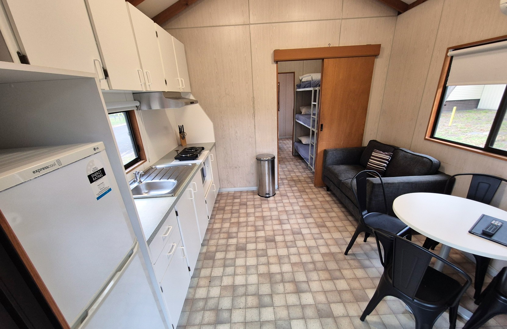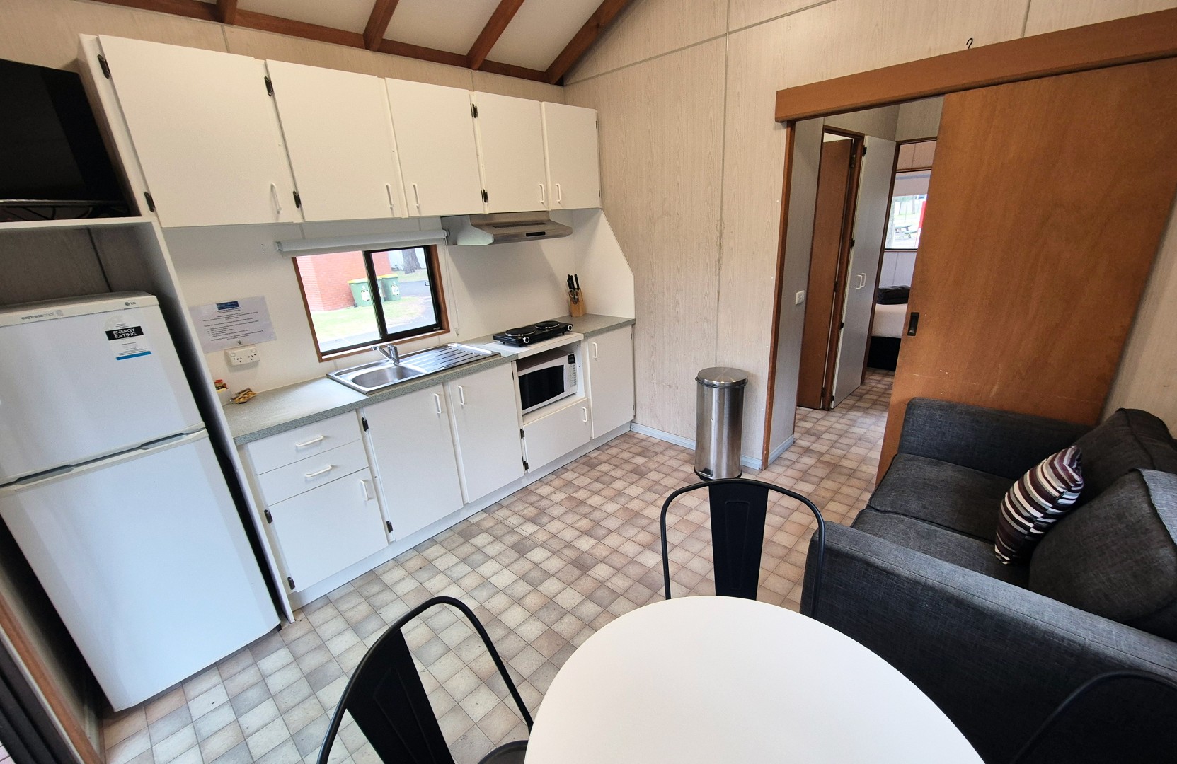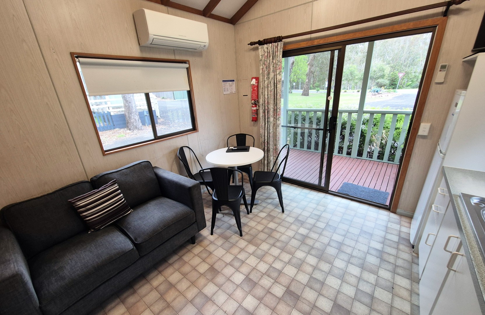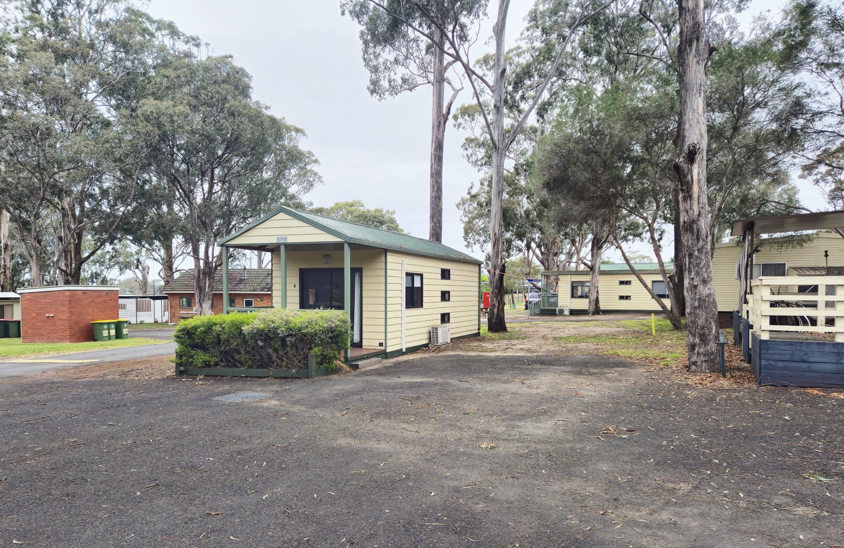 Our Rosella Cabins are fully self-contained budget cabins, set amongst native gum trees throughout the park. Each cabin features a main bedroom, private bathroom, and a hallway with bunk beds. Linen and towels provided. Enjoy a small front balcony and driveway parking. The open-plan living area includes a kitchenette with a twin hot plate, microwave, fridge/freezer, and utensils. Additional features include split system heating/cooling, a TV, and parking for one vehicle.
