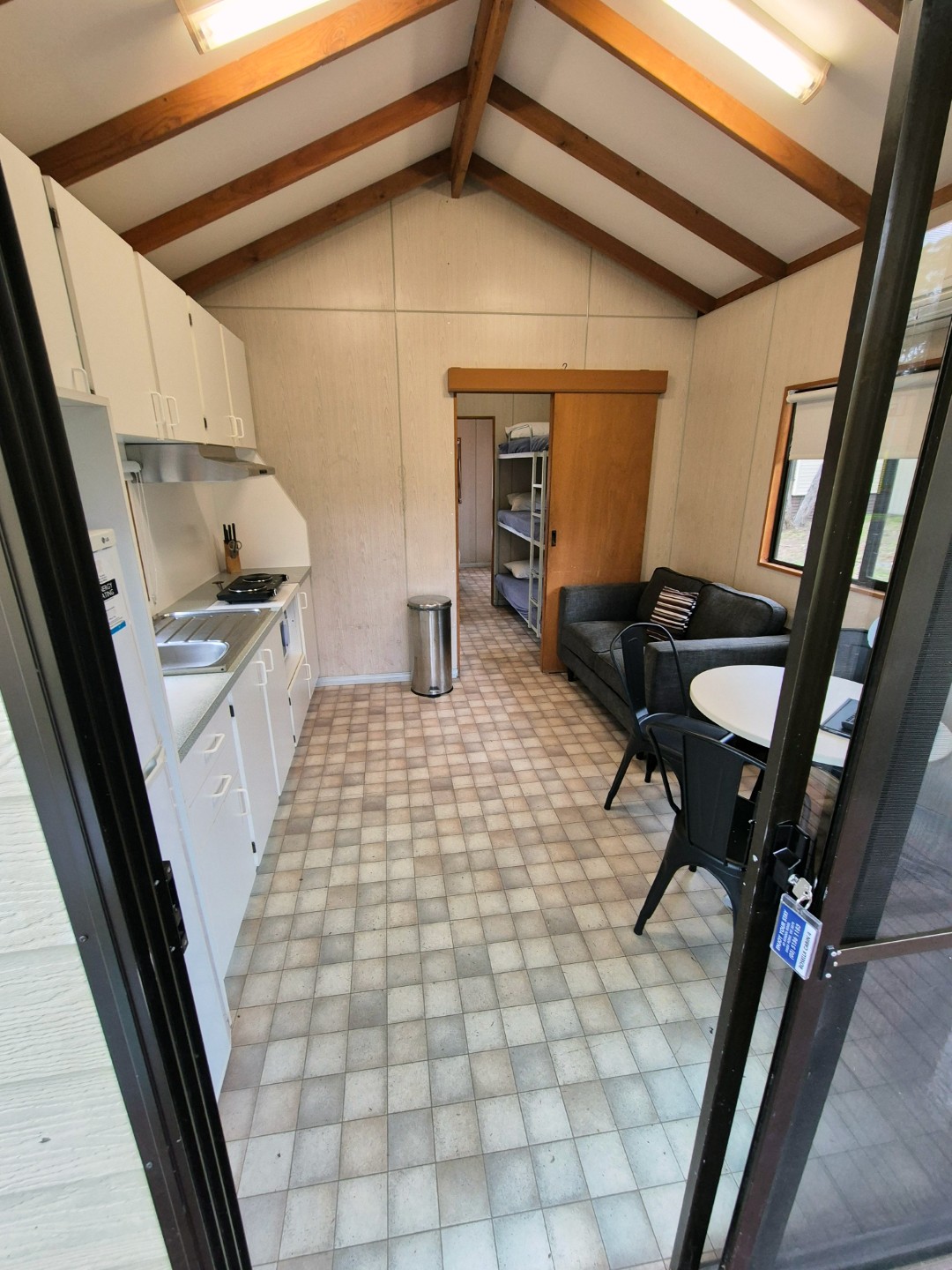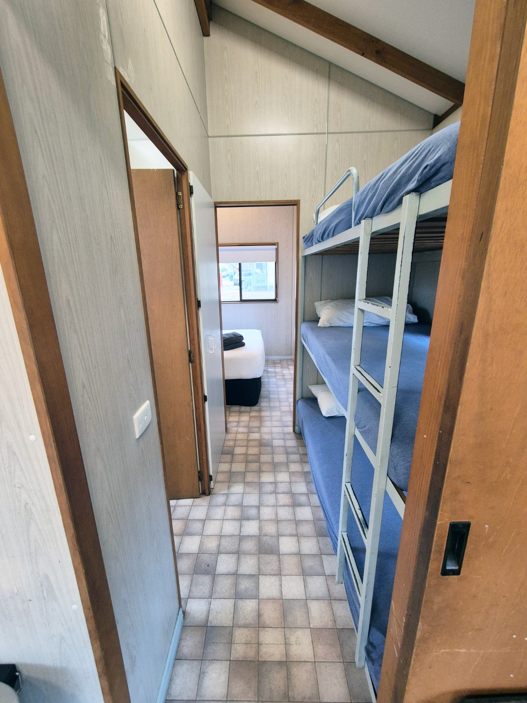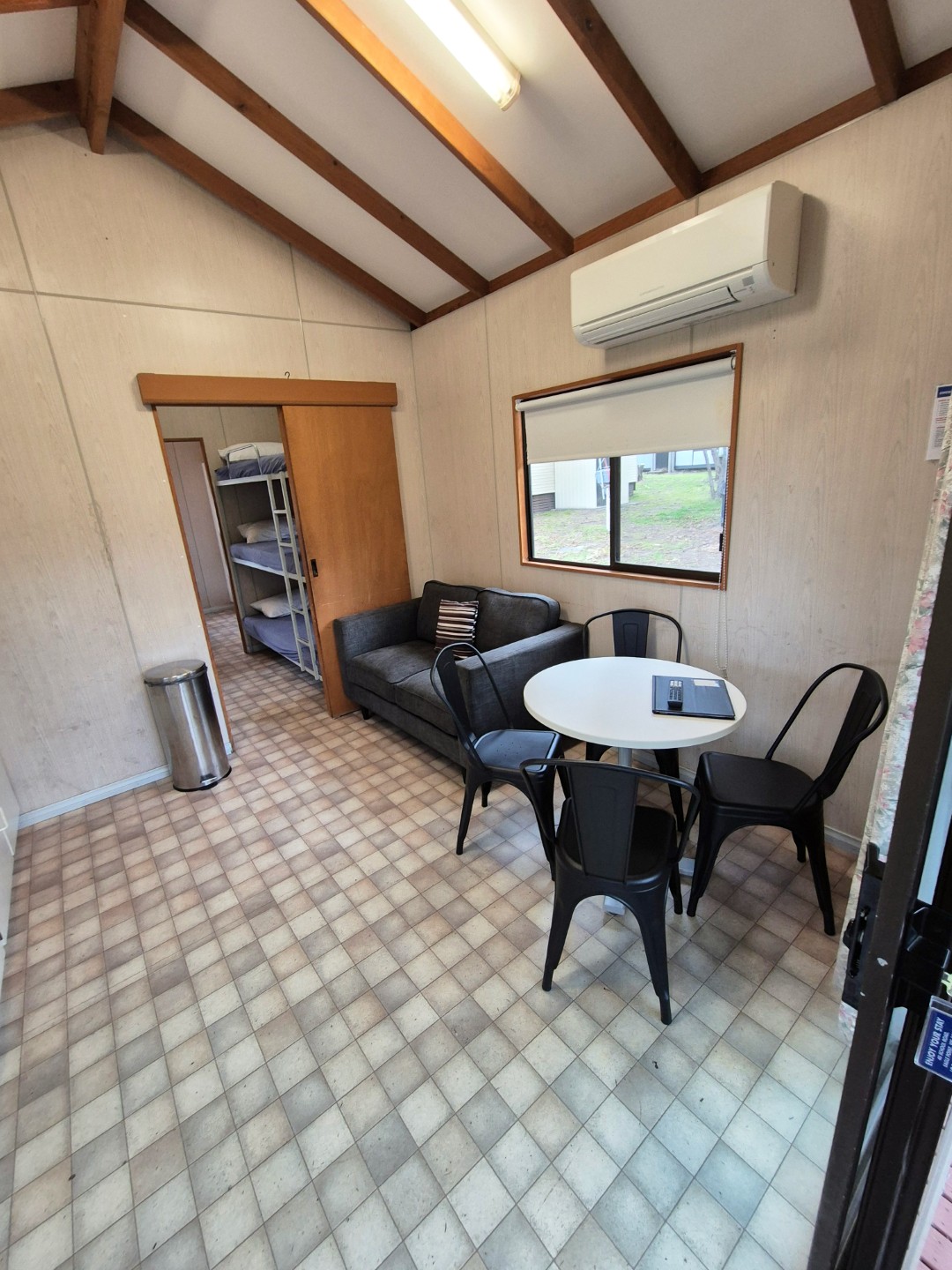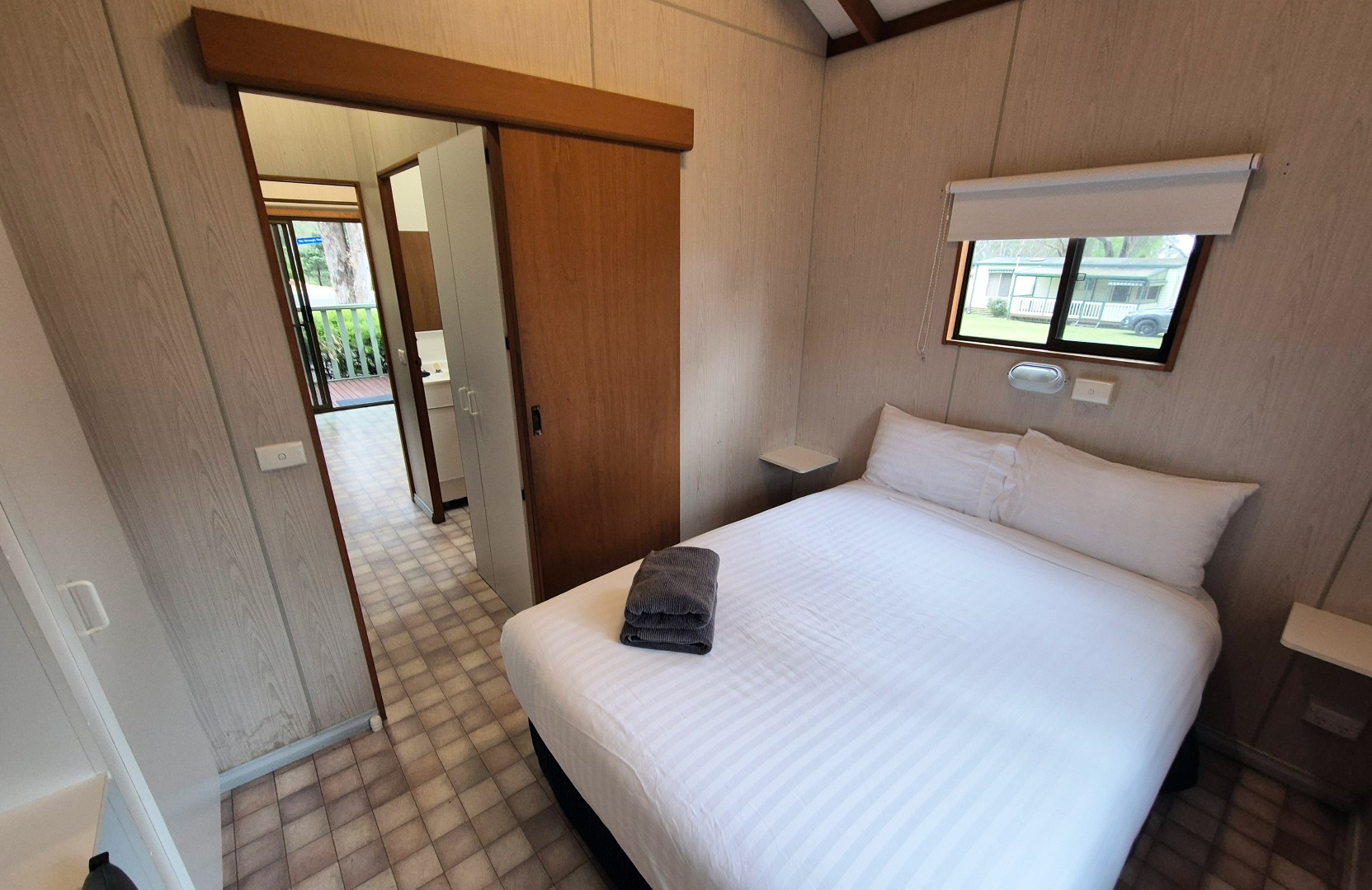 Our Rosella Cabins are fully self-contained budget cabins, set amongst native gum trees throughout the park. Each cabin features a main bedroom, private bathroom, and a hallway with bunk beds. Linen and towels provided. Enjoy a small front balcony and driveway parking. The open-plan living area includes a kitchenette with a twin hot plate, microwave, fridge/freezer, and utensils. Additional features include split system heating/cooling, a TV, and parking for one vehicle.