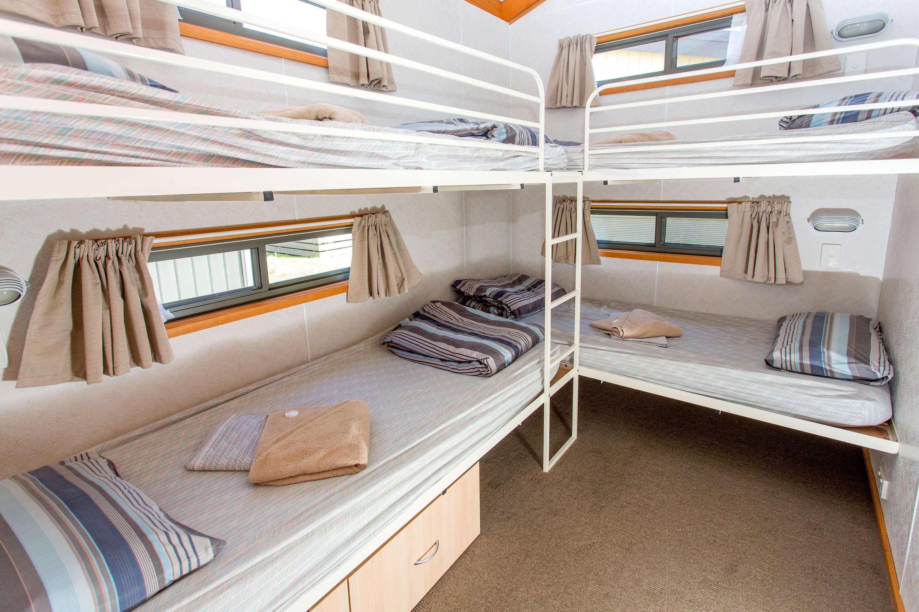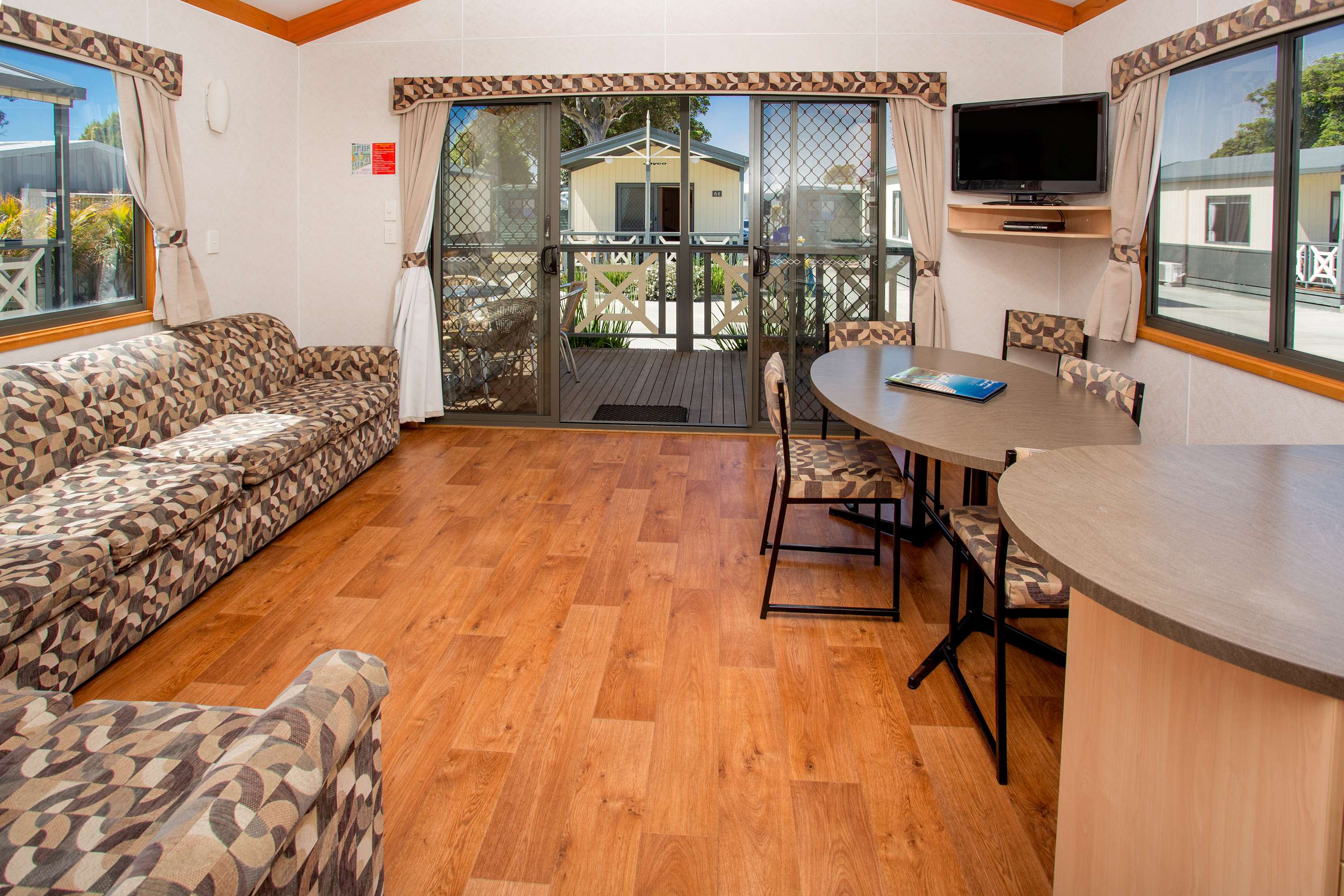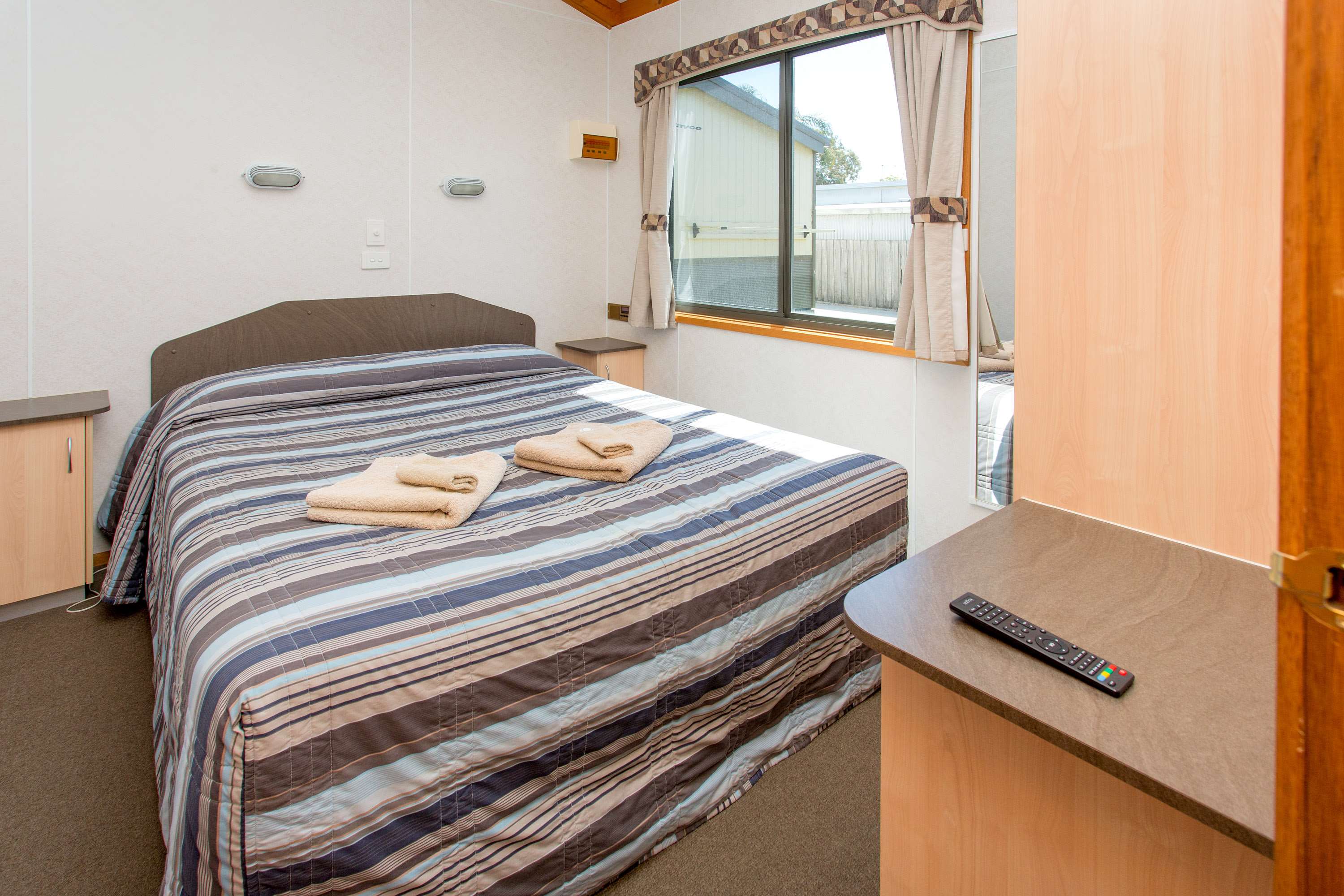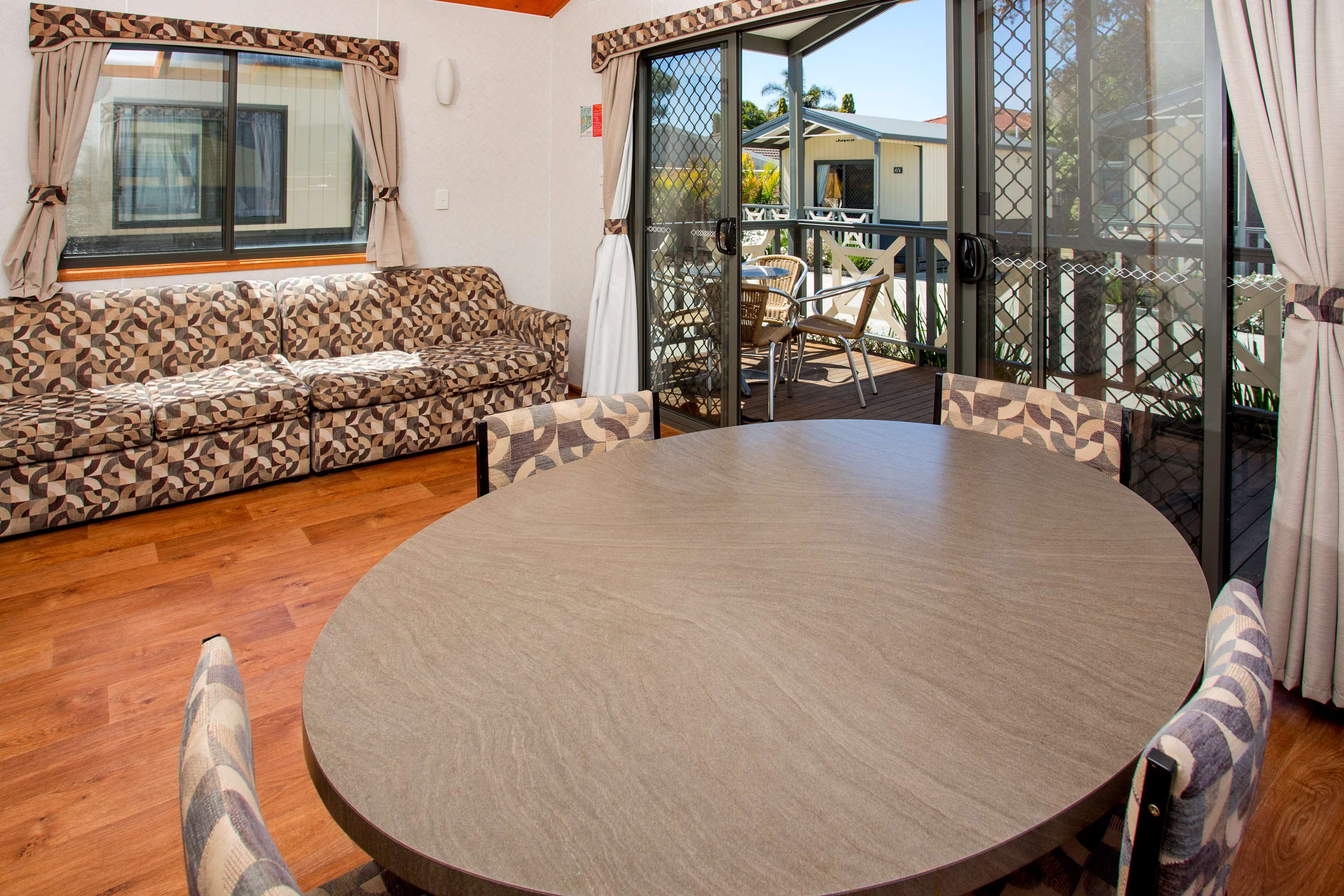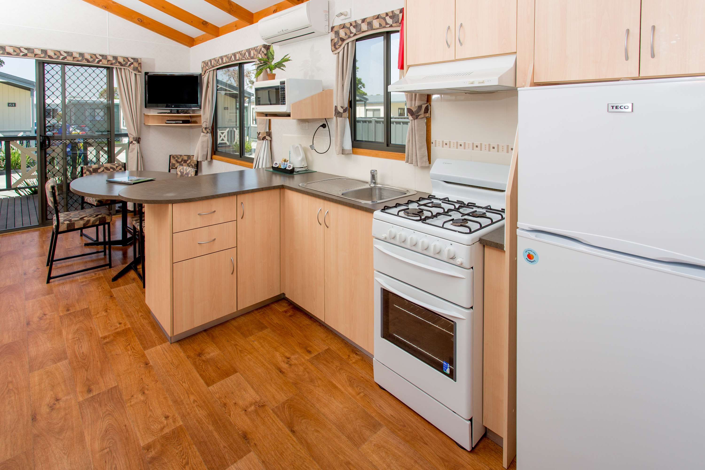 These spacious Villas have 3 bedrooms – a queen bed in main bedroom, a queen bed in the second bedroom and 2 sets of bunks in the third bedroom. Linen is provided all beds. Fully self contained including TV, fridge, stove, oven and microwave. North-facing verandah with outdoor setting.