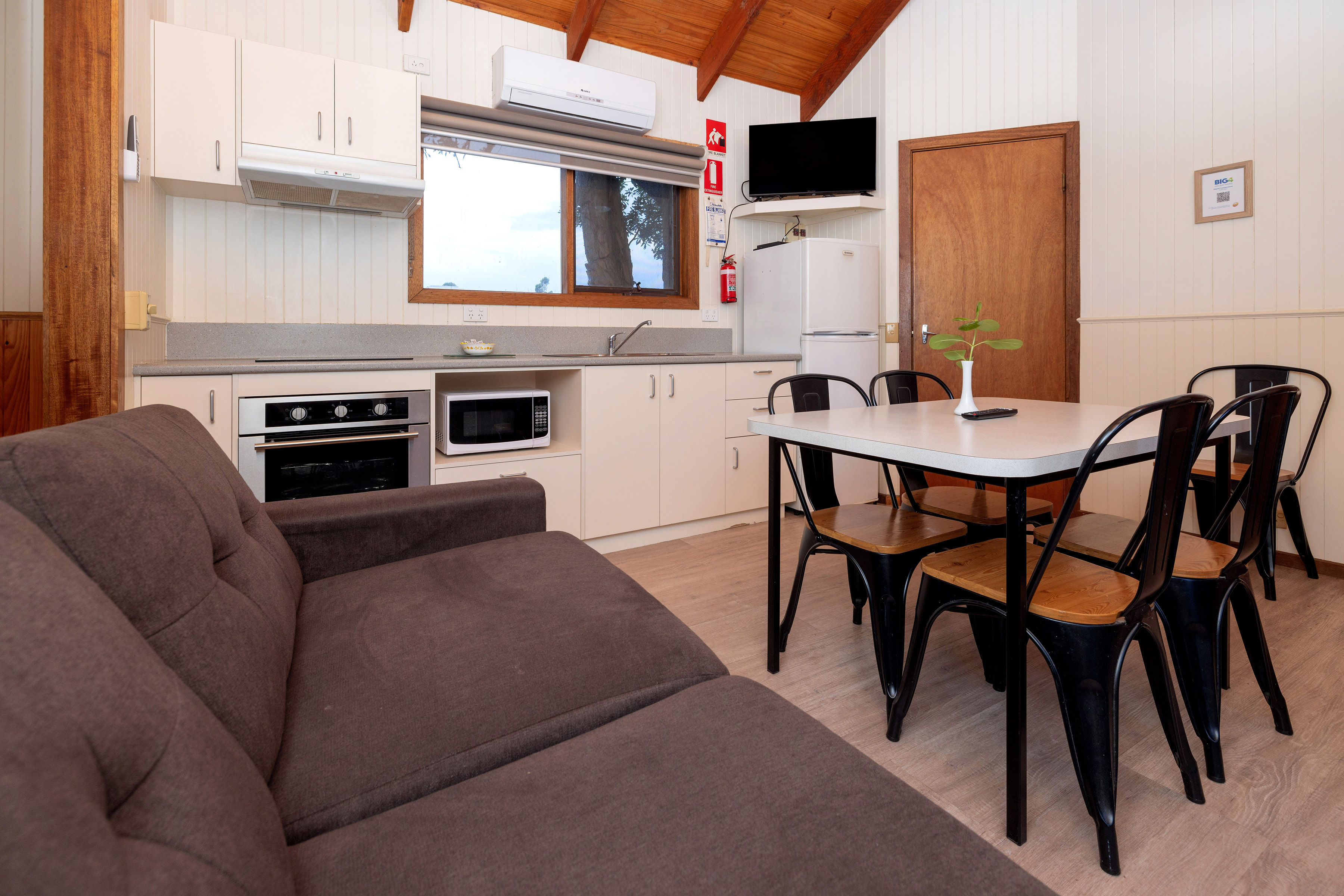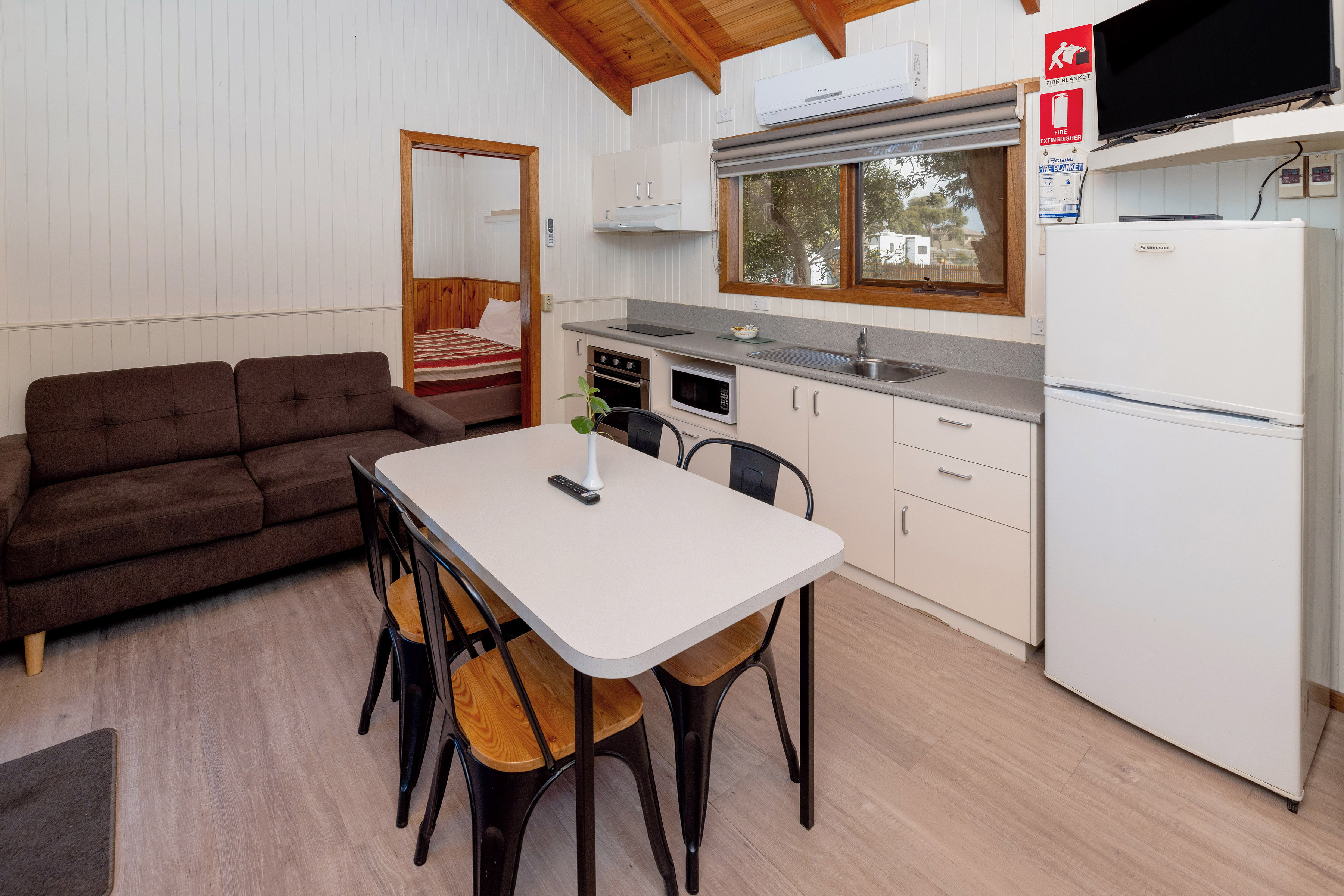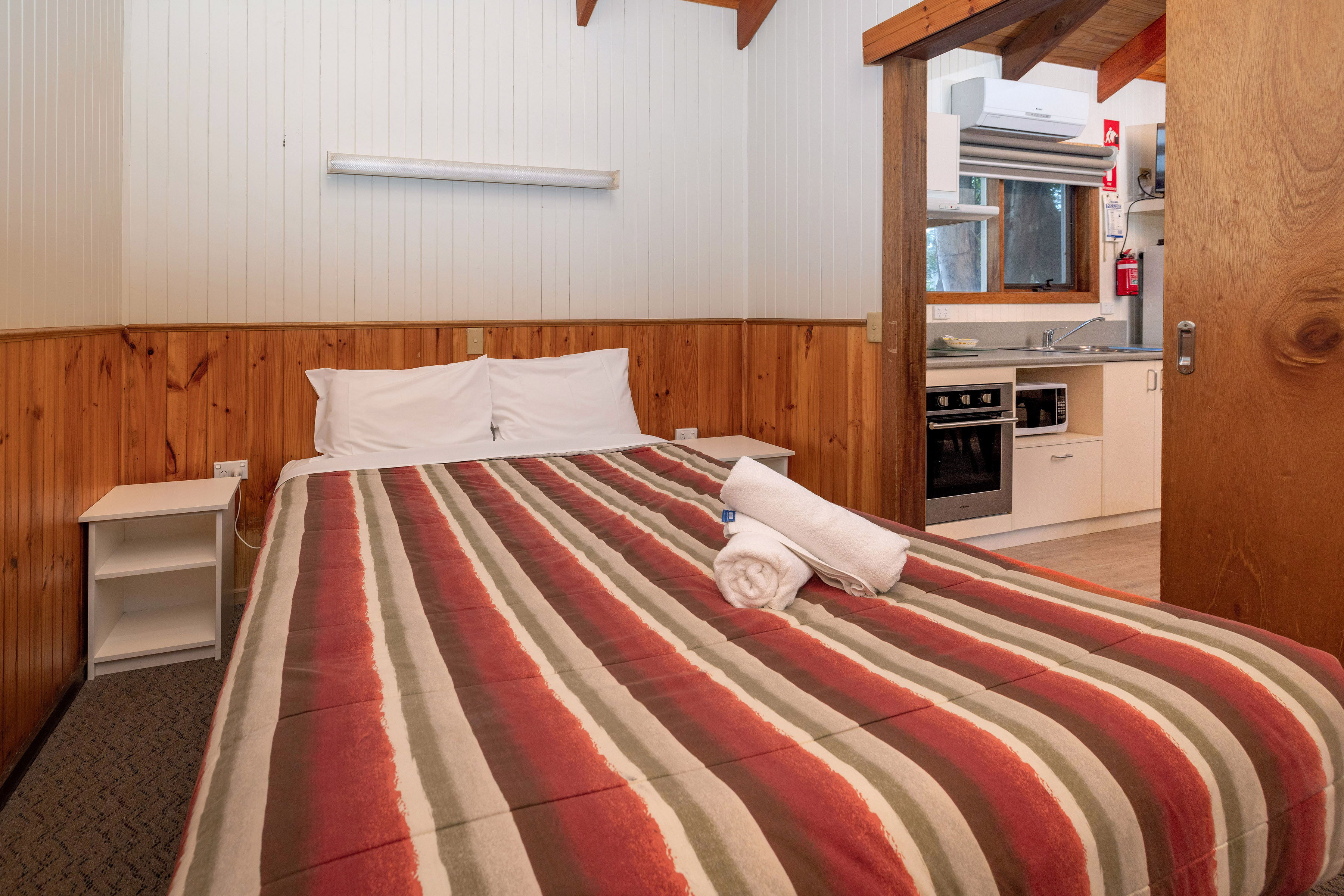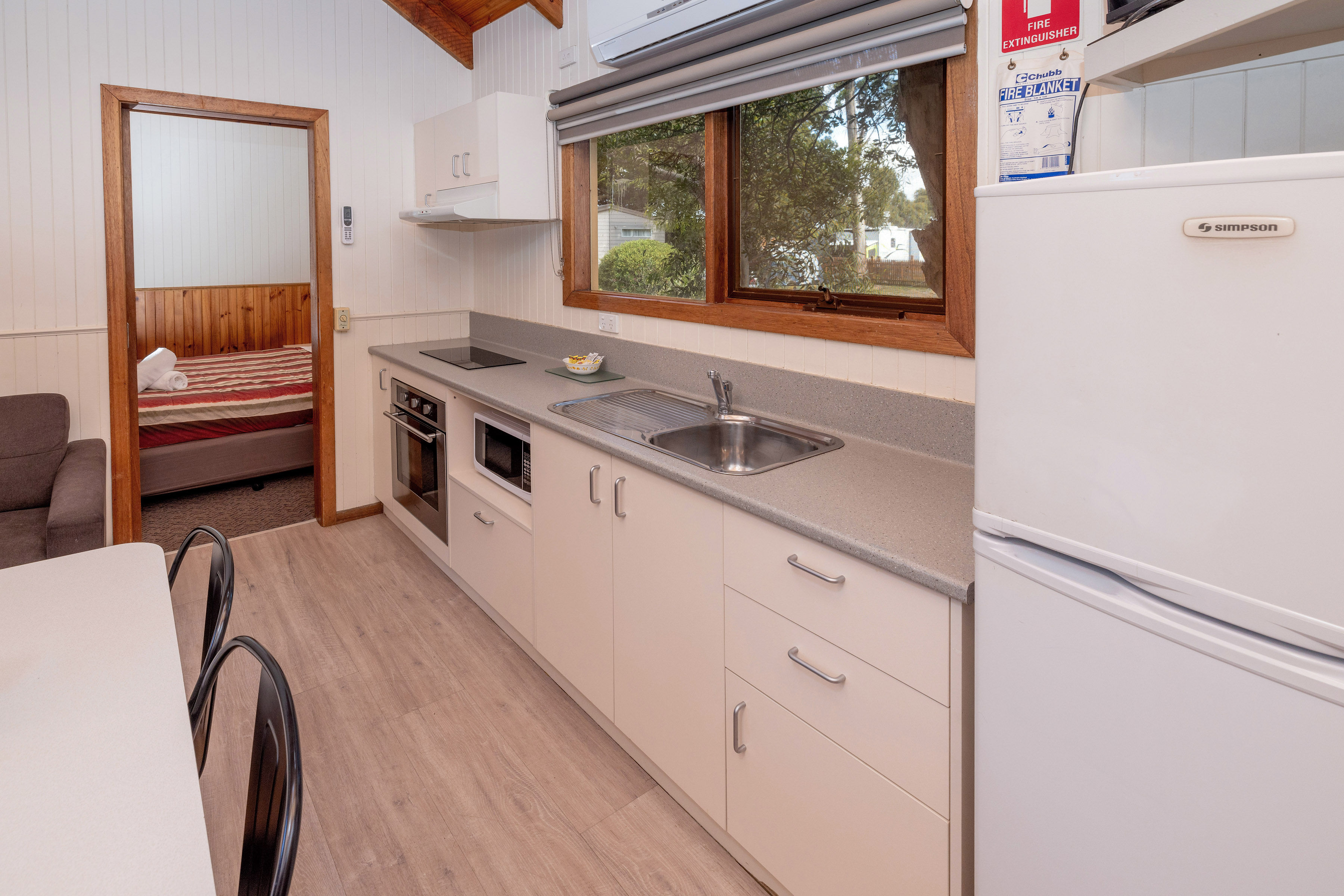 A fully equipped kitchen with cooking facilities including an electric bench top, cooker/grill, microwave and full-size refrigerator. Lounge/dining area offers a two seater sofa or two chairs, television, DVD player, reverse cycle air-conditioning and bathroom. Linen hire is available at $16 per bed for the stay.