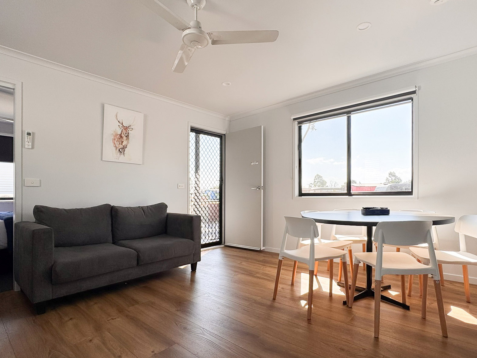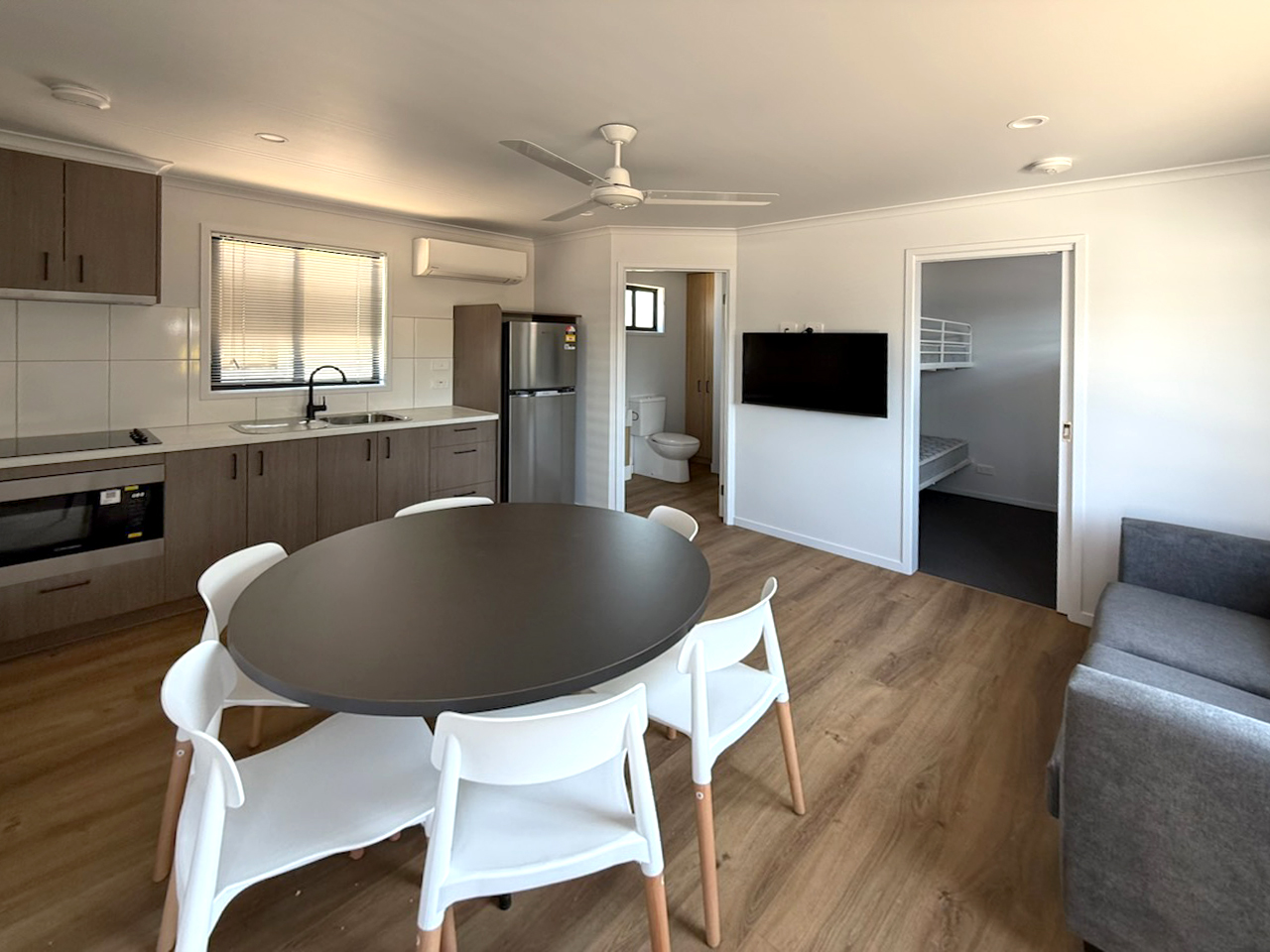 Our ultra modern, Classic Cabins offer an open plan and functional space which sleeps six across two bedrooms with open plan kitchen, living and dining space. Two bedrooms which accommodate one queen bed and two bunk beds (sleeps 4 children), this cabin is equipped to ensure the comforts to make your time enjoyable during your holiday.