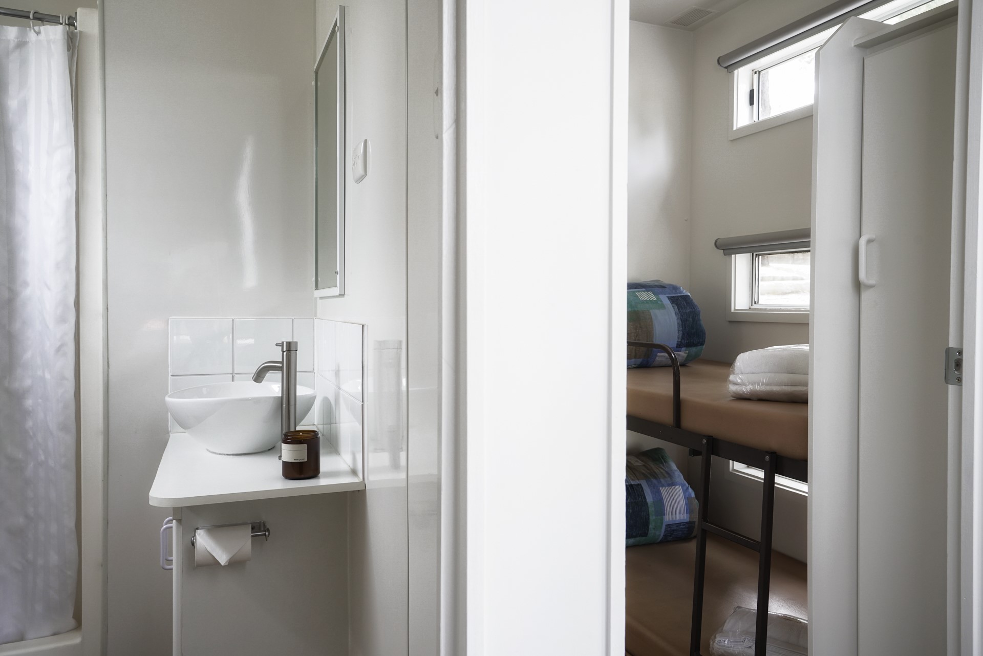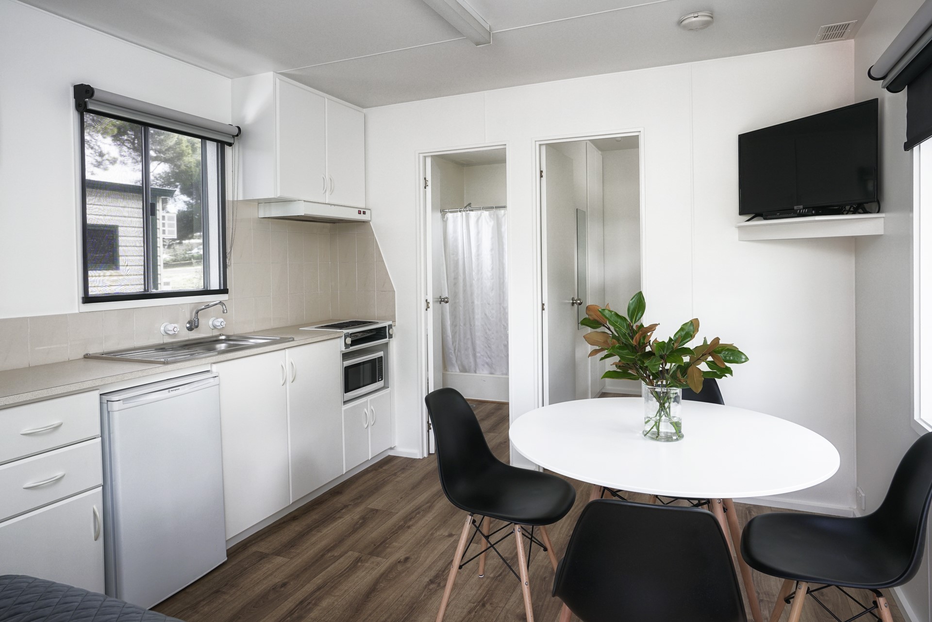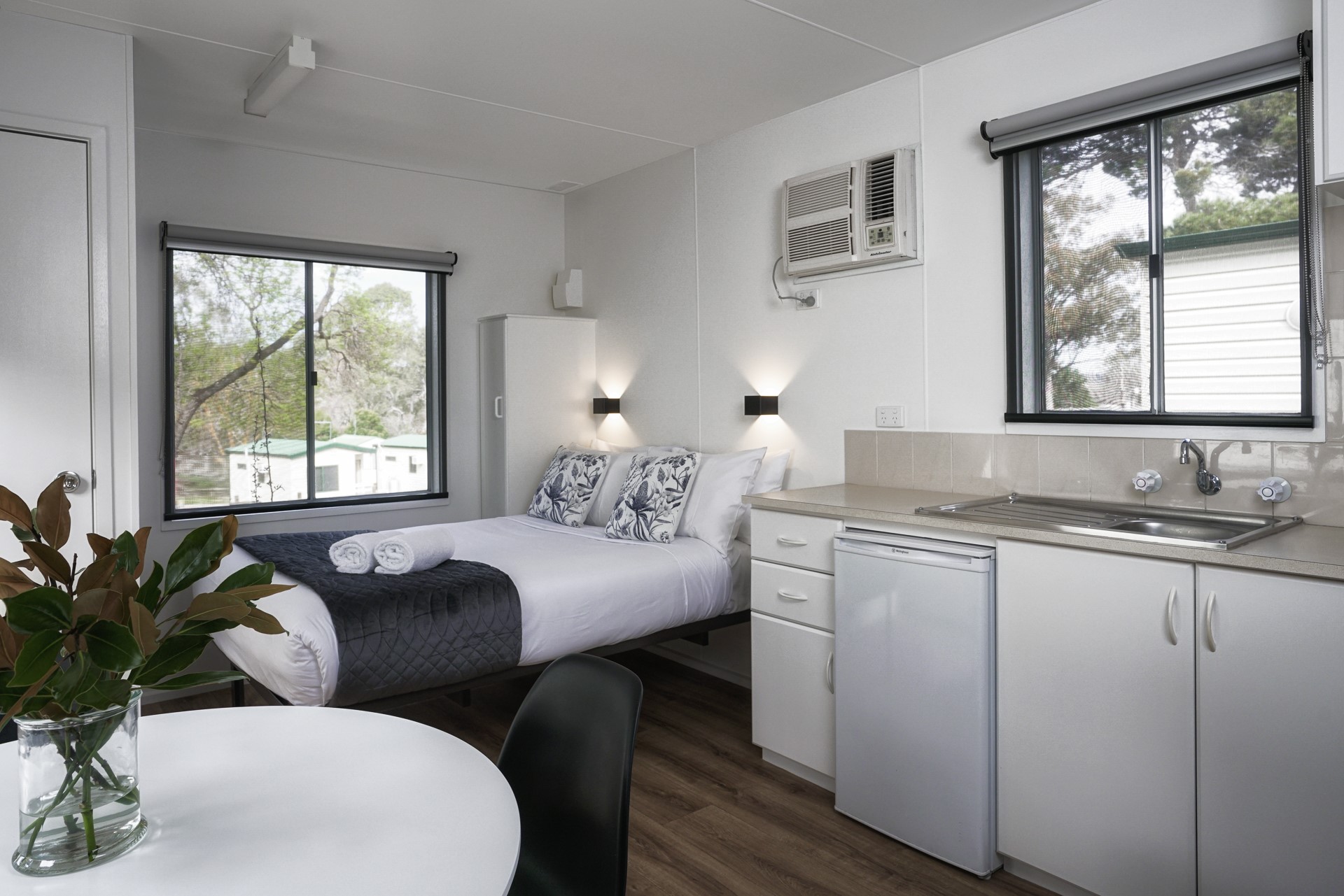 Our self-contained Double Studio is suitable for a couple or a family with up to two small children and has everything needed for a comfortable holiday. A double bed is located in the main room which also includes a kitchenette with a sink, stove top, microwave and small fridge/freezer, a dining table and chairs and a TV/DVD. A small adjoining bedroom has a double bunk bed and there is a separate bathroom with a shower over a half bath, a basin and toilet. All linen and bedding are provided and the cabin has air-conditioning and heating.
