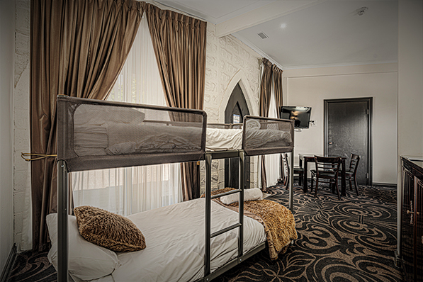 For the family who needs a little space, our Interconnecting Family and Queen Room are perfect. The Room, located inside the Castle walls, have an amazing king and bunk bed in one room and a queen bed in the other. Each Room offers an 40" TV, free wi-fi, tea and coffee making facilities, split system air-conditioning, fridge, microwave, toaster, hand woven European Tapestries. There is a spa bath in the Queen Room and a shower in the Family Room, with adjoining door to close off the rooms if you so wish. Children under the age of 3 are free if sleeping in the same bed as parents.