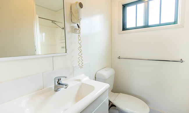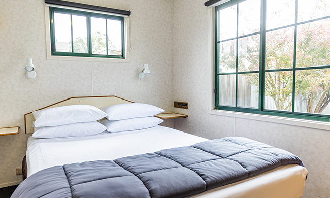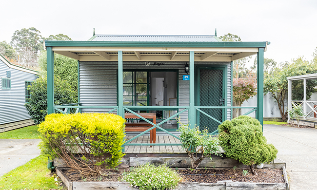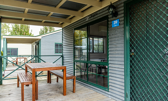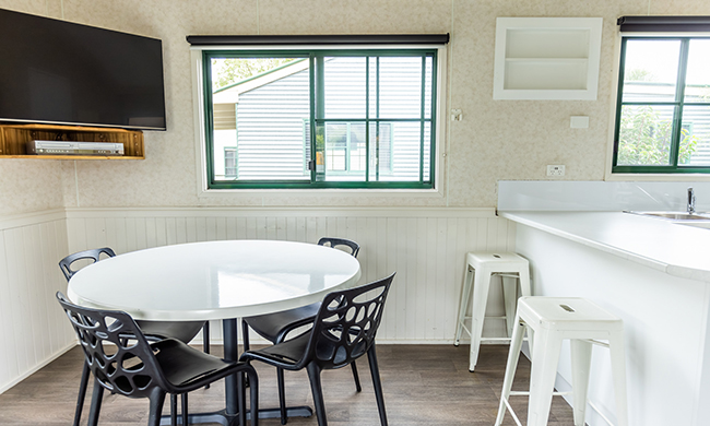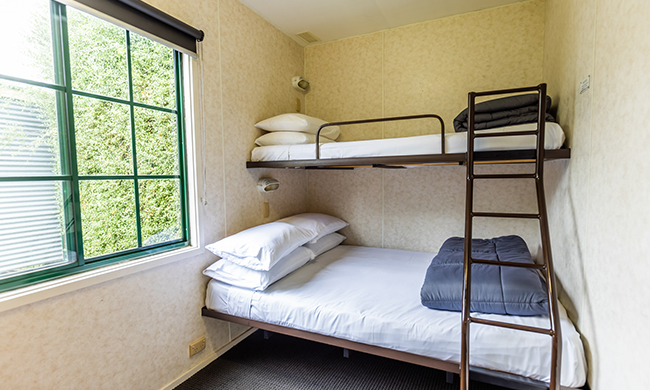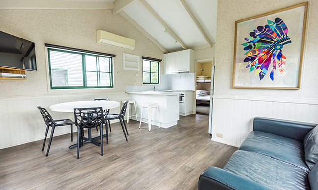 Located by the entry to the park within close proximity to key park facilities. One queen, one double with single bunk over top. Features air-conditioning; heating; full kitchen with stovetop, microwave and fridge lounge and dining room; TV and DVD; one bathroom; verandah with outdoor furniture.