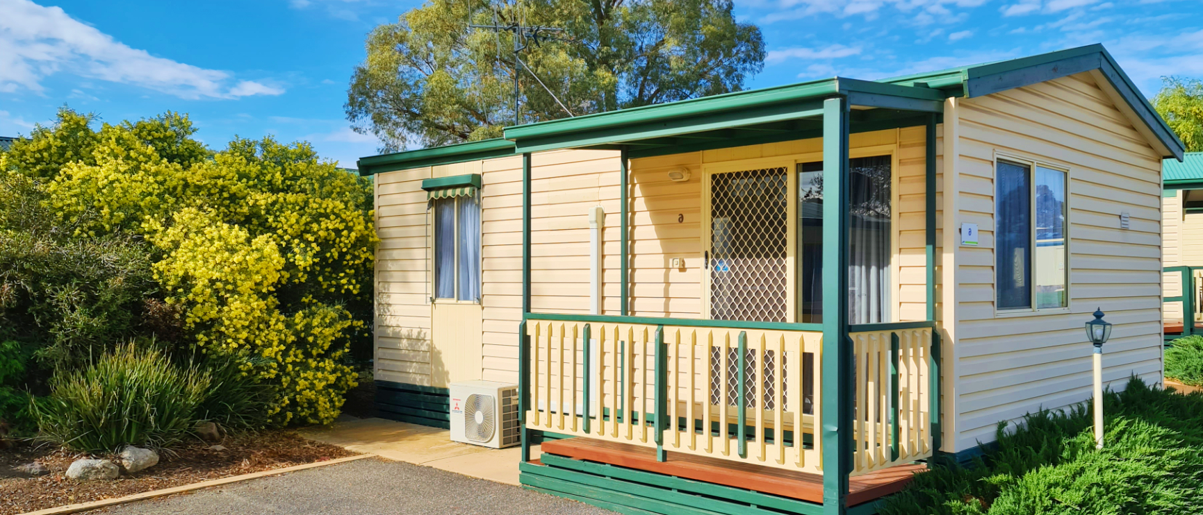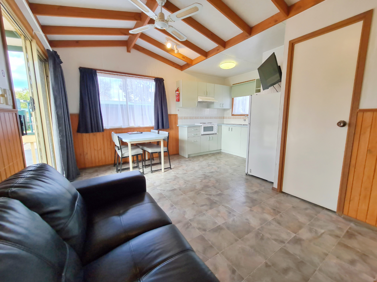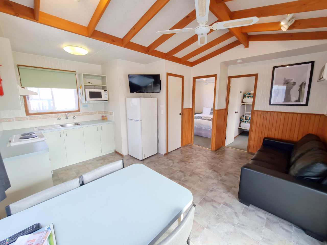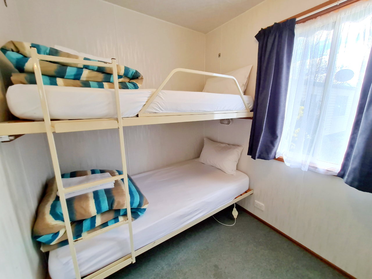 This 2 Bedroom cabin has a queen bed and 1 set of single bunks with all linen supplied for your convenience.