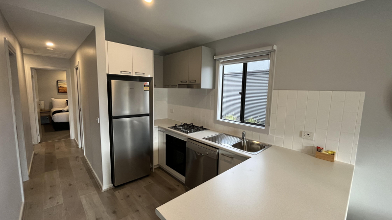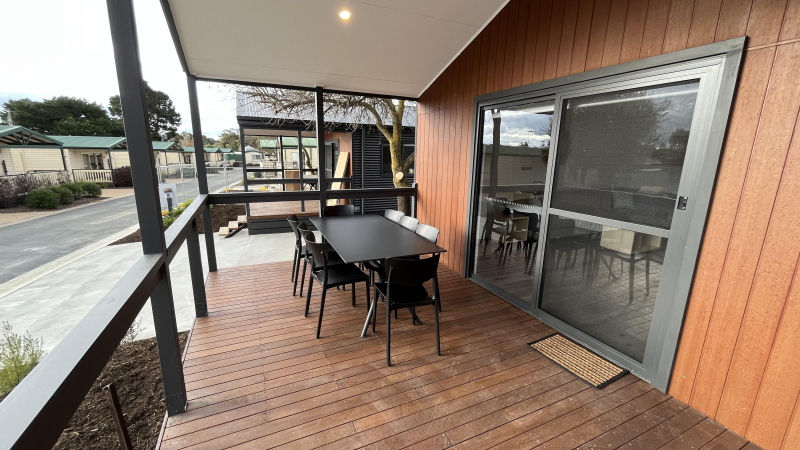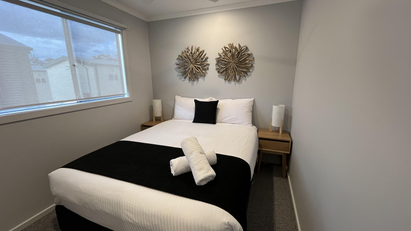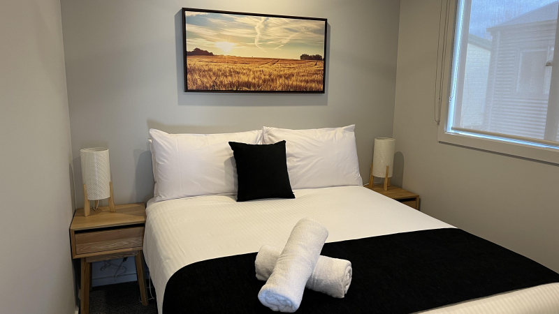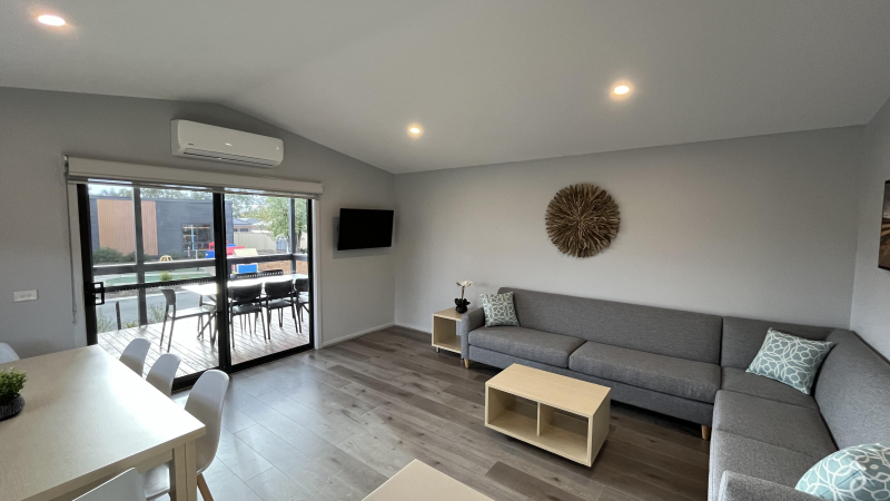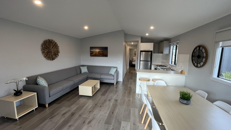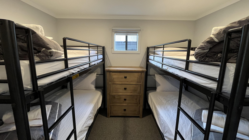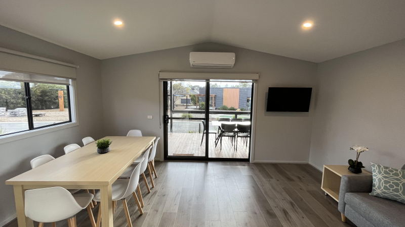 A spacious, fully self contained cabin is your home away from home. Offering 3 bedrooms 1 bathroom and 2 toilets, this cabin is perfect for a large family, couples sharing or time away with friends. Sleeps 8 with a queen bed in the main bedroom, queen bed in the second bedroom 2x sets of bunks in the third bedroom. All with linen and towels supplied for your convenience. Dining is a breeze with full size oven, microwave, big fridge and dishwasher. Entertainment is taken care of with a large flat screen TV in the living room. Electric blankets are available to lower beds.
