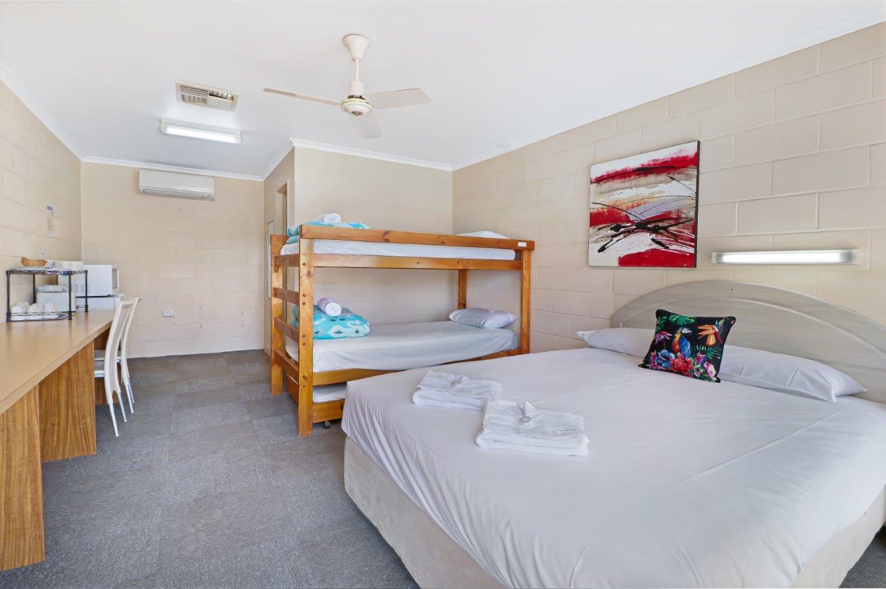 Enjoy our comfy motel-style accommodation! It features a queen bed, bunks, and a trundle. You'll love the ensuite and kitchenette, complete with a microwave, toaster, and tea and coffee facilities. Plus, there's a 32" LCD TV and an iPod/iPhone dock to keep you entertained, all in a cozy space with split system air conditioning.