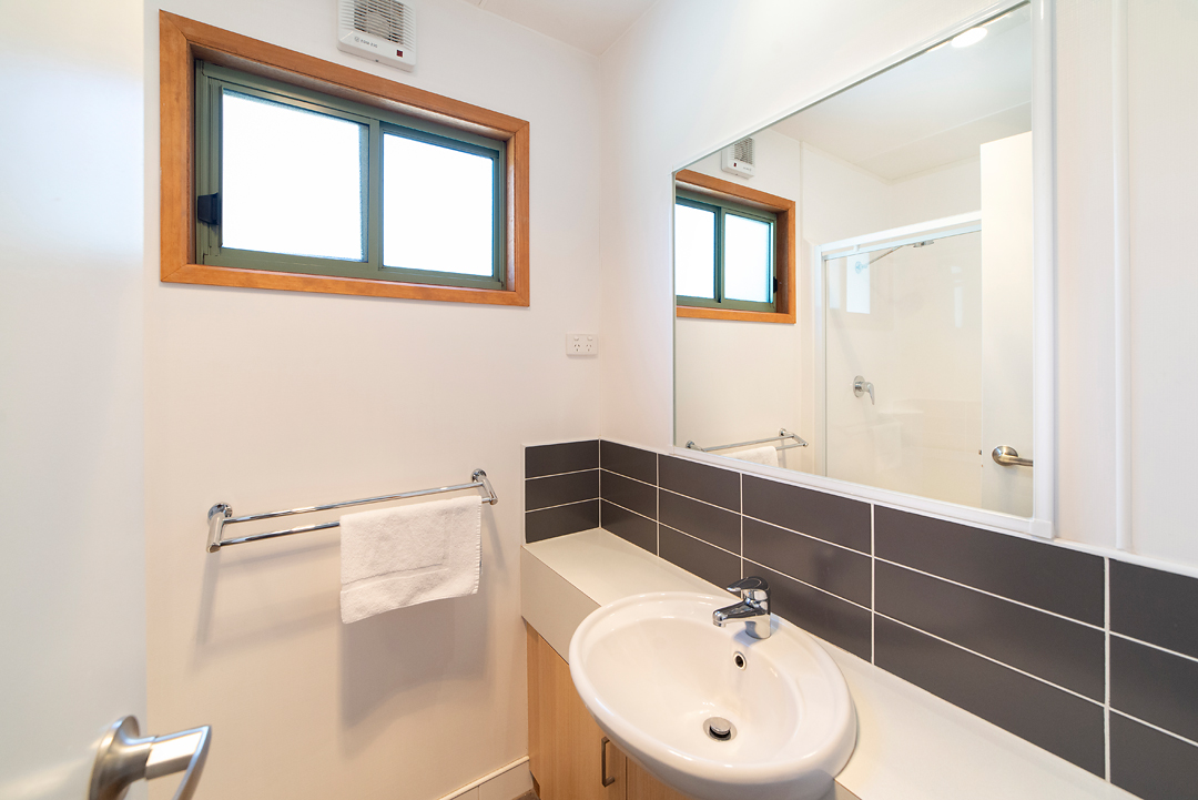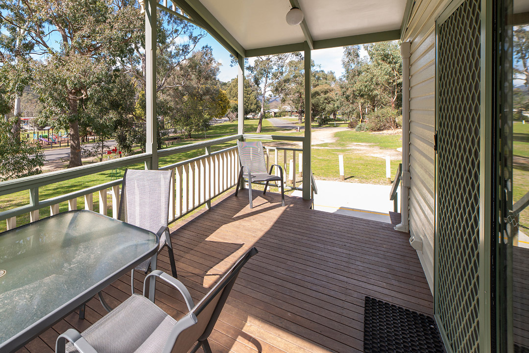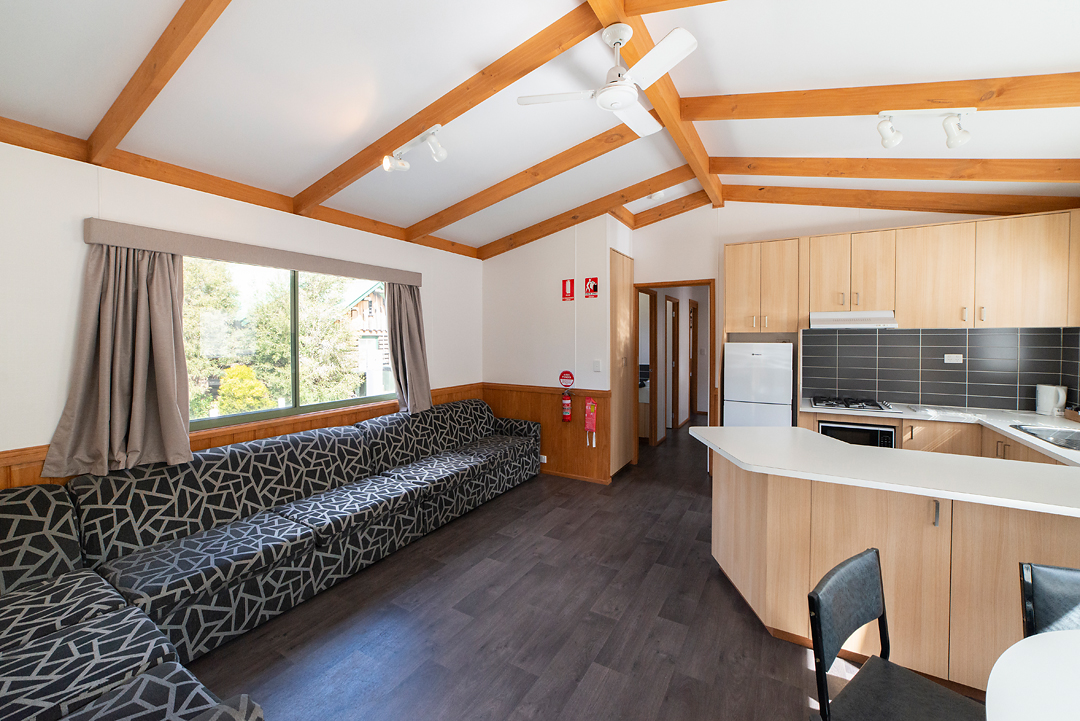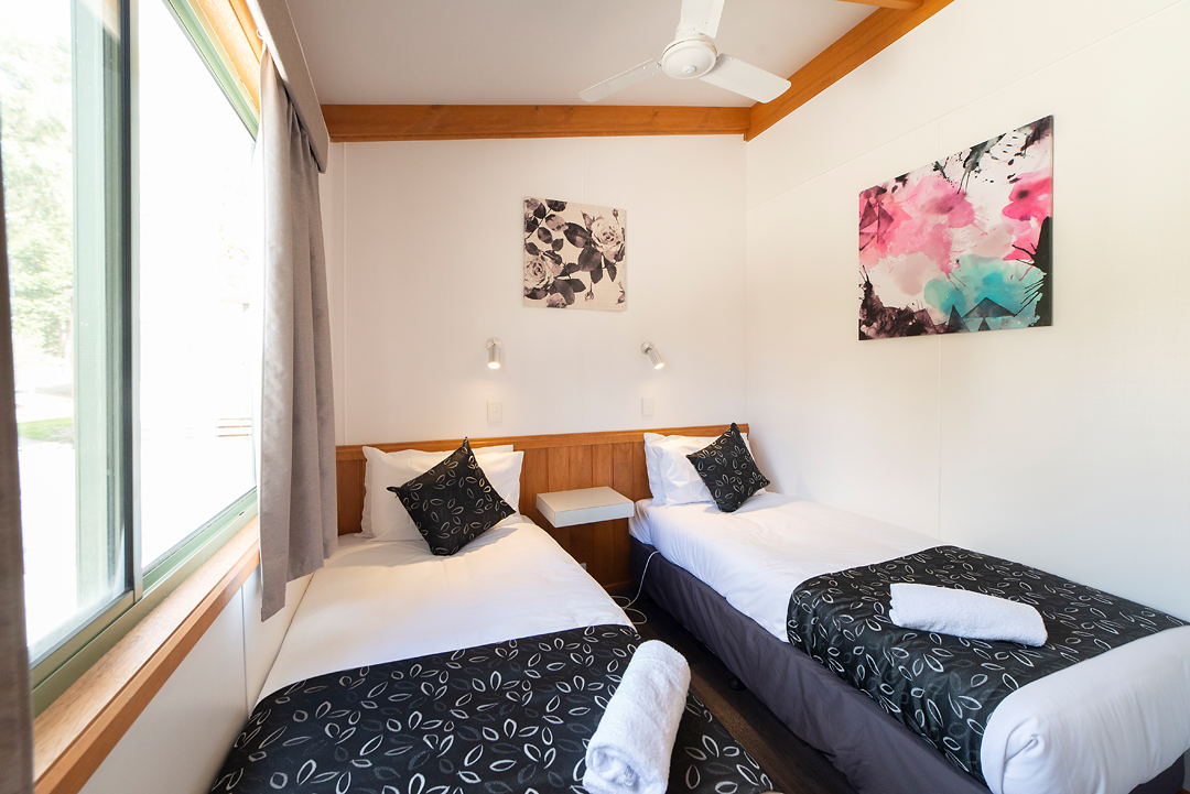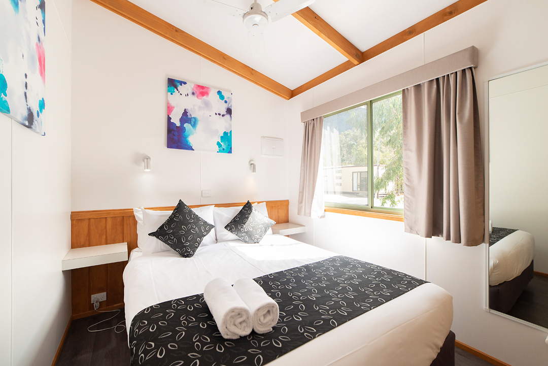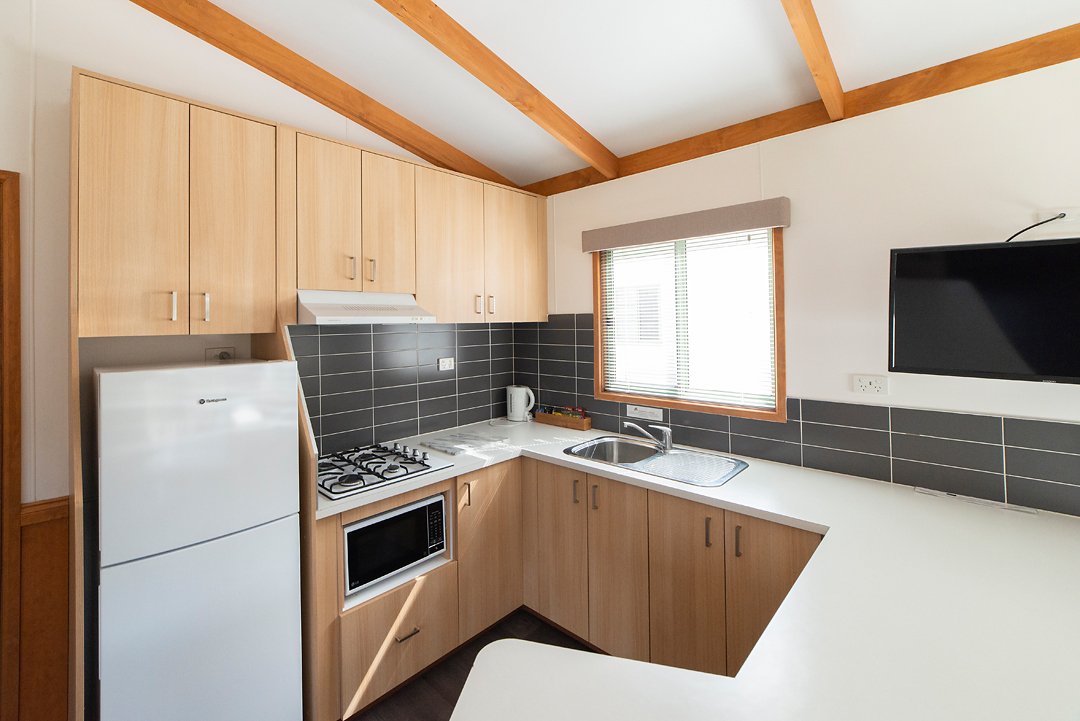 The cabin has a self-contained kitchen including a fridge, microwave, stovetop, air fryer and plenty of crockery and cutlery with a dining area, and a TV in the living area. The bathroom in the cabin includes a shower, toilet and vanity. The cabin is air-conditioned for your comfort.