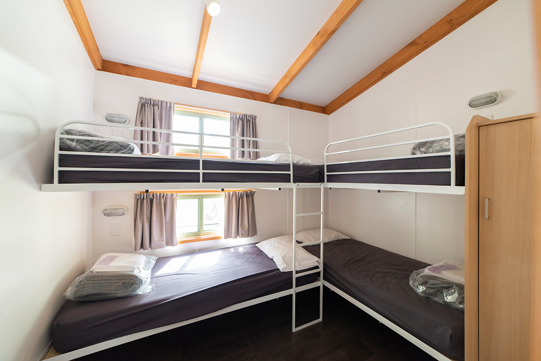 The open-plan cabin offers a queen bed in the main bedroom, two single beds in the second bedroom and two sets of bunk beds in the third bedroom.