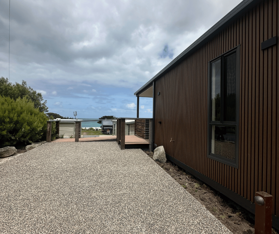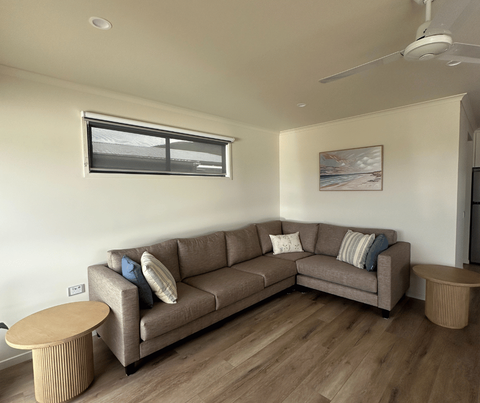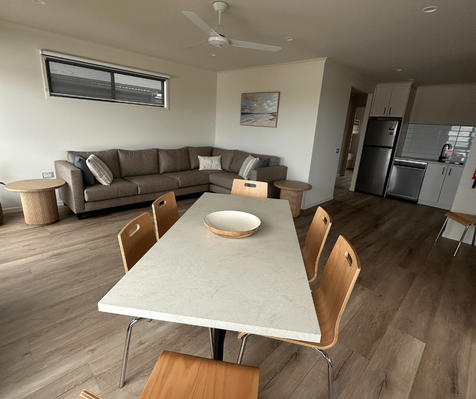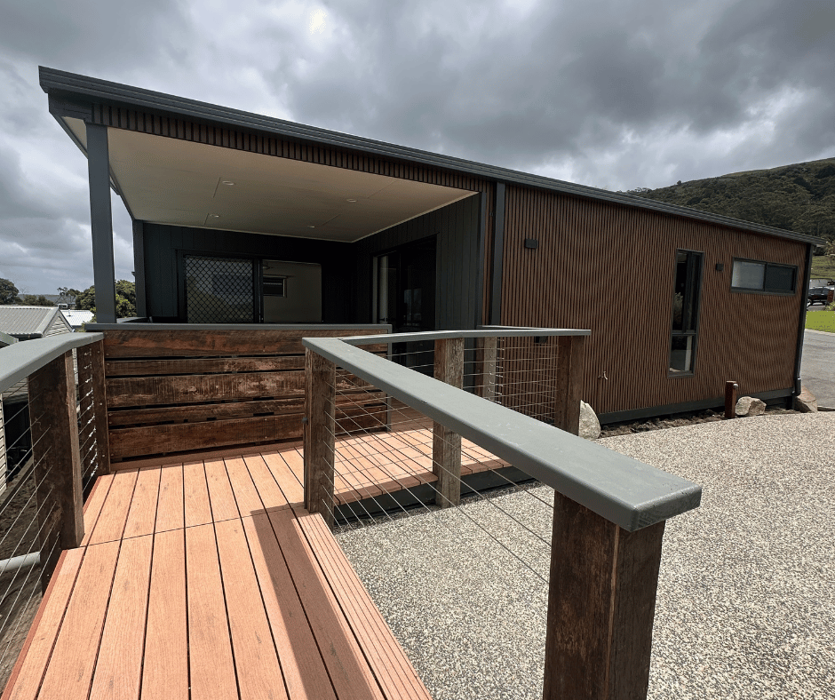 The cabin is fitted with all the modern essentials, including air-conditioning, a full kitchen with dishwasher, oven, stovetop, microwave and fridge, and televisions in both the living area and master bedroom. Ramp entry from the parking bay, accessible light switches and powerpoints, and wide internal spaces ensure comfort and ease throughout the cabin.