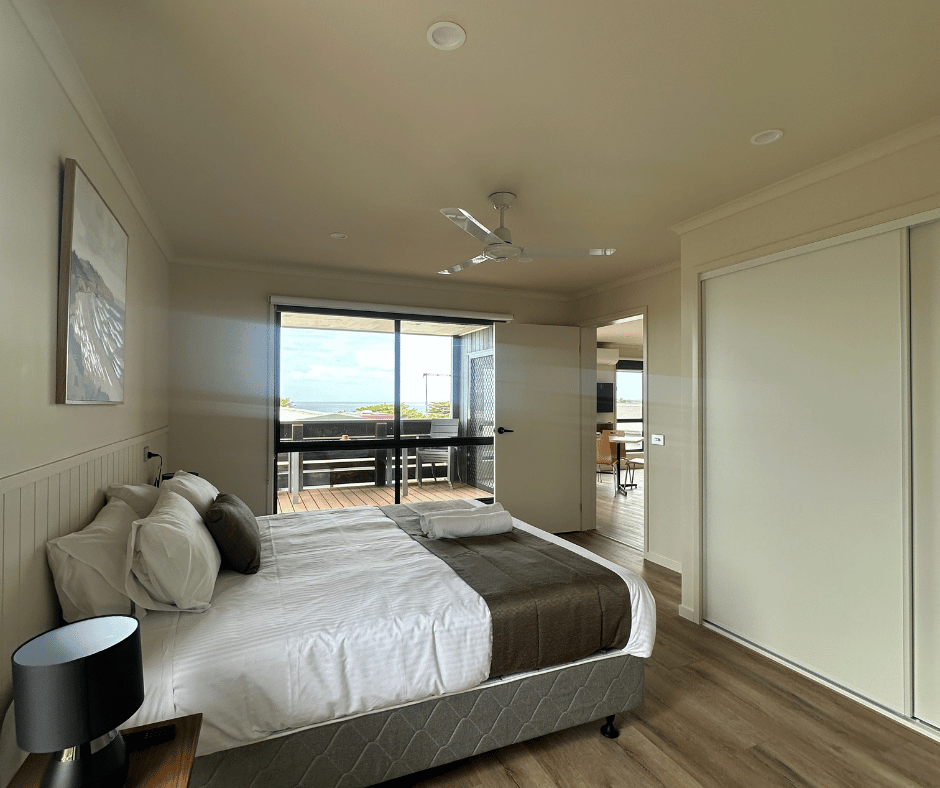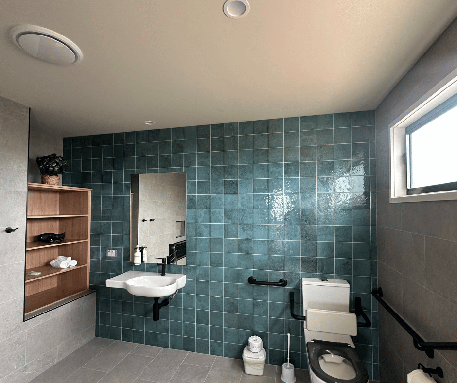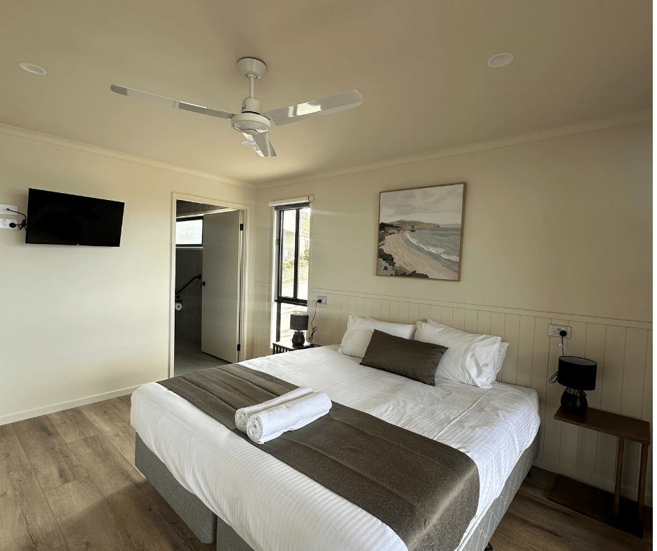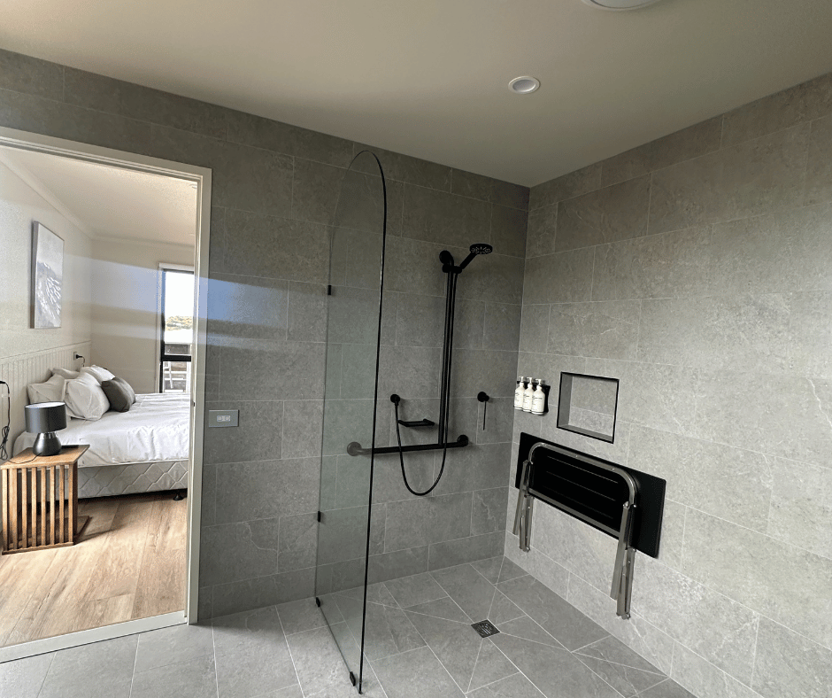 Designed for comfort, space and accessibility, this cabin is ideal for a truly stress-free getaway. The fully self-contained cabin offers three bedrooms, anchored by an oversized, purpose-designed master suite created with accessibility in mind. The master bedroom includes wide door access suitable for wheelchairs or mobility aids, a king-size bed, and a large accessible ensuite featuring a walk-in or roll-in shower with grab rails, plus a supported toilet.