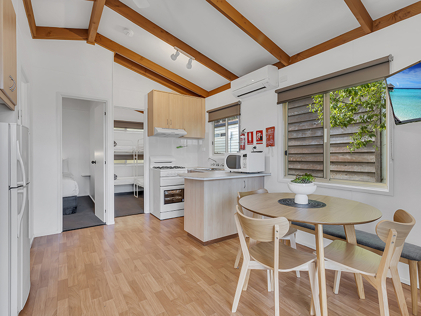 Experience a comfortable stay with a view of the pool. Our 2 Bedroom Poolview Villas sleep up to six guests with a queen bed in the main bedroom and two bunks in the second bedroom, as well as a bathroom, living area, kitchen, and private deck.