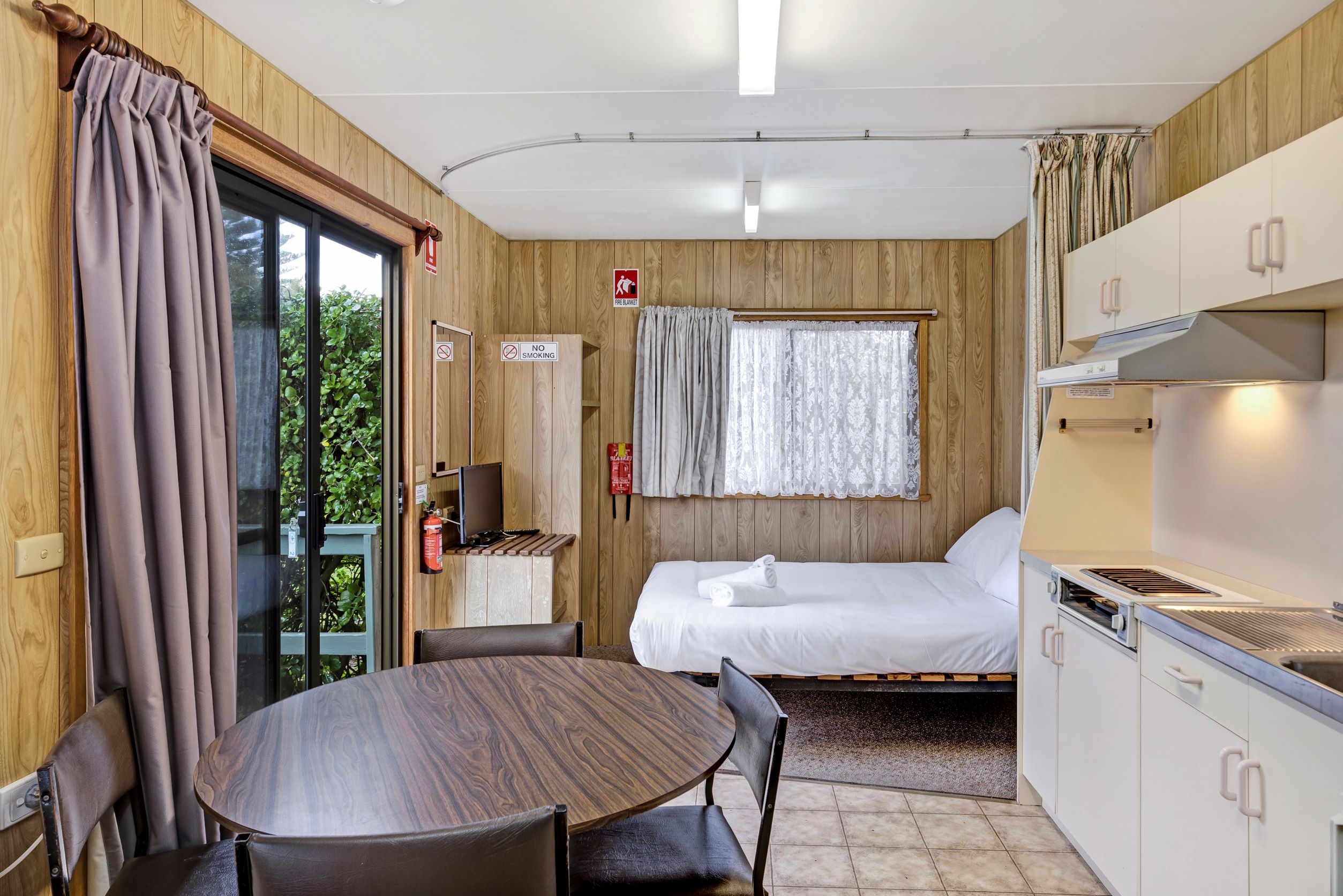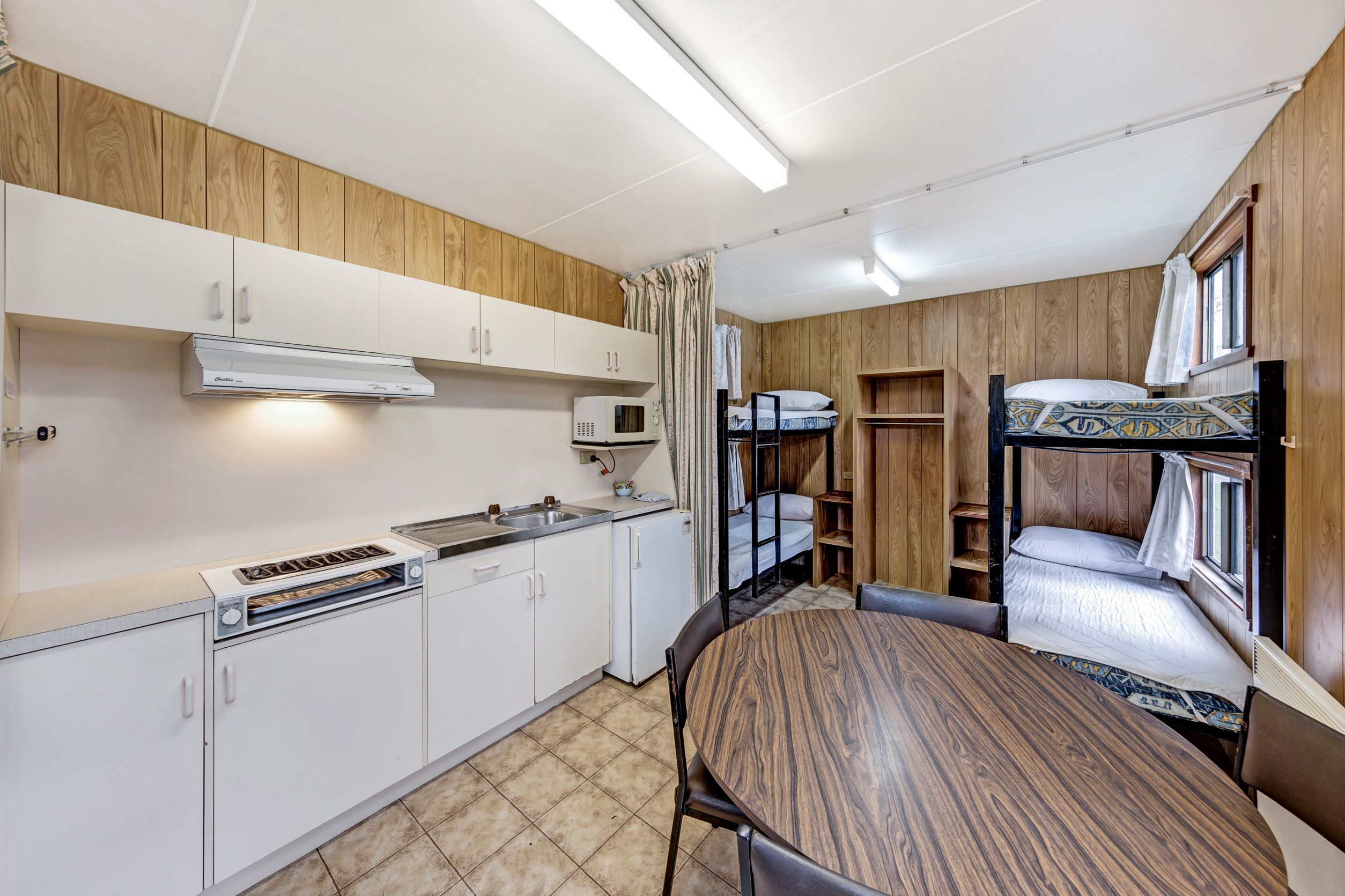 The Basic Shack at BIG4 Narrawong Island Holiday Park is an affordable open plan accommodation option for those seeking a simple yet comfortable stay. The interior features a compact living space with basic furniture, including a dining table and chairs, a small kitchenette with a microwave and a mini-fridge, and a comfortable bed and 2 sets of bunk beds for a good night's rest.