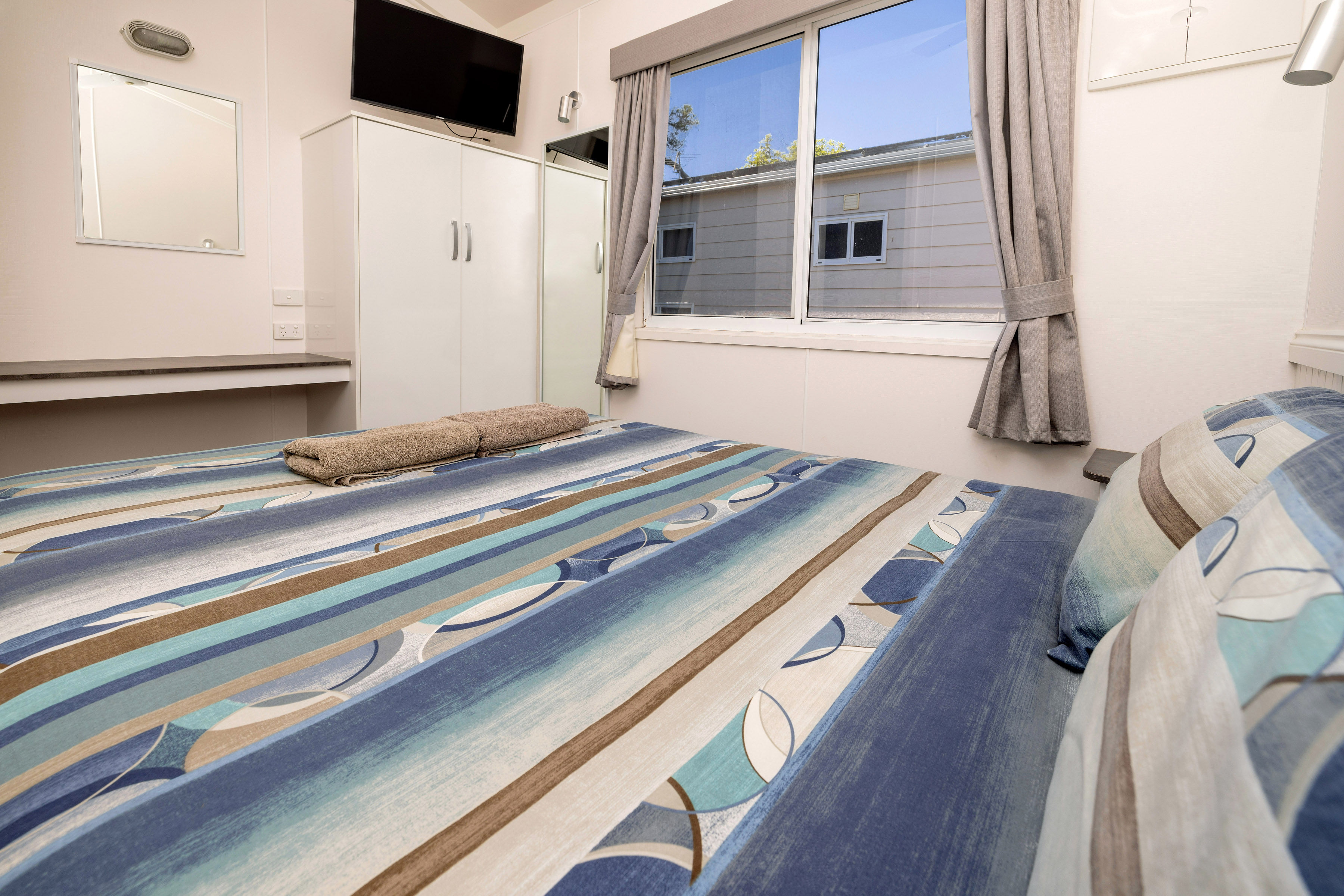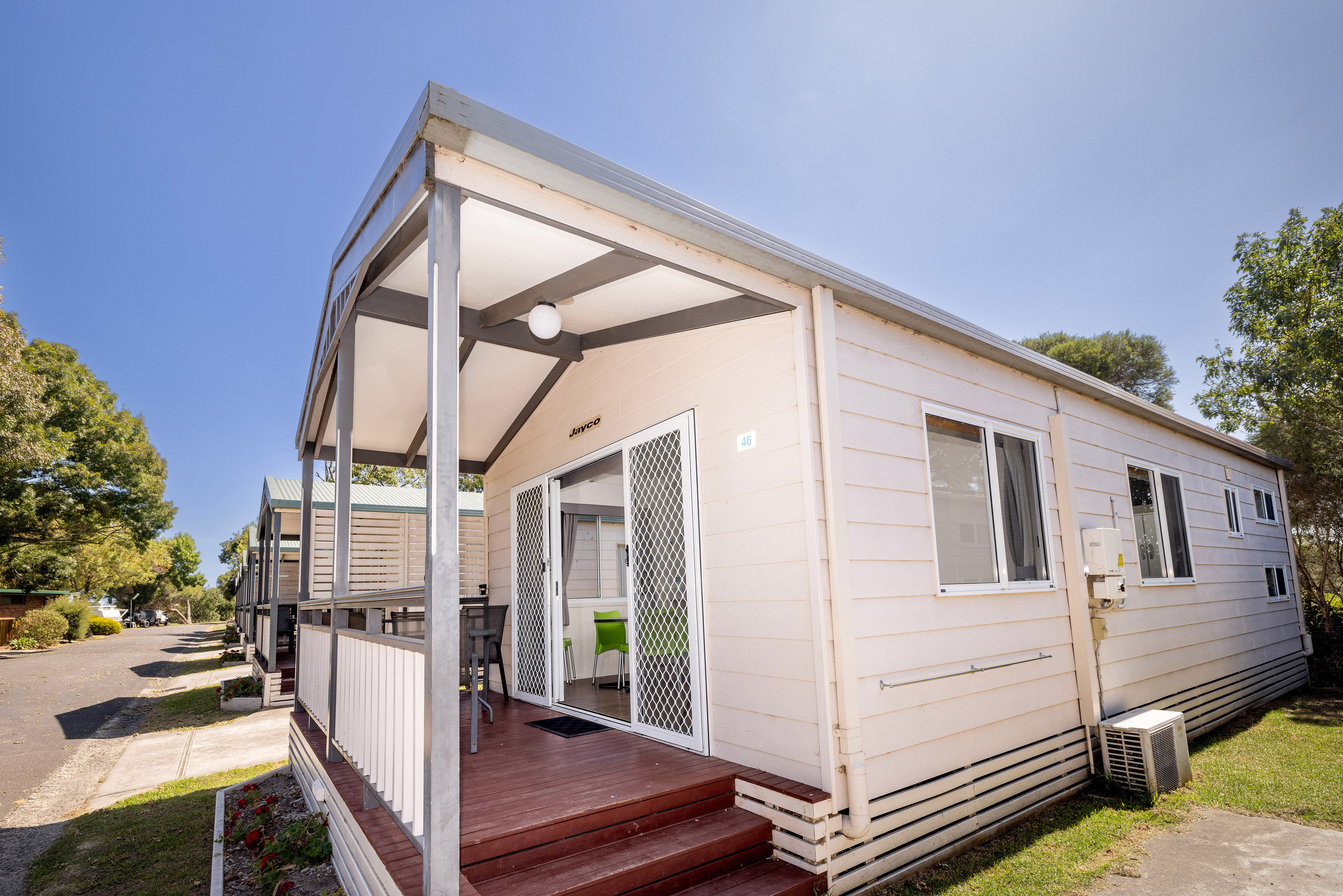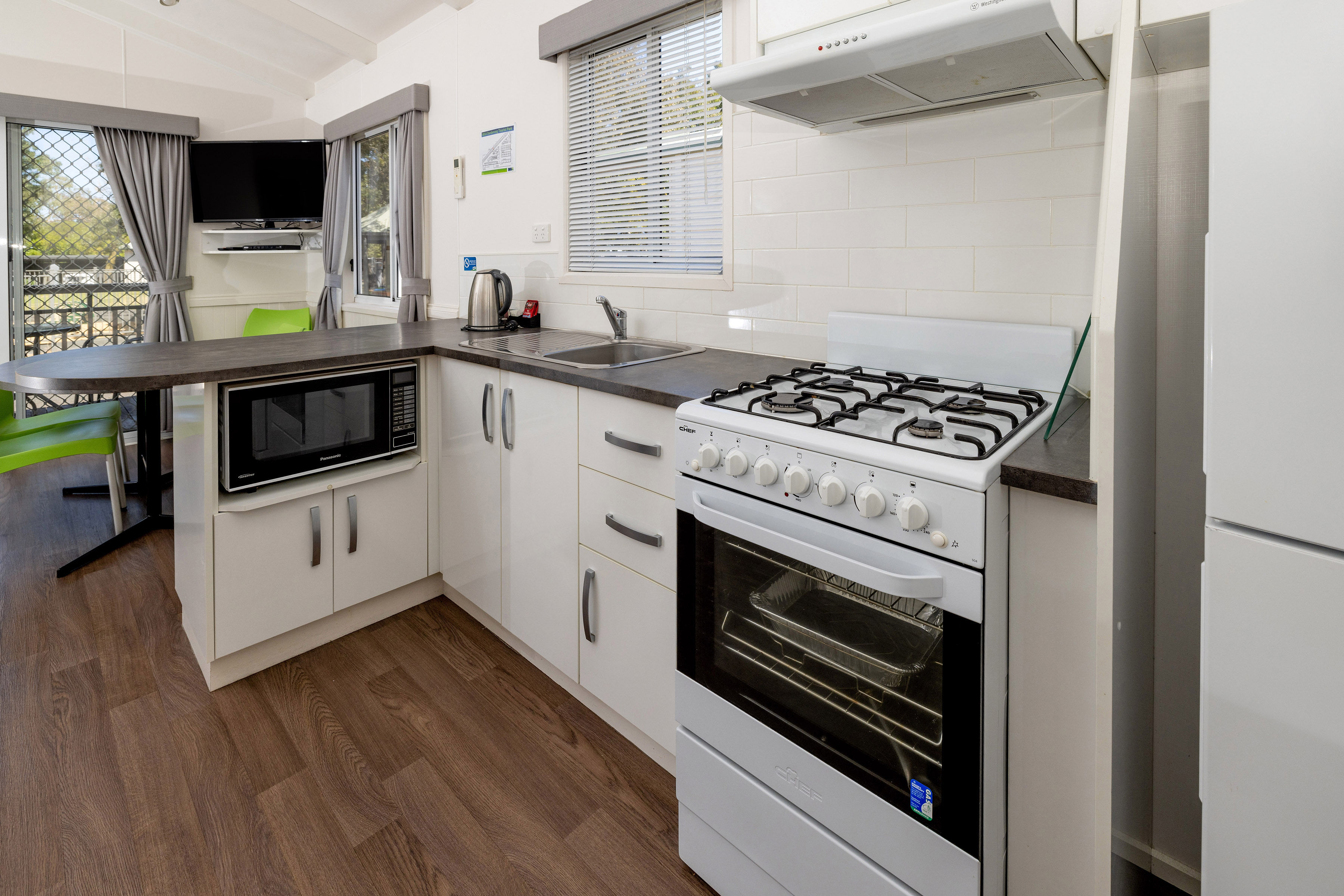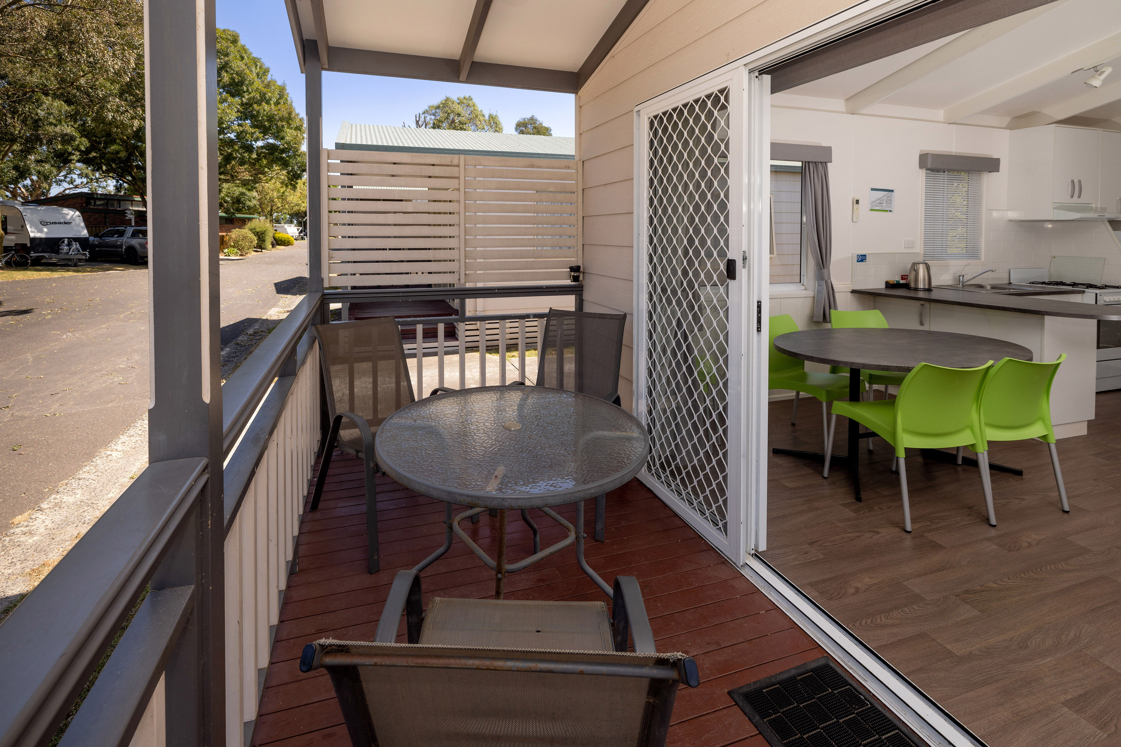 This modern 3 bedroom cabin is top-of-the-range. Main bedroom has comfy queen bed and the second and third have two double beds. Roomy living area with a huge modular lounge, large flat screen TV and DVD Player. Full kitchen/dining area with all cooking utensils and crockery supplied. Outdoor setting on verandah. Linen on all beds.