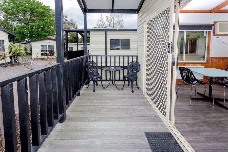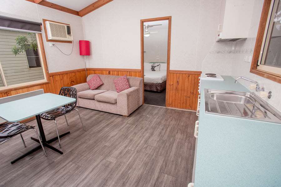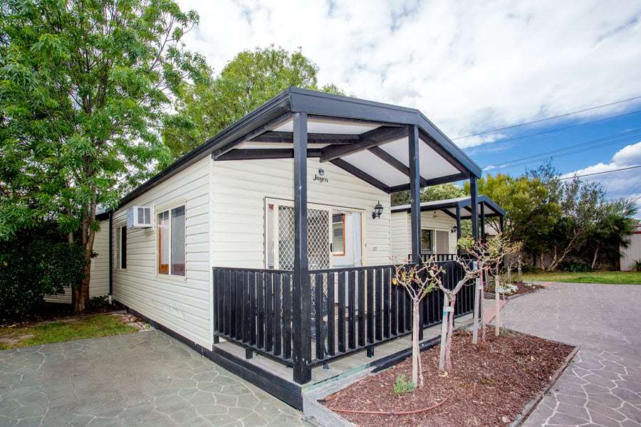 Offering you luxury, space and well appointed facilities together with large glass windows and a verandah. This cabin offers an abundance of natural light, and is situated in a landscaped court filled with standard roses and manicured gardens. There is a queen bed in a separate room with a television. The living area has a kitchenette, sofa, television. The bathroom has a shower, vanity and toilet. All bedding is provided including towels. The perfect retreat for a couple.