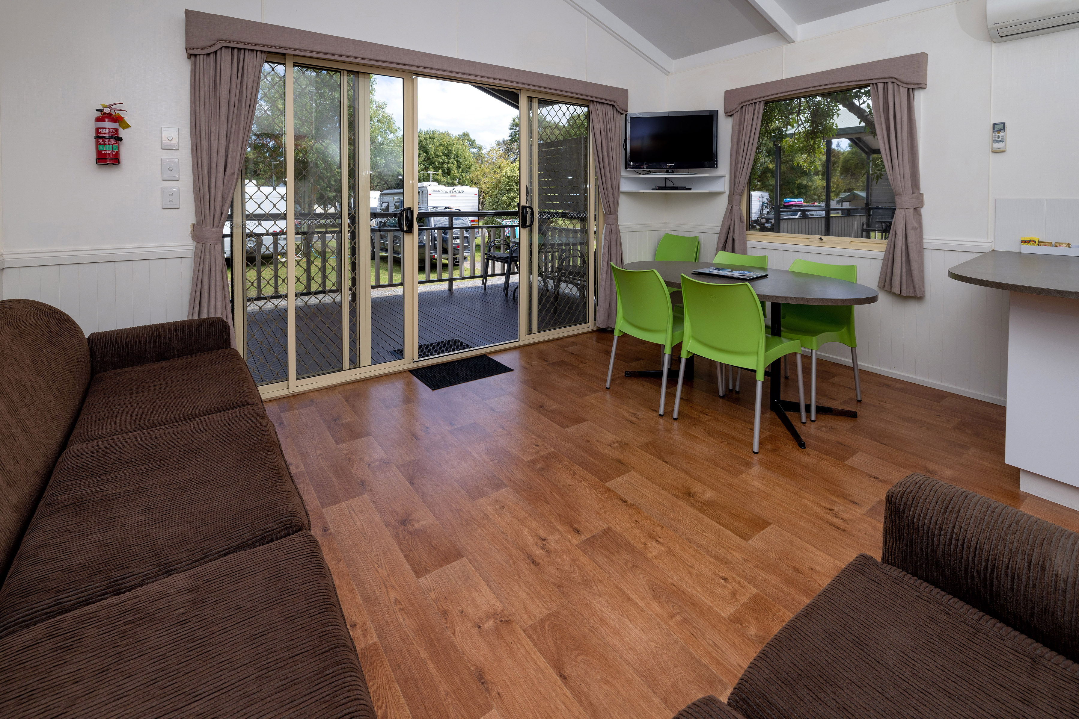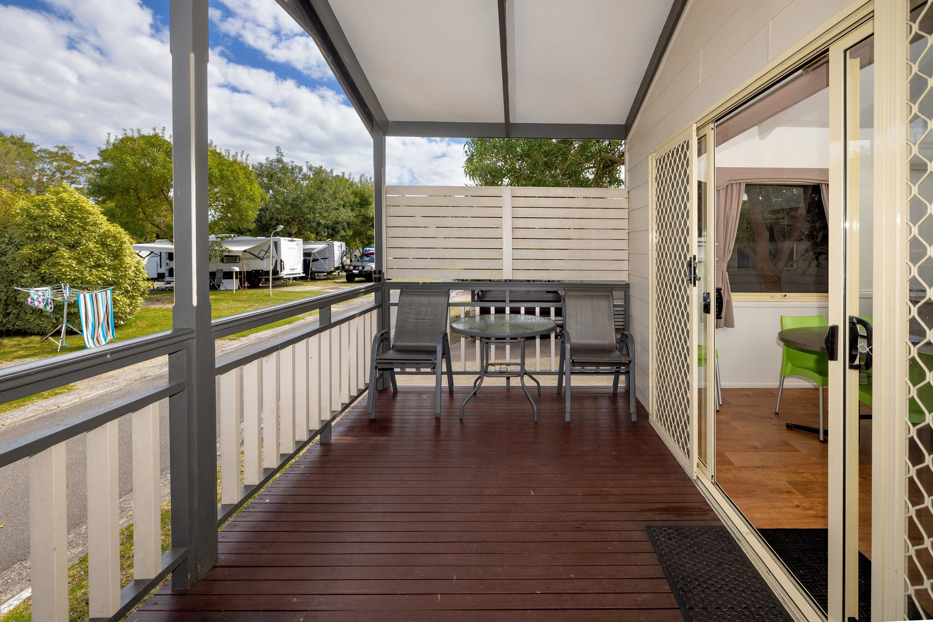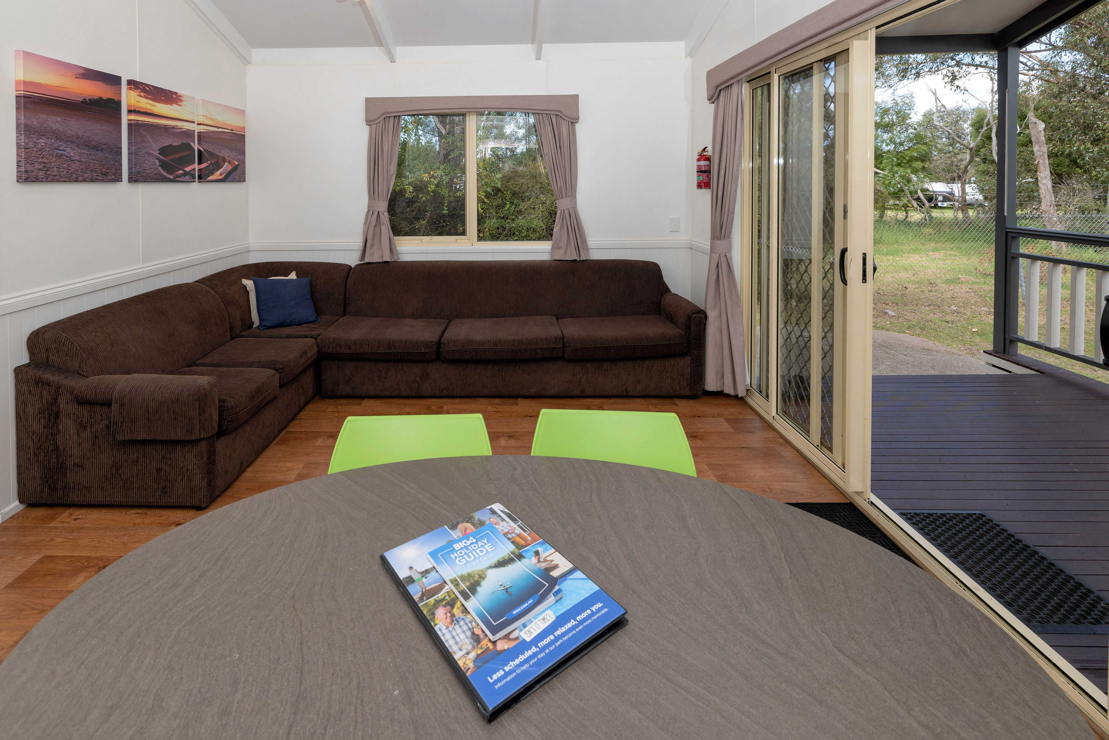 Ideal for families our newest cabins offer comfort, space and that home away from home feeling. They have a fully self contained kitchen with dining and living areas complete with a large modular lounge. Main bedroom has a Queen Size bed and the second and third bedrooms have a set of bunk beds with the option of folding up the bottom bunk to make room for a port-a-cot if needed. They contain a bathroom with separate toilet and a large deck with outdoor setting – Perfect for relaxing on those long summer nights *Complying with Australian Standards "Top bunks and elevated beds and are dangerous and are not recommended for children under the age of 9" Please take this into consideration when making your booking.