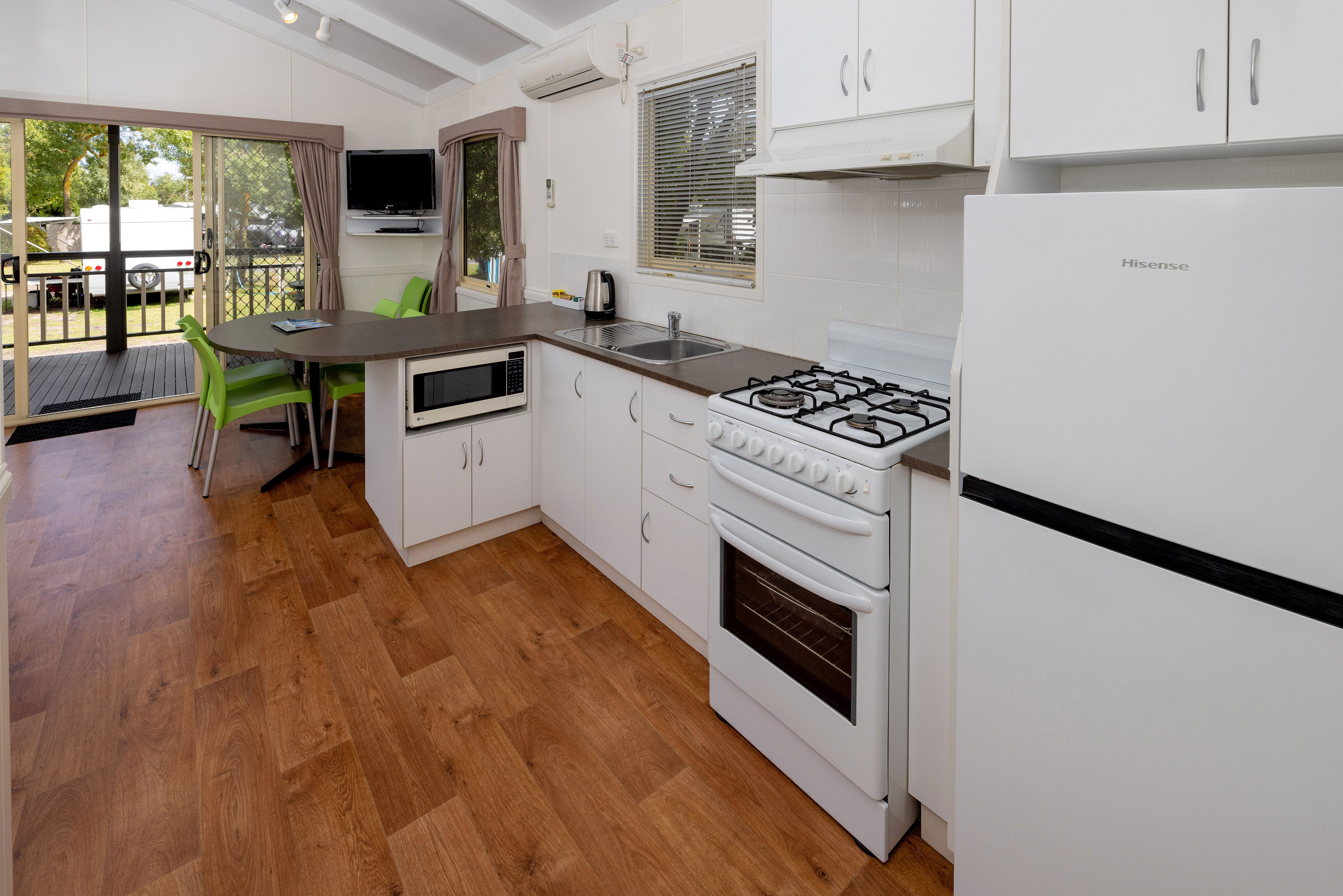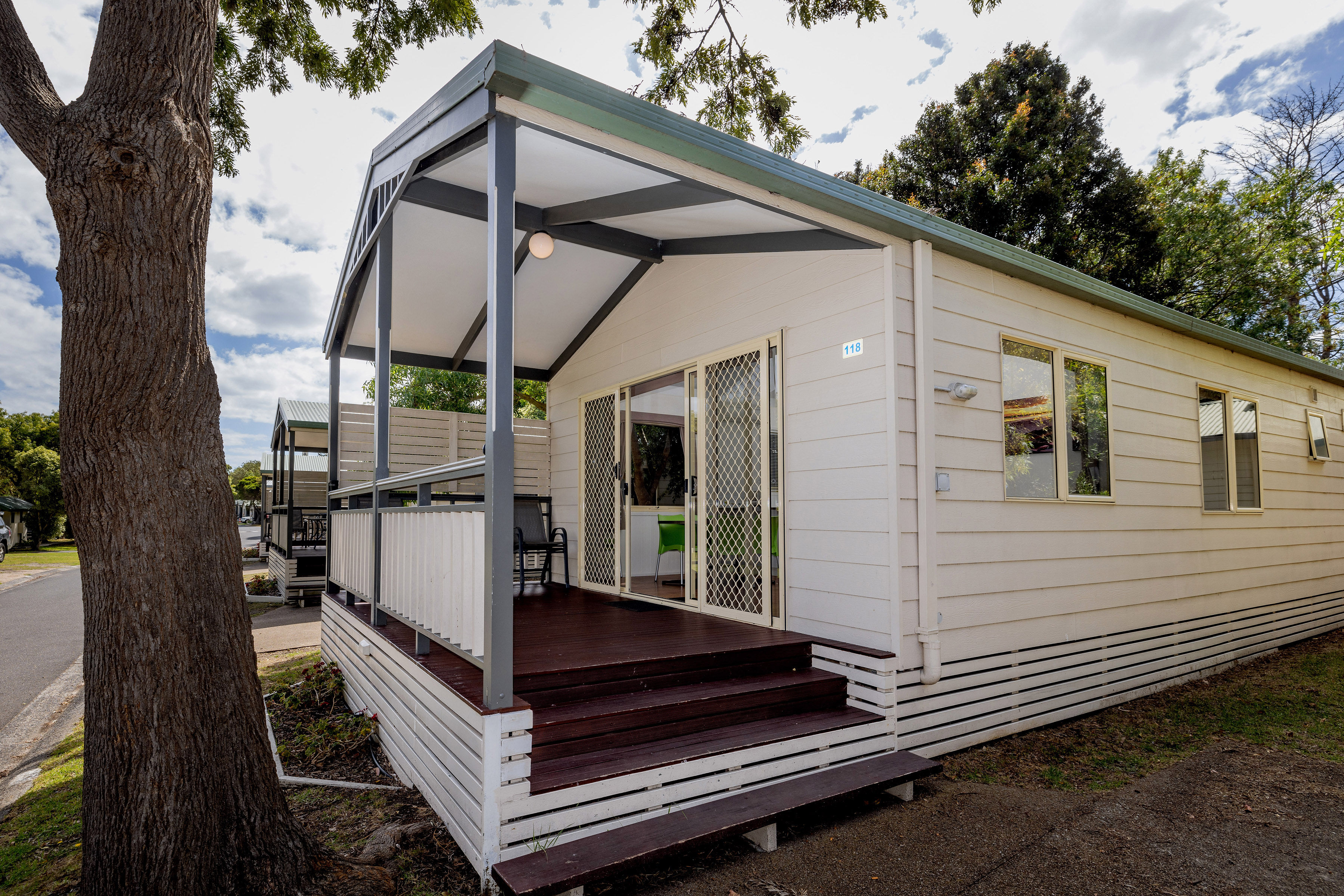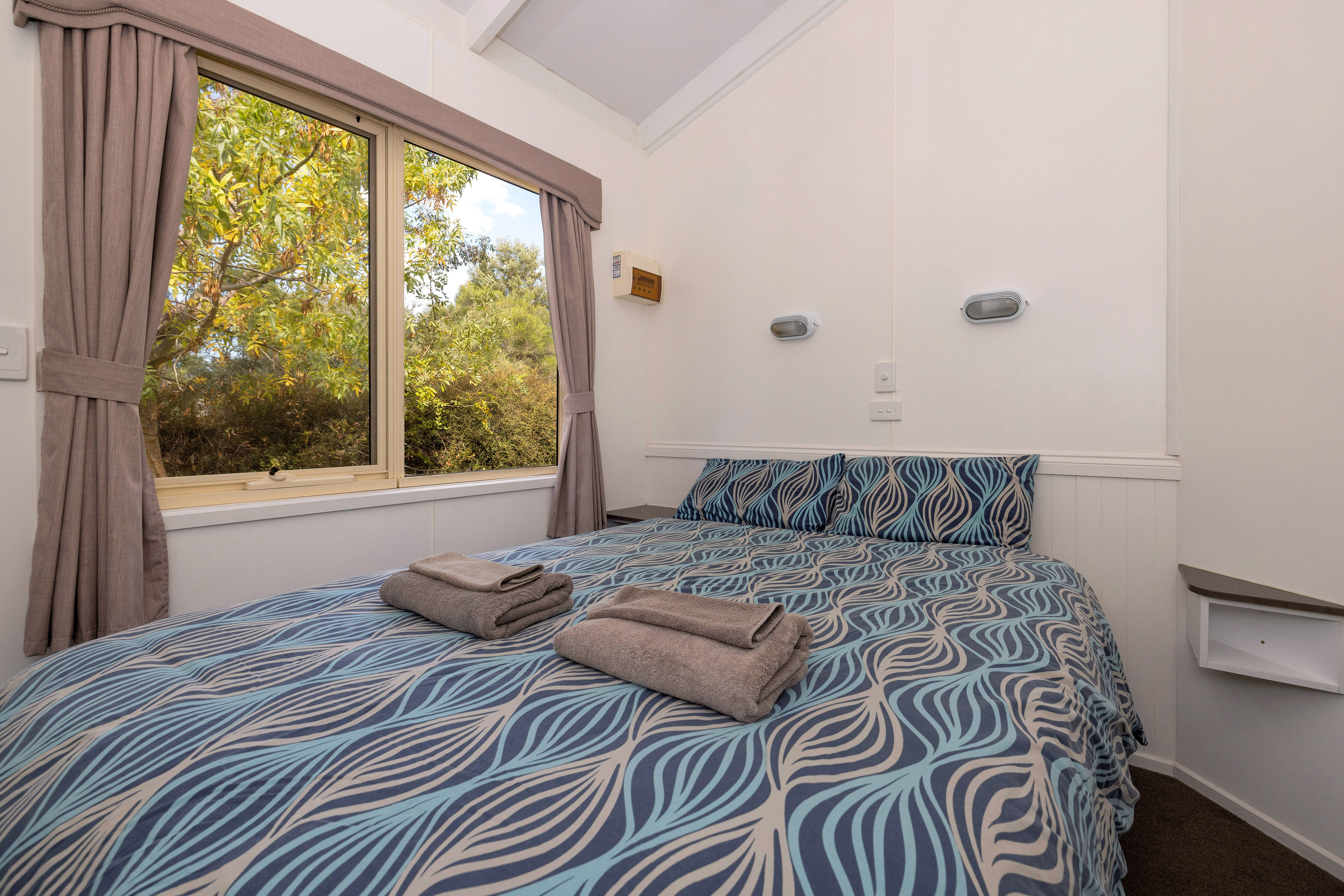 Ideal for families our newest cabins offer comfort, space and that home away from home feeling. They have a fully self contained kitchen with dining and living areas complete with a large modular lounge. Main bedroom has a Queen Size bed and the second and third bedrooms have a set of bunk beds with the option of folding up the bottom bunk to make room for a port-a-cot if needed. They contain a bathroom with separate toilet and a large deck with outdoor setting – Perfect for relaxing on those long summer nights *Complying with Australian Standards "Top bunks and elevated beds and are dangerous and are not recommended for children under the age of 9" Please take this into consideration when making your booking.