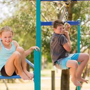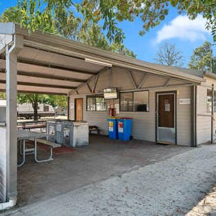 Our large camp kitchen area has a covered outdoor BBQ with picnic tables/seats for 6-8 people. Inside, the camp kitchen has a 4-burner gas cooktop, griller, microwave, toaster, kettle and large fridge, combination table and seating for 12-16 people. All combined with the games room next door. Our swimming pool has pool chairs and shade for the hottest part of the day. A second BBQ area, children's playground is located at front of the park.