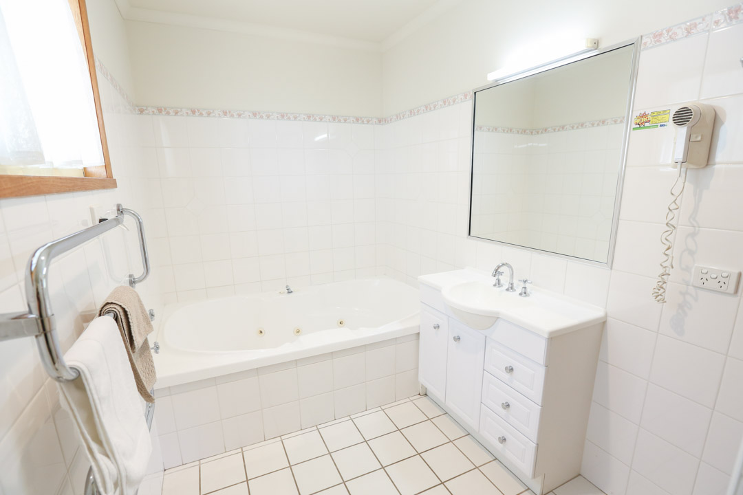 The large bathroom is beautifully equipped with a spa bath perfect for unwinding in after a busy day of exploring our beautiful region.