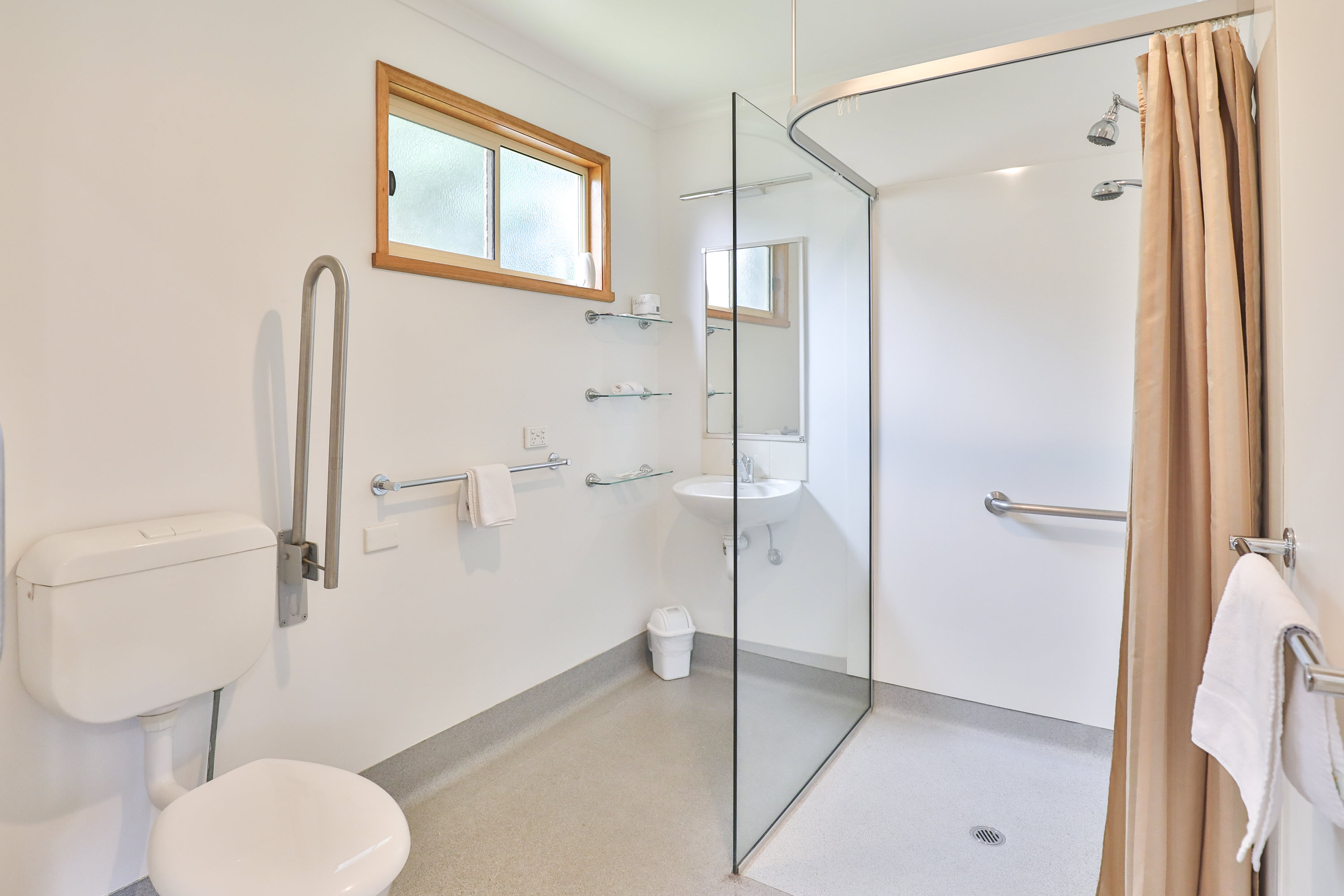 This unit has been specifically designed for easy access via wheelchair, with ramp & level entry. All rooms are spacious allowing easy wheelchair movement, except for bunk room. Bathroom has grab rails, shower level floor surface - free of any steps. (Shower chair provided). All fittings in bathroom, main bedroom & living area can be accessed from a seated position.