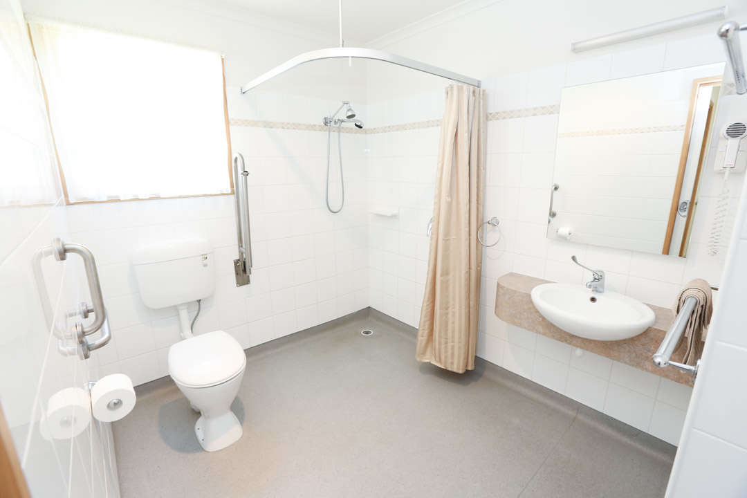 This unit has been specifically designed for easy access via wheelchair, with ramp & level entry. All rooms are spacious allowing easy wheelchair movement, including bedrooms. Bathroom has grab rails, shower level floor surface - free of steps. (Shower chair provided on request). All fittings throughout unit can be accessed from a seated position.