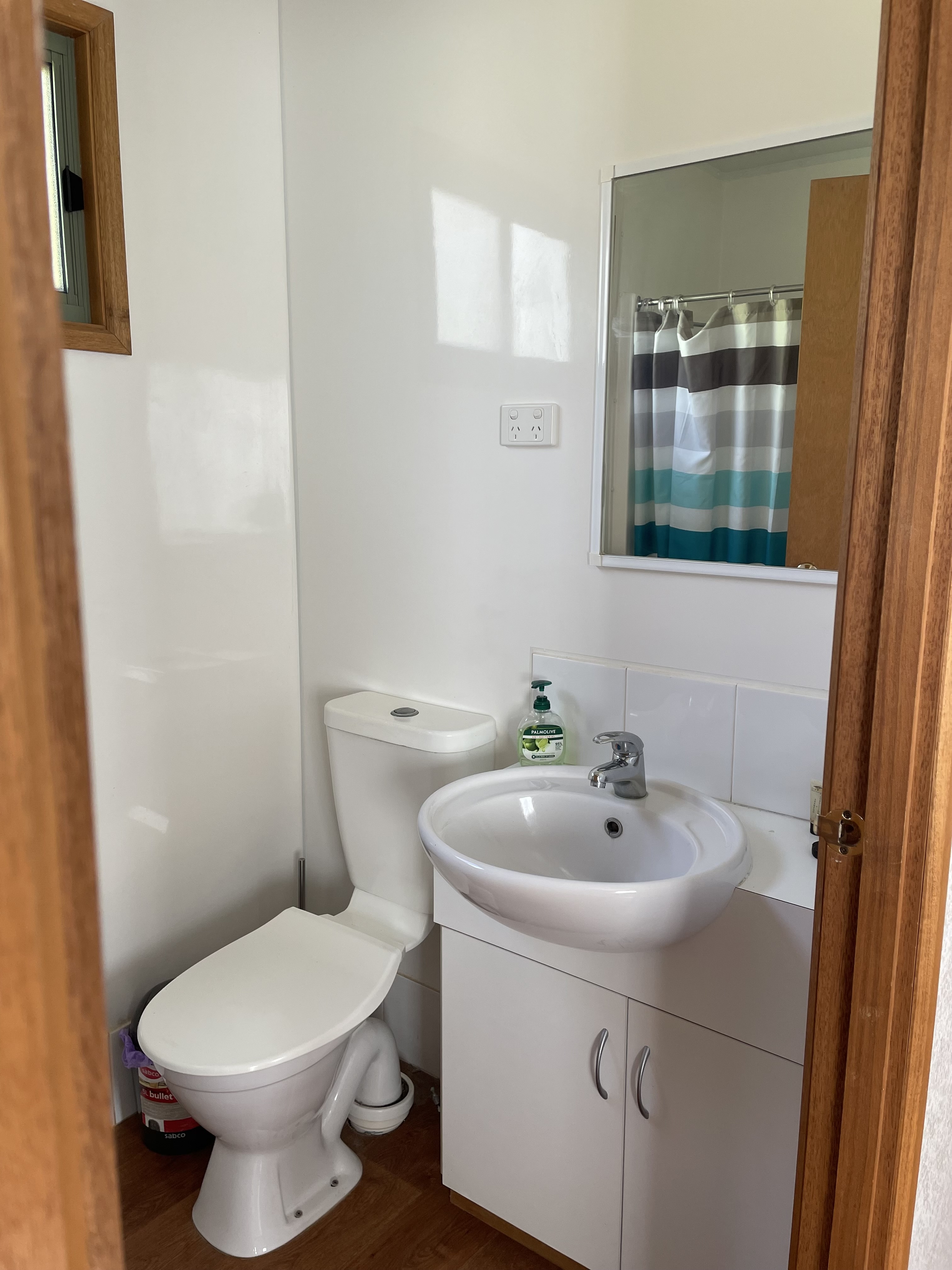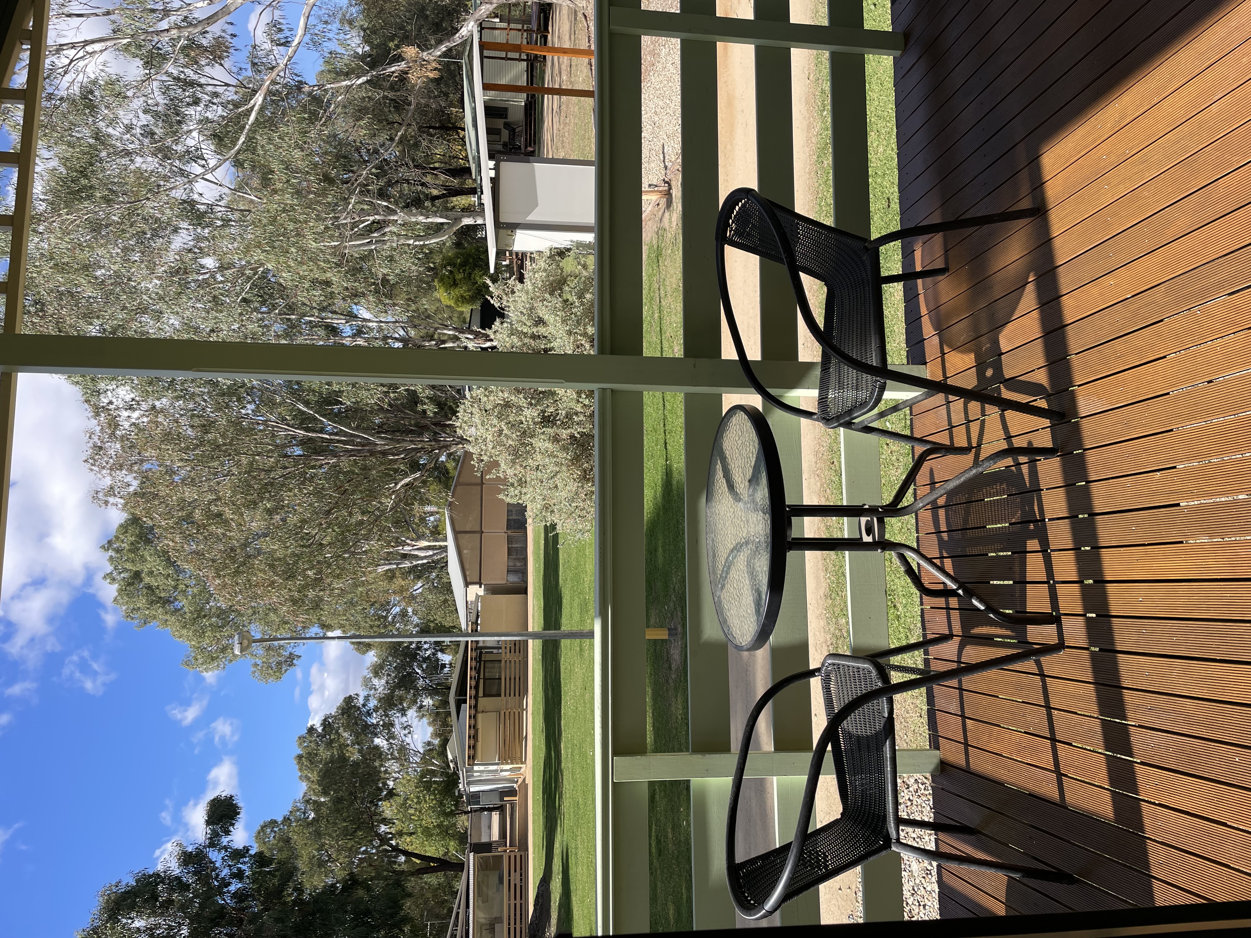 This cabin has its own kitchen, lounge & dining area along with a bathroom, and a small front balcony area with a BBQ and table setting.